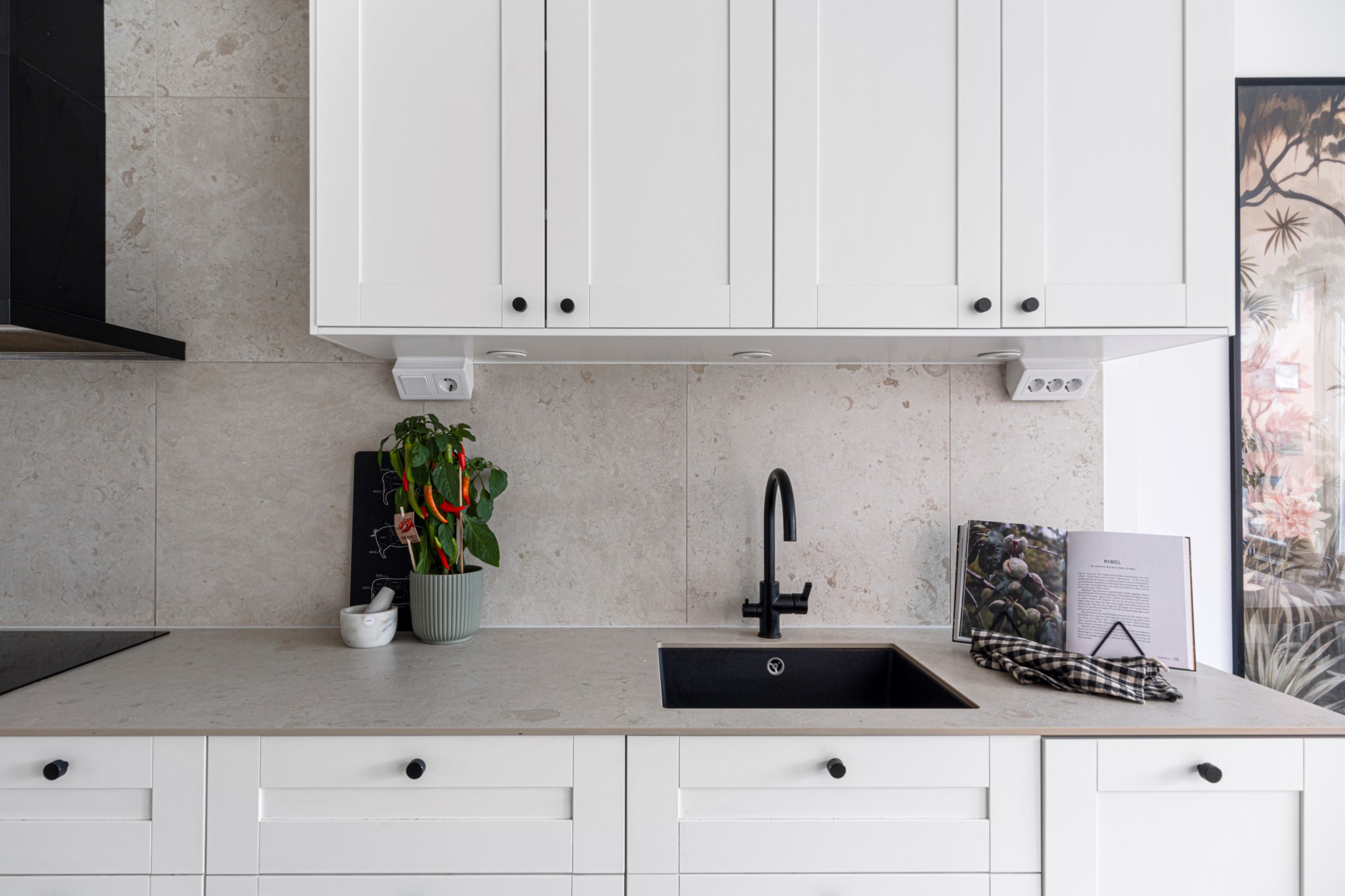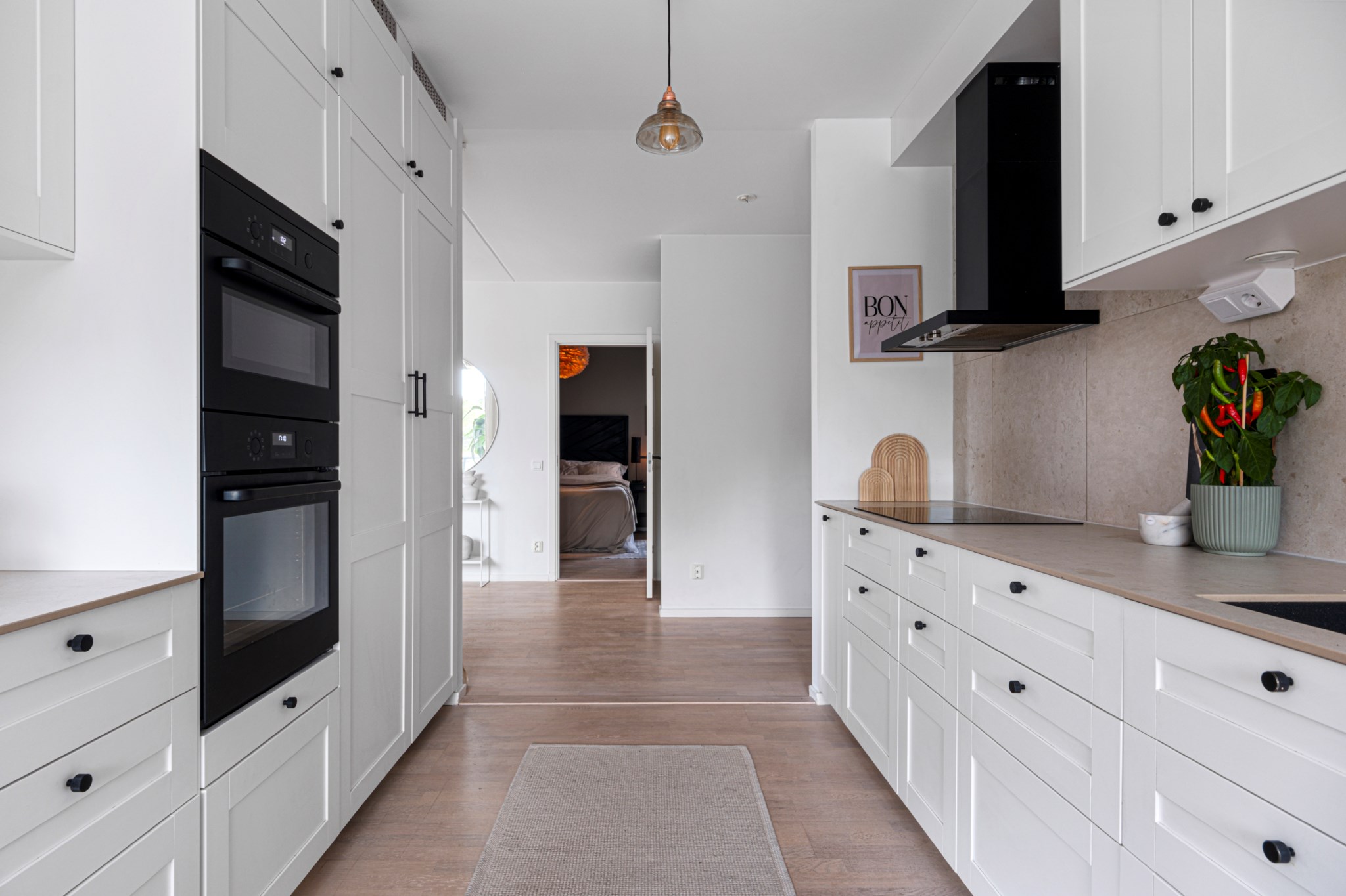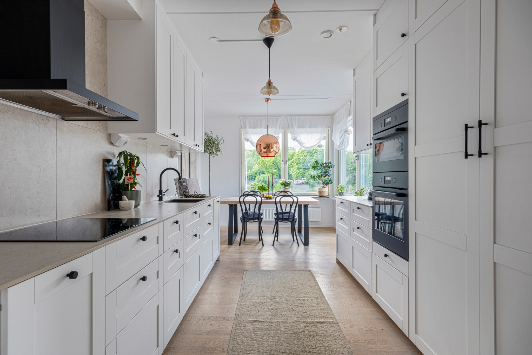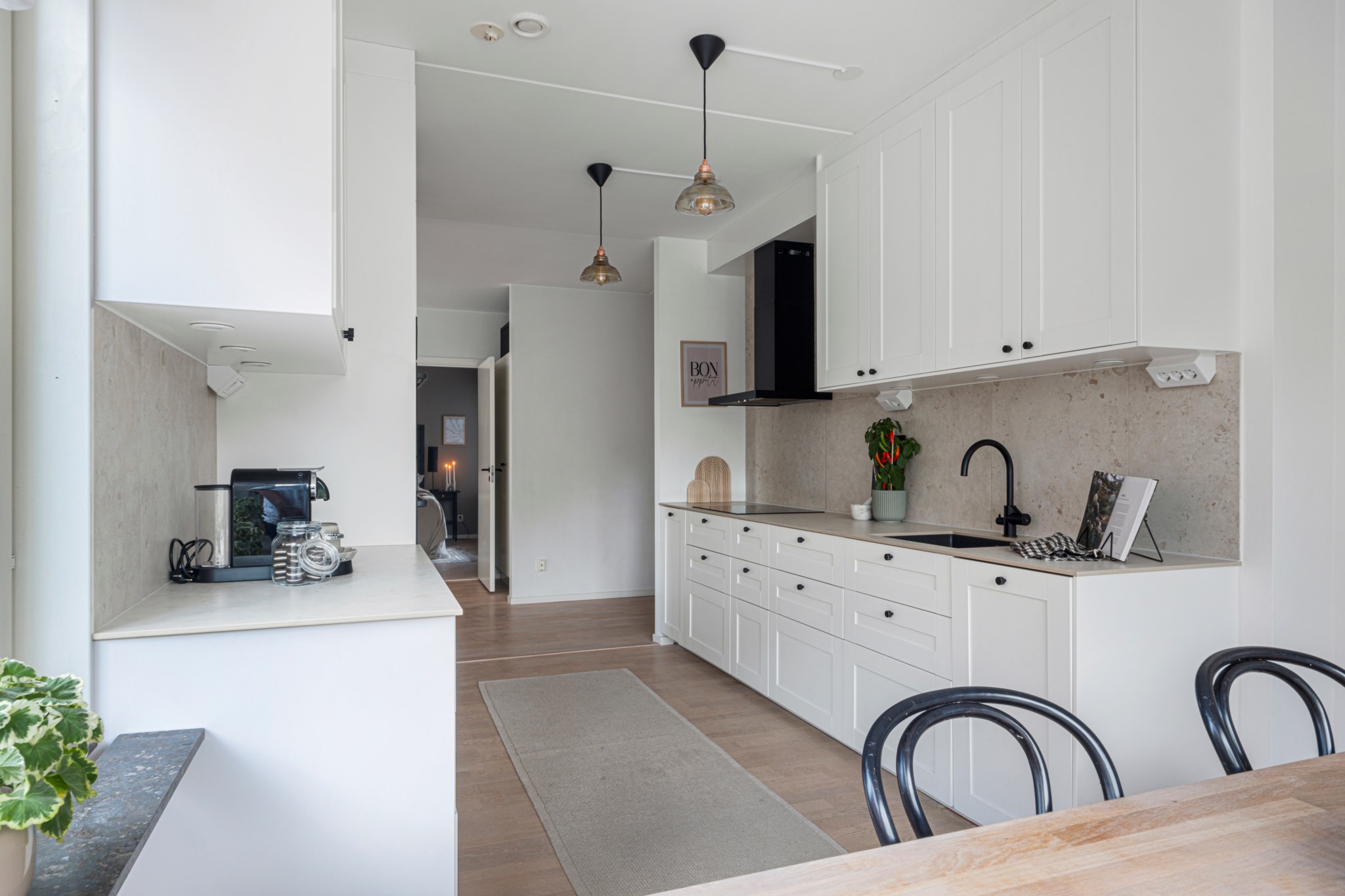Stilrent renoverat kök med stor matplats bjuder på snygga färgval och goda arbetsytor. Kökets matplats ligger i gavel med fönster i två olika väderstreck. Snygga skåpluckor med och en snygg arbetsbänk i kvarts komposit. Kökets maskinella utrustning består av inuduktionshäll, ugn, fläkt samt hel kyl och frys och integrerad diskmaskin.