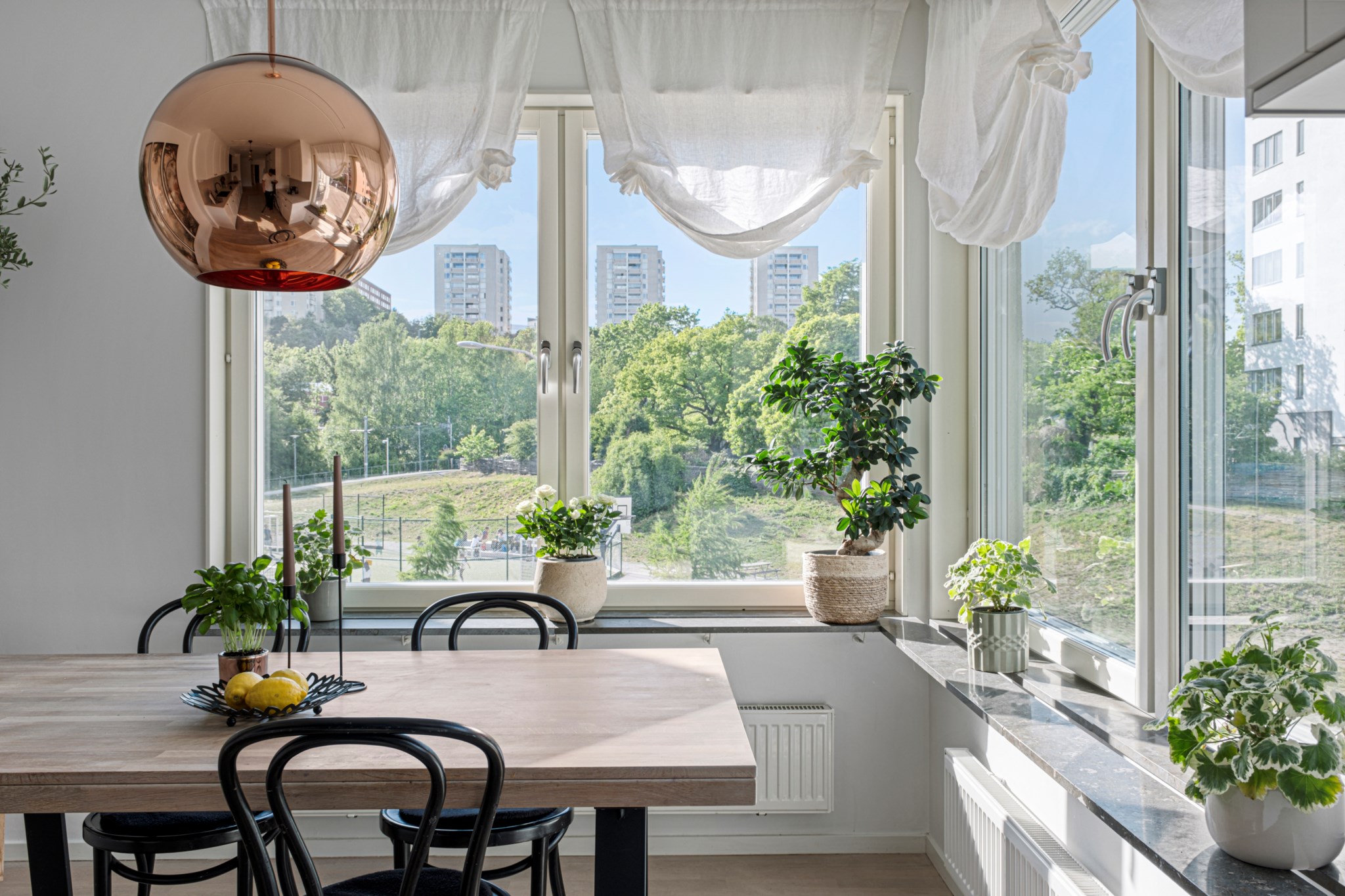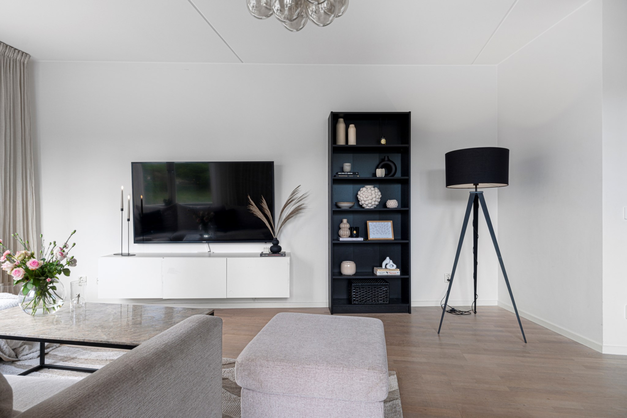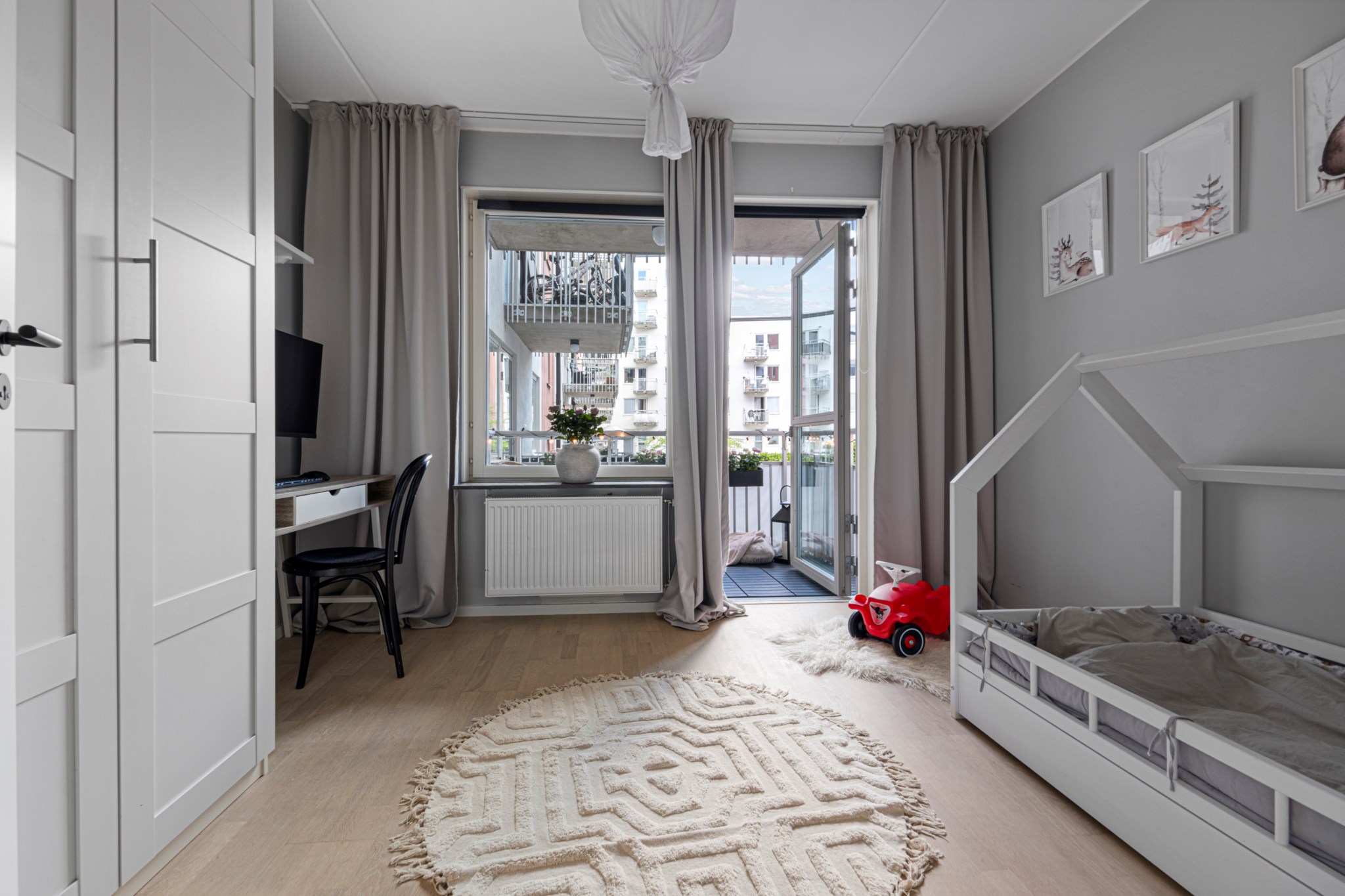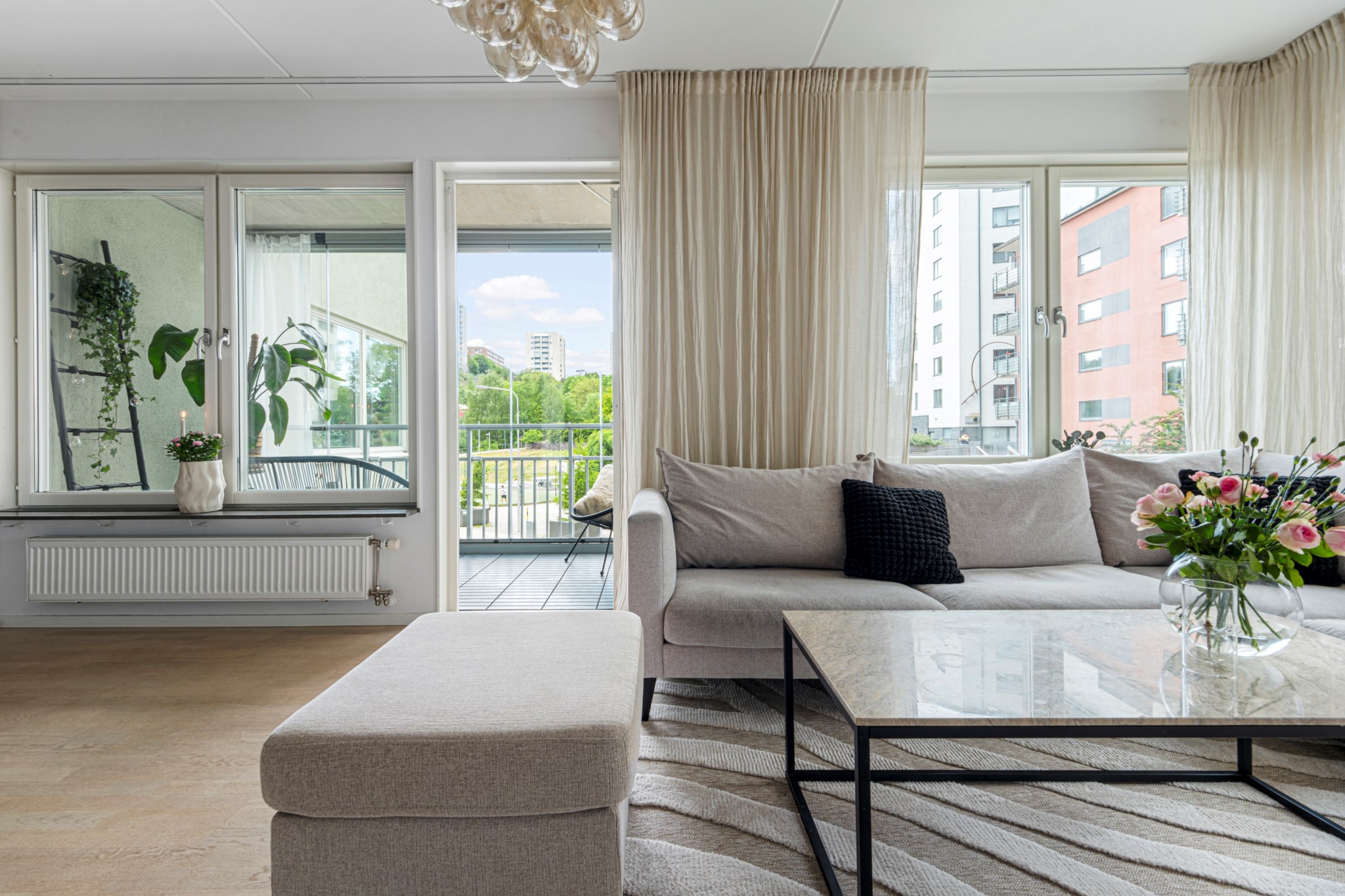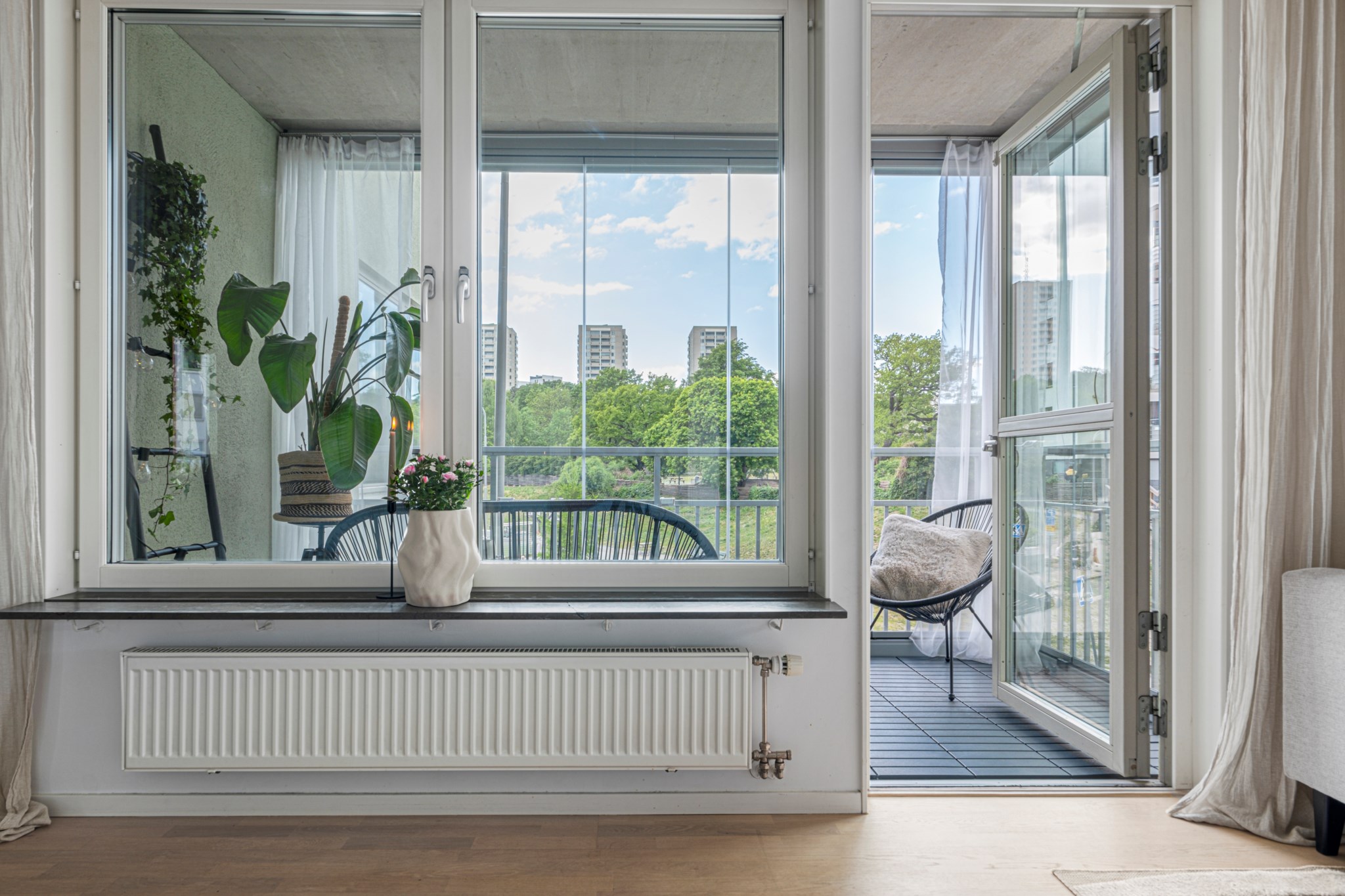 Den stora inglasade balkongen i västerläge blir en naturlig förlängning av vardagsrummet. Här njuter du av solens varma strålar. Plats finns för både loungemöbler och växtligheter, vilket gör detta till en idealisk plats för både avkoppling och umgänge.