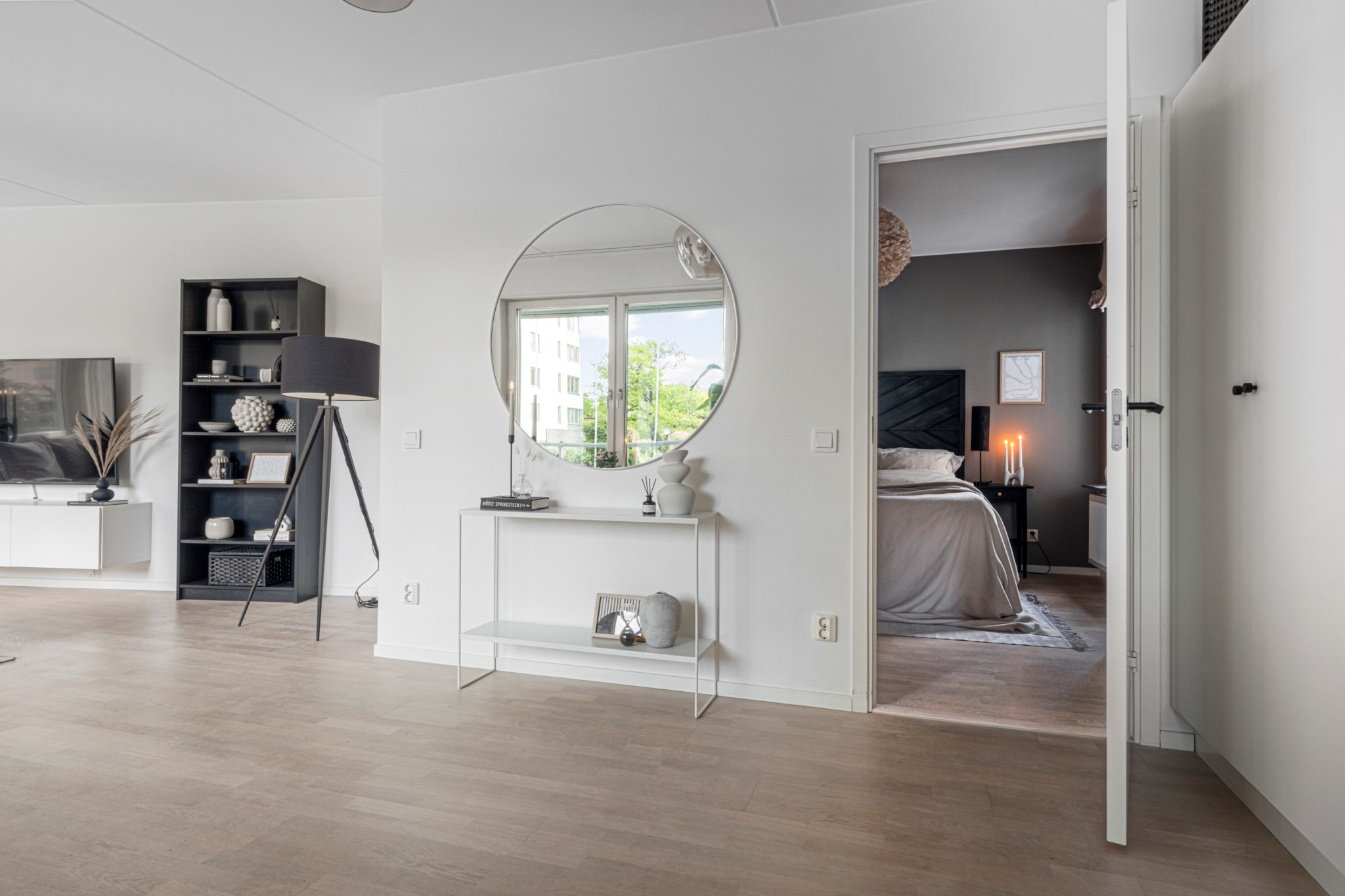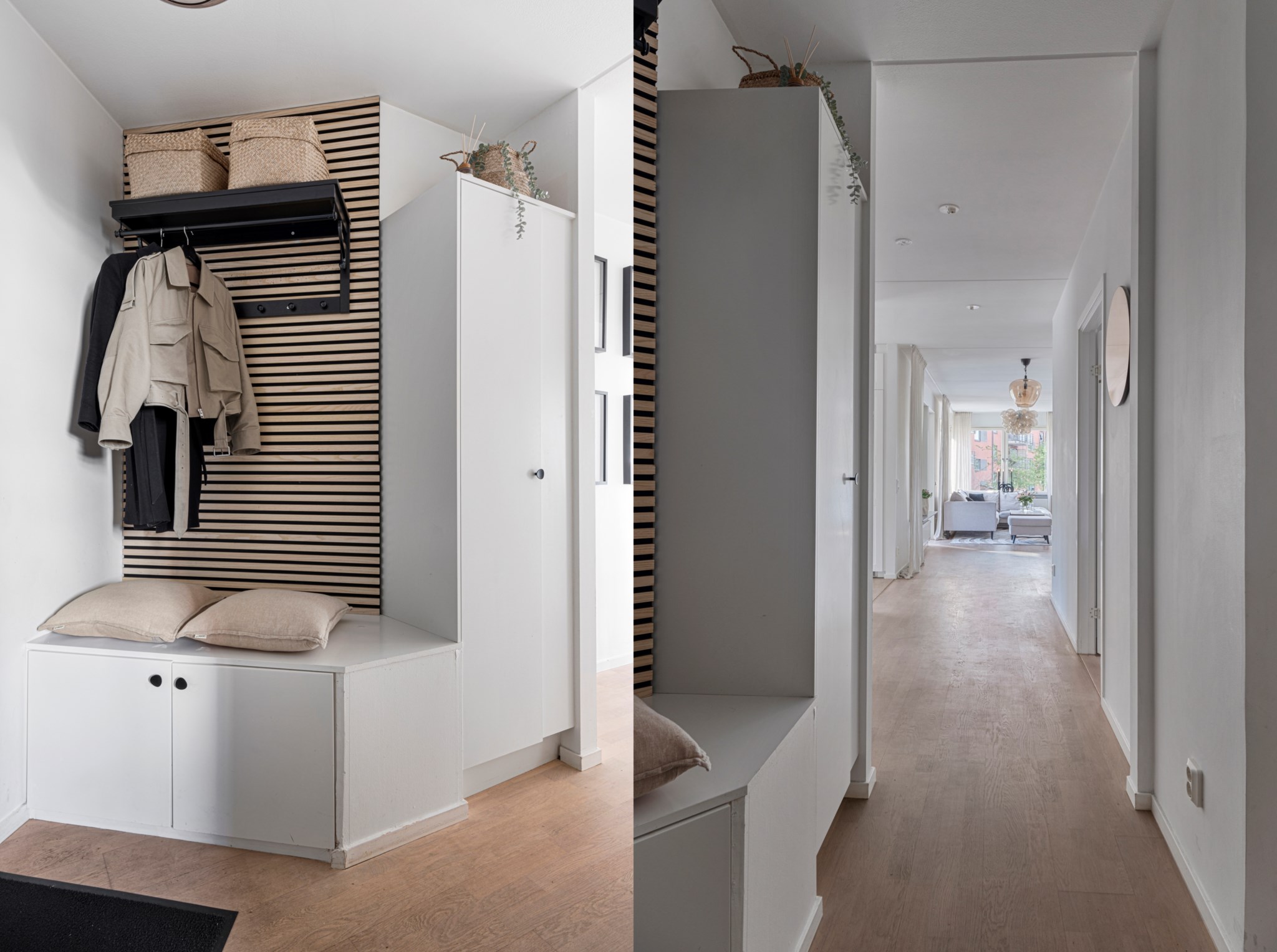 Genom ljudisolerande säkerhetsdörr når du en mycket välkomnande och renoverad hall med goda avhägningsmöjligheter. På golvet ligger en vacker ekparkett som är genomgående i hela bostaden.