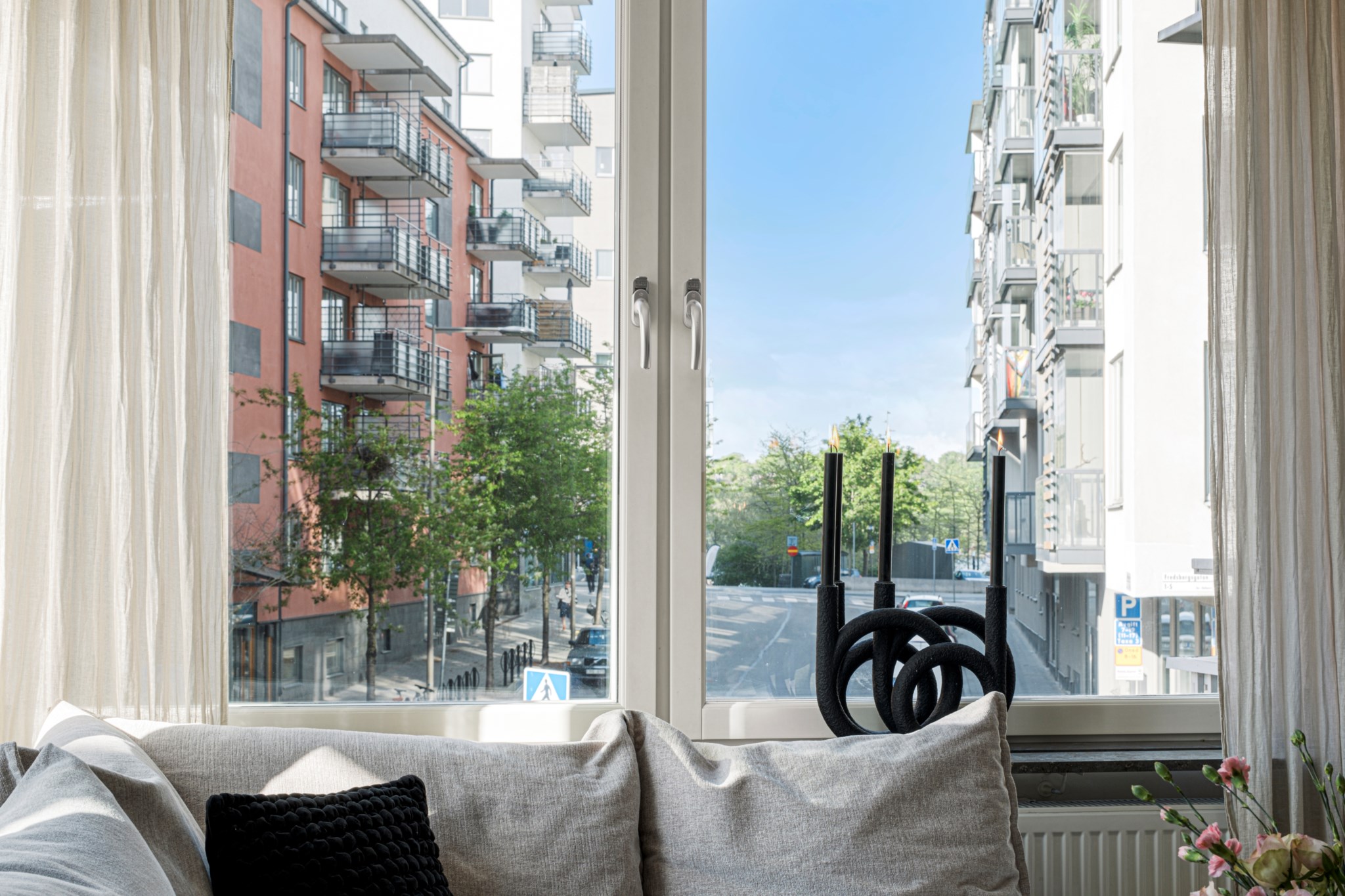 Från det ena sovrummet nås bostadens andra balkong, en mer avskild plats med utsikt över den grönskande innergården. En perfekt plats för morgonkaffet eller en lugn stund med en bok. Det är sol ca 11:00-13:30 på balkongen.