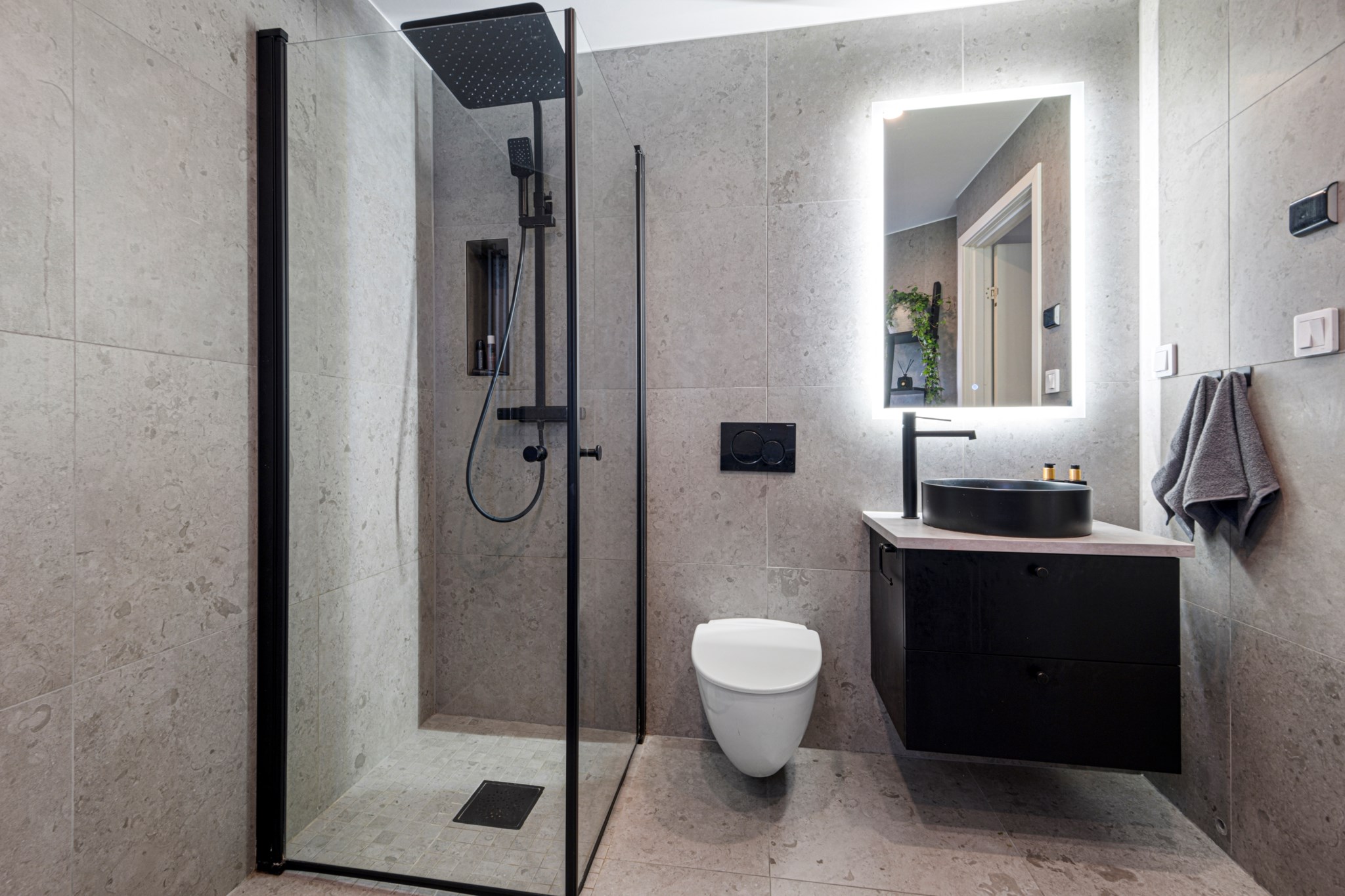 Smakfullt renoverat badrum med grå stenplattor som ger ett sobert och enhetligt intryck. Duschhörna med glasvägg och svarta detaljer, tak- och handdusch i mattsvart finish samt väggmonterad wc med dold cistern.