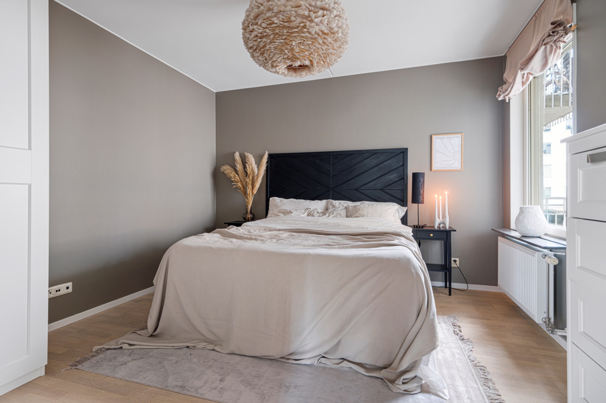 Det större sovrummet är en fridfull plats där lugnet råder. Här finns gott om plats för dubbelsäng med tillhörande möbler och goda förvaringsmöjligheter.