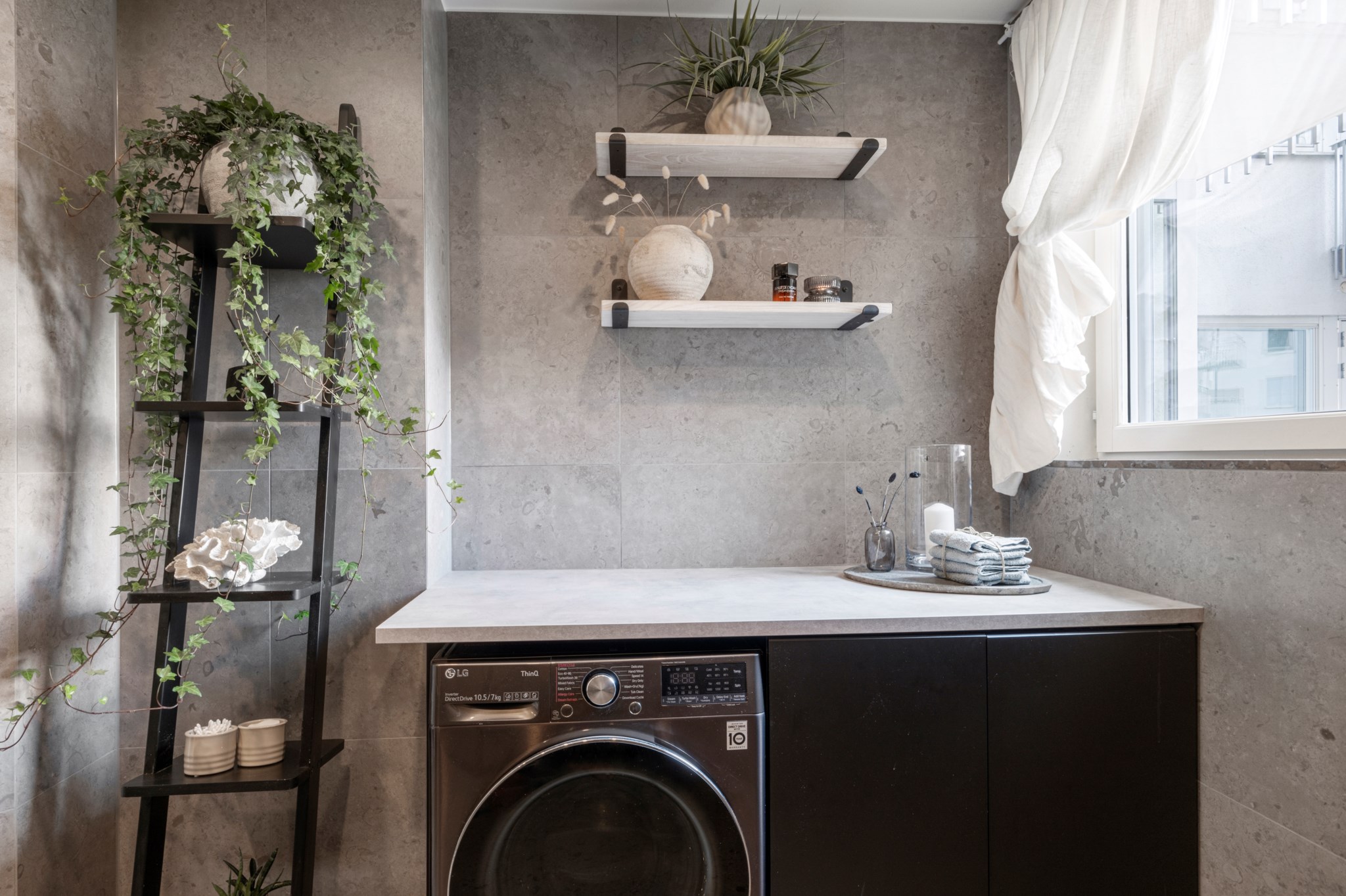 Elegant kommod i svart med rund tvättställ och spegel med inbyggd LED-belysning ger både stil och funktion. Intill finns en välplanerad tvättdel med tvättmaskin, arbetsyta och fina förvaringslösningar. Ett stort fönster ger rummet ett härligt ljusinsläpp och skapar en harmonisk atmosfär.
