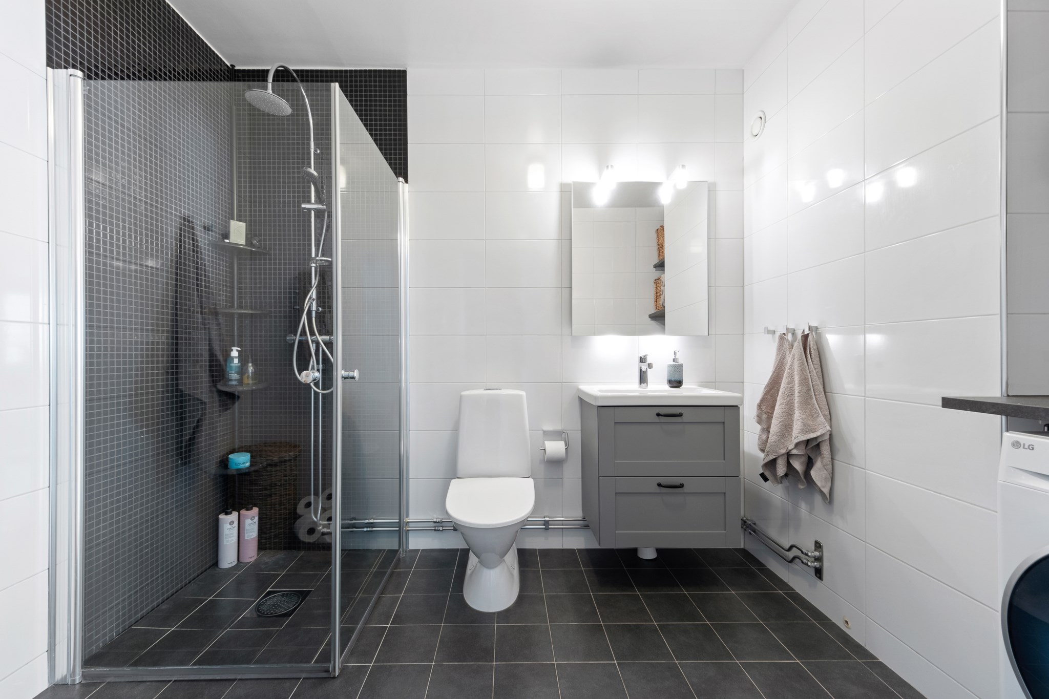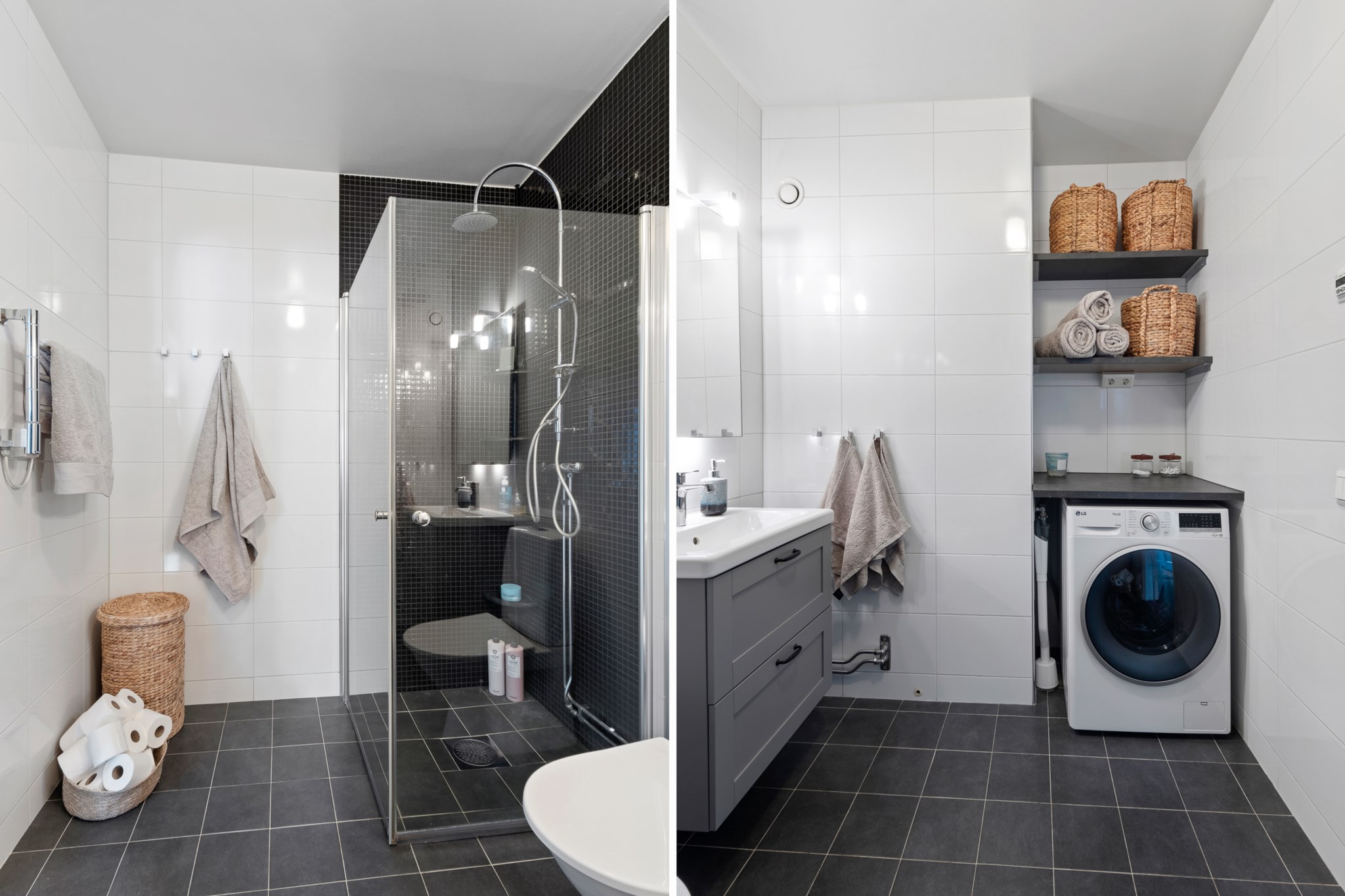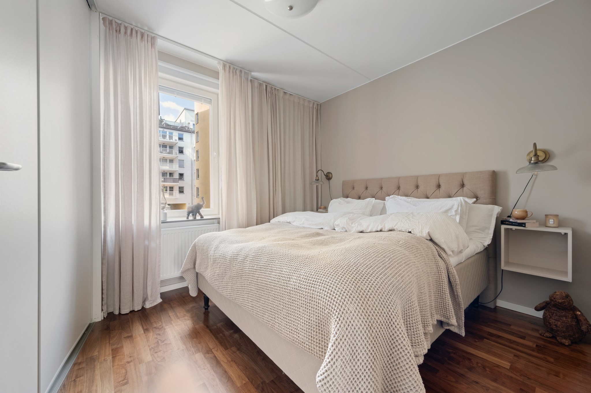 Sovrummet är rofyllt beläget mot den lugna innergården och rymmer enkelt en dubbelsäng. Förvaringsmöjligheterna är generösa tack vare flera skjutdörrsgarderober. Badrummet är helkaklat och elegant med dusch, wc kommod och en praktisk tvättdel utrustad med kombinerad tvättmaskin/torktumlare, hyllor och arbetsbänk, allt för att förenkla vardagen.