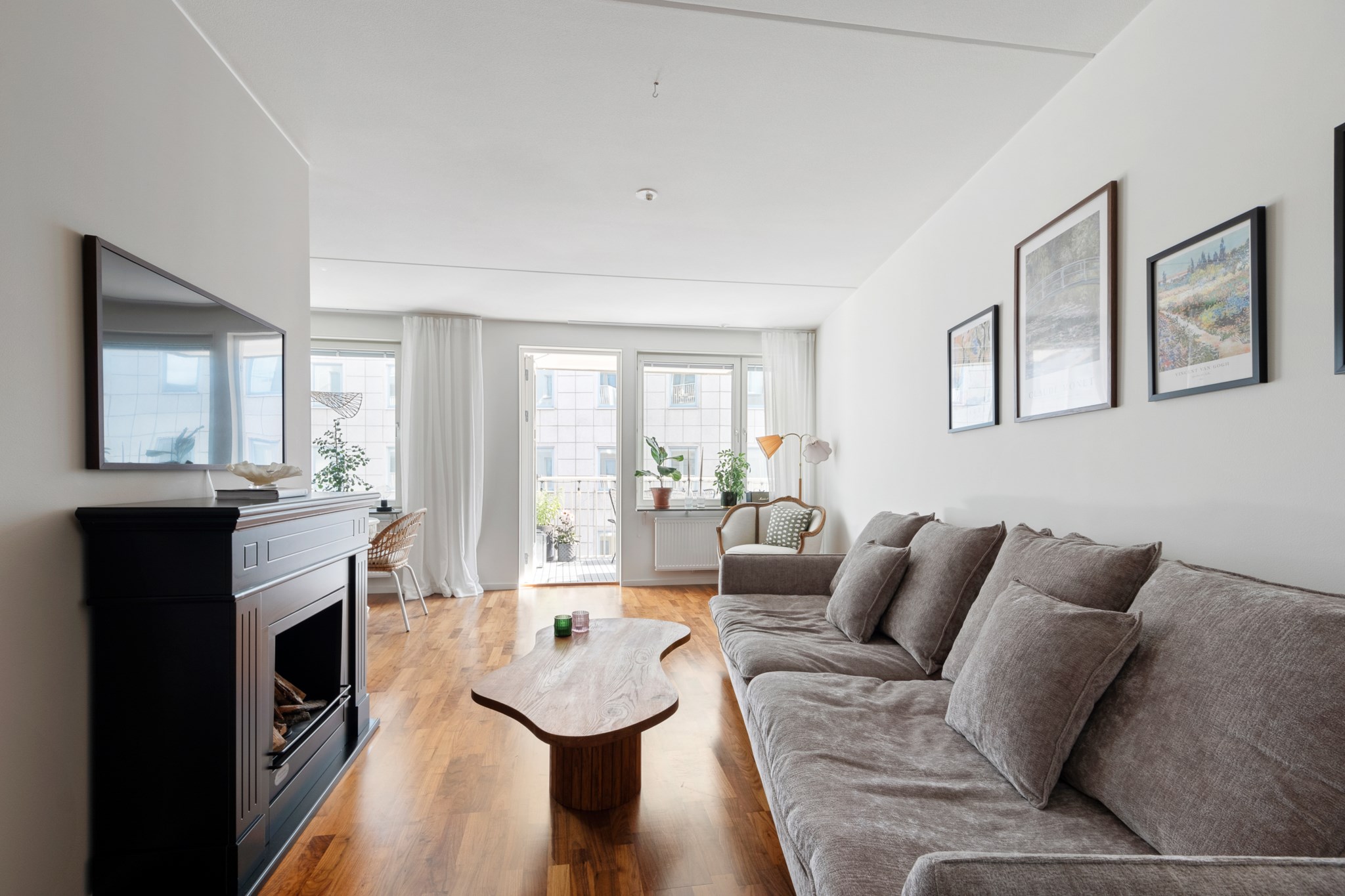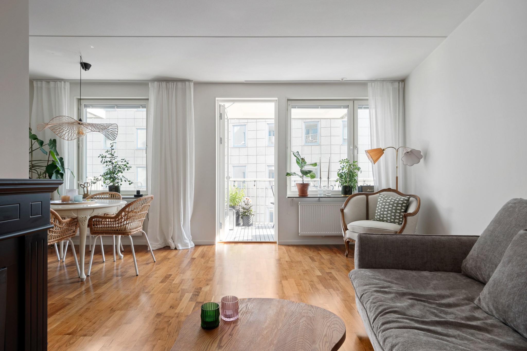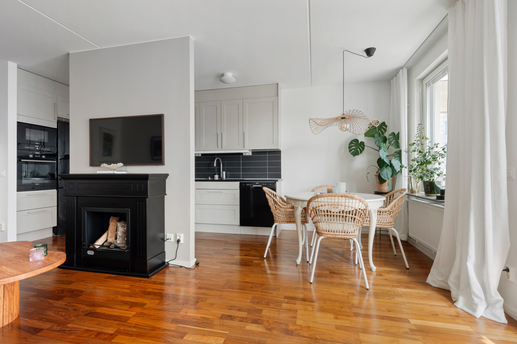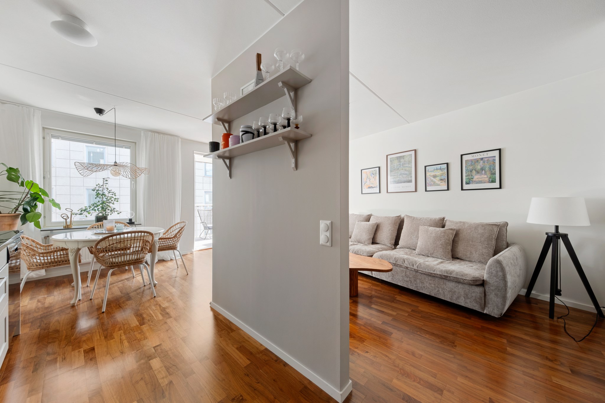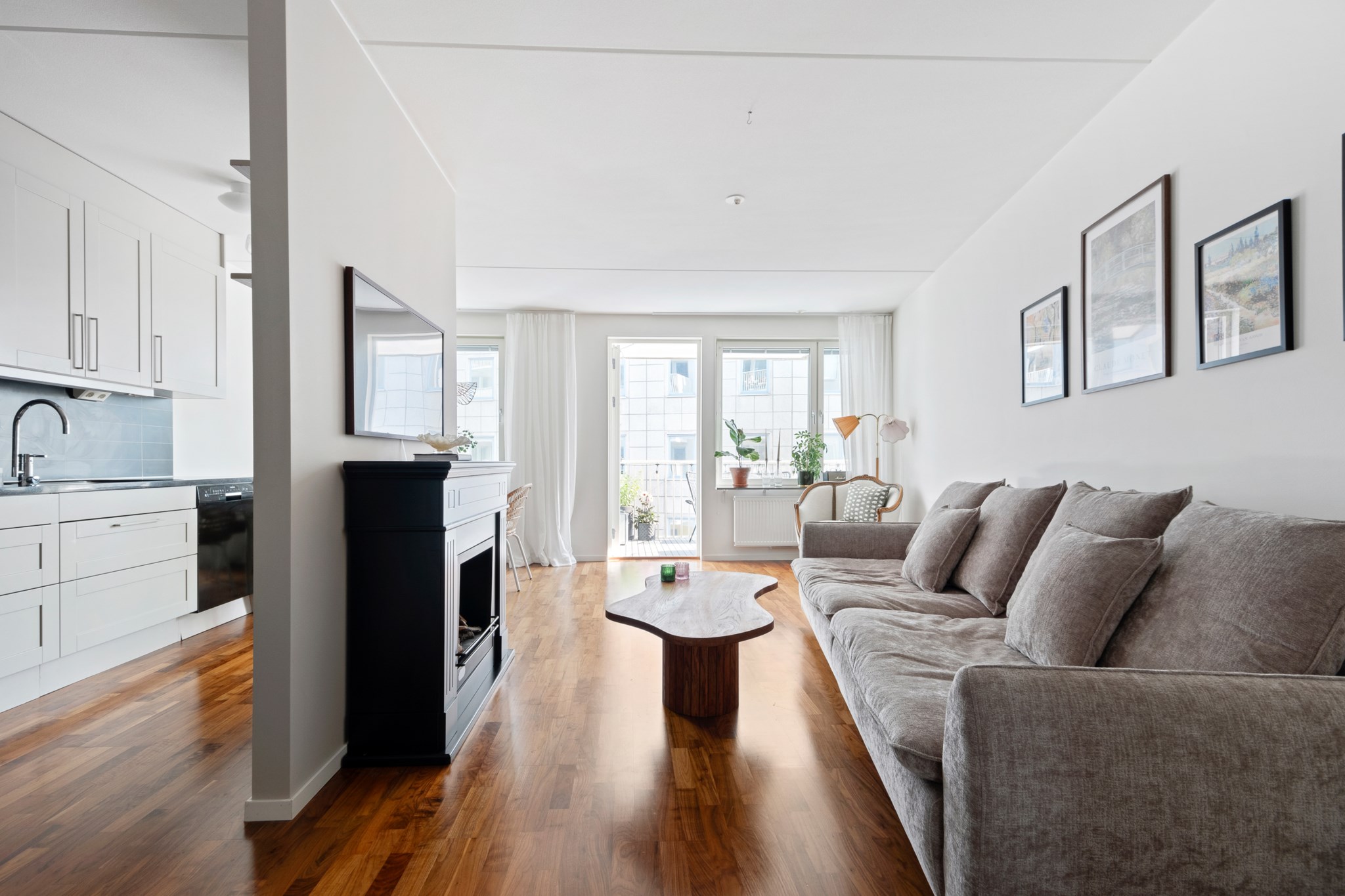Lägenheten om 54 kvm bjuder på en genomtänkt och luftig planlösning som känns betydligt större i verkligheten. Det stilrena köket och det trivsamma vardagsrummet flyter samman i ett socialt och ljust rum där stora fönster släpper in dagsljuset från två väderstreck. Här finns gott om plats för både vardag och fest.