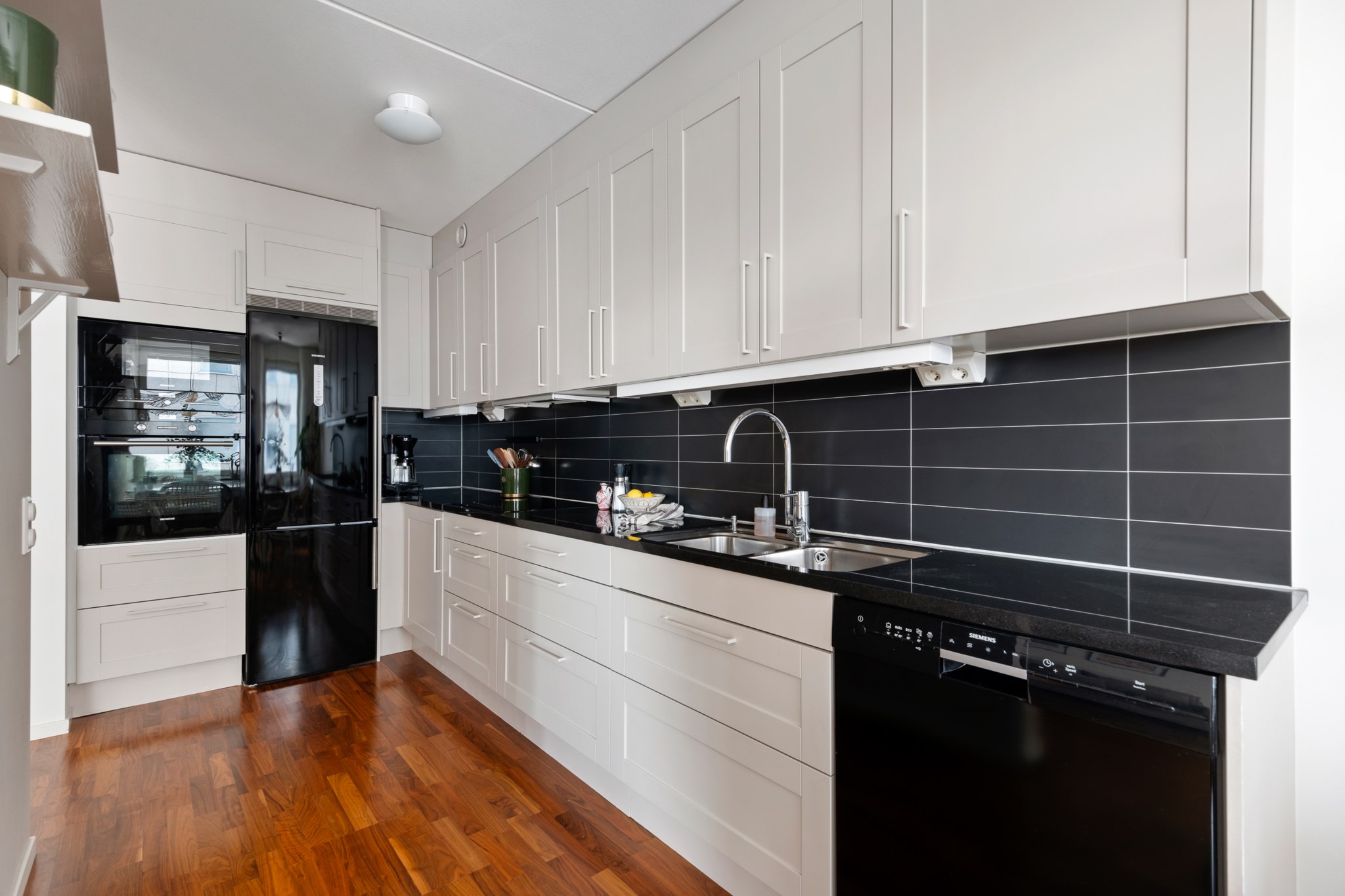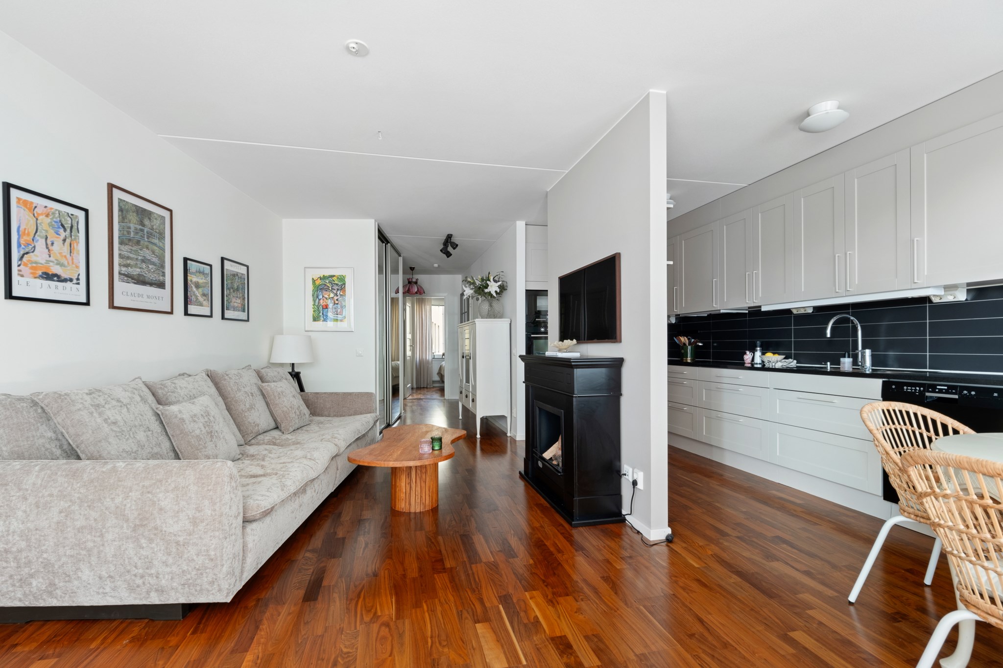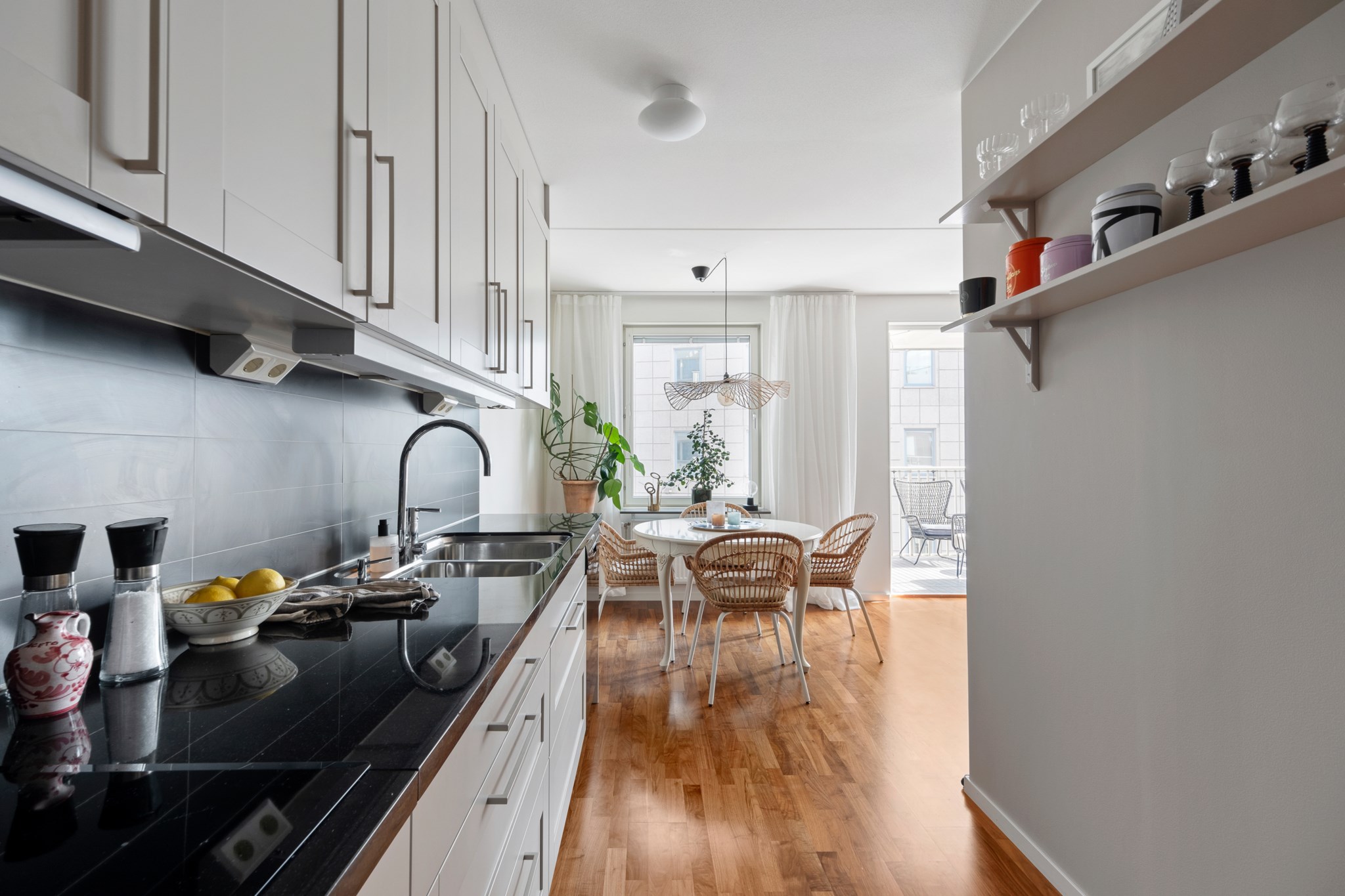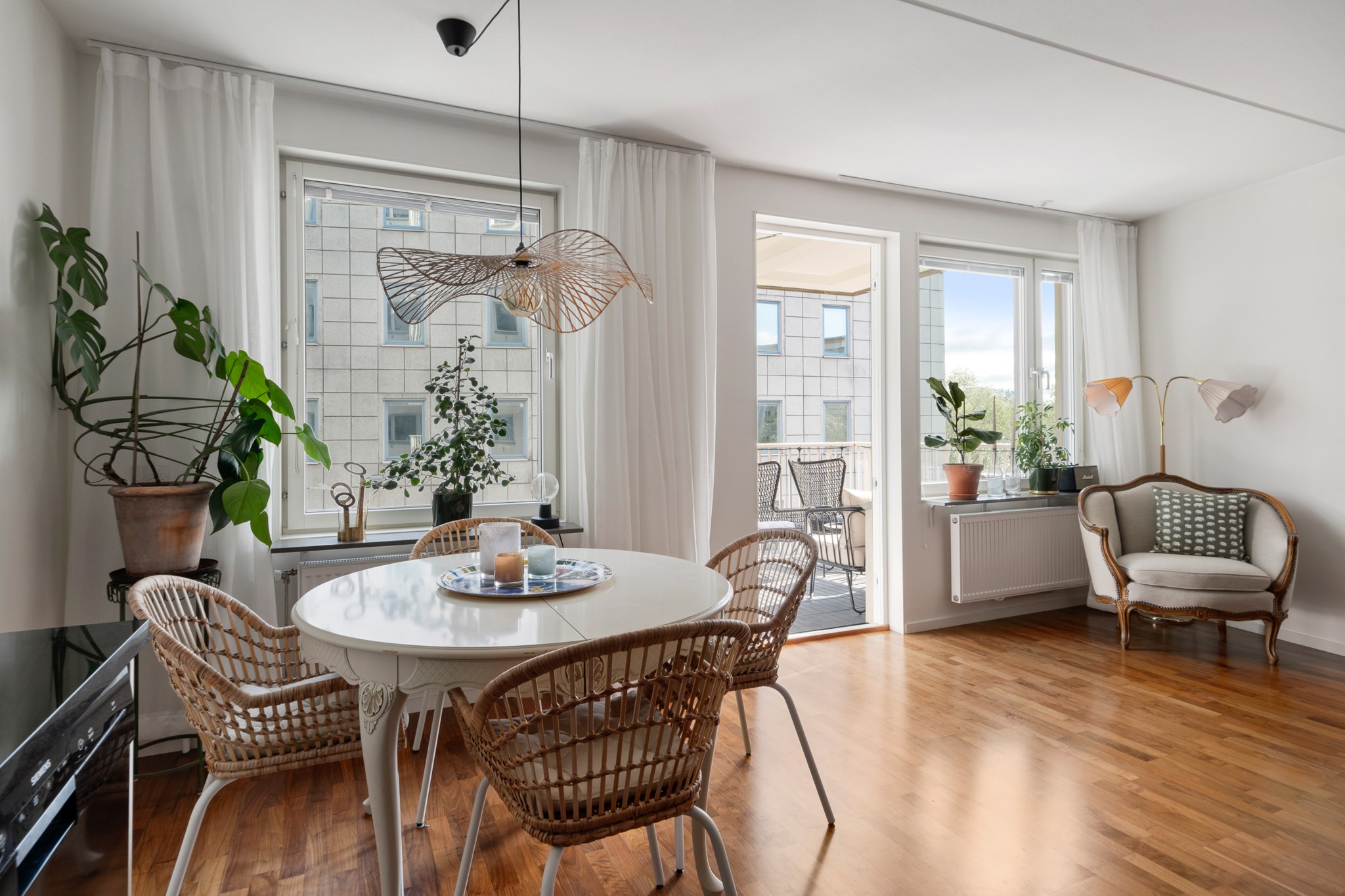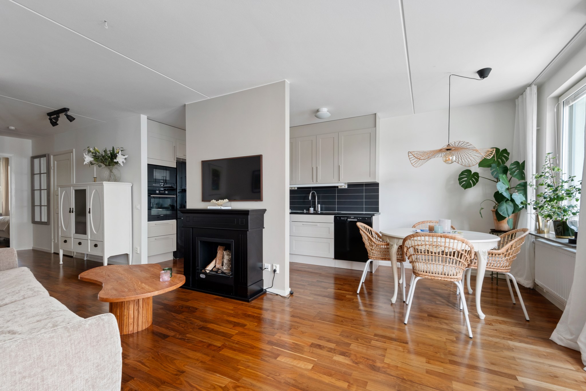 Lägenheten om 54 kvm bjuder på en genomtänkt och luftig planlösning som känns betydligt större i verkligheten. Det stilrena köket och det trivsamma vardagsrummet flyter samman i ett socialt och ljust rum där stora fönster släpper in dagsljuset från två väderstreck. Här finns gott om plats för både vardag och fest.