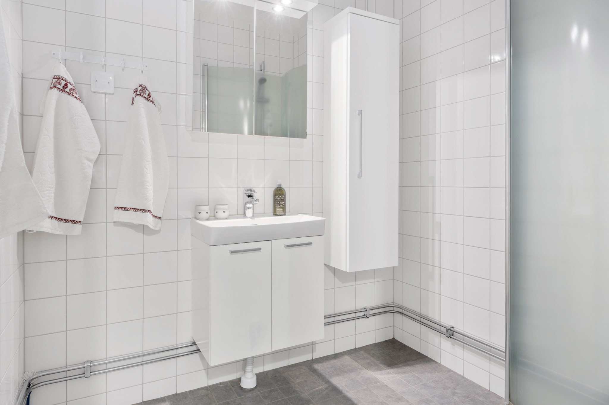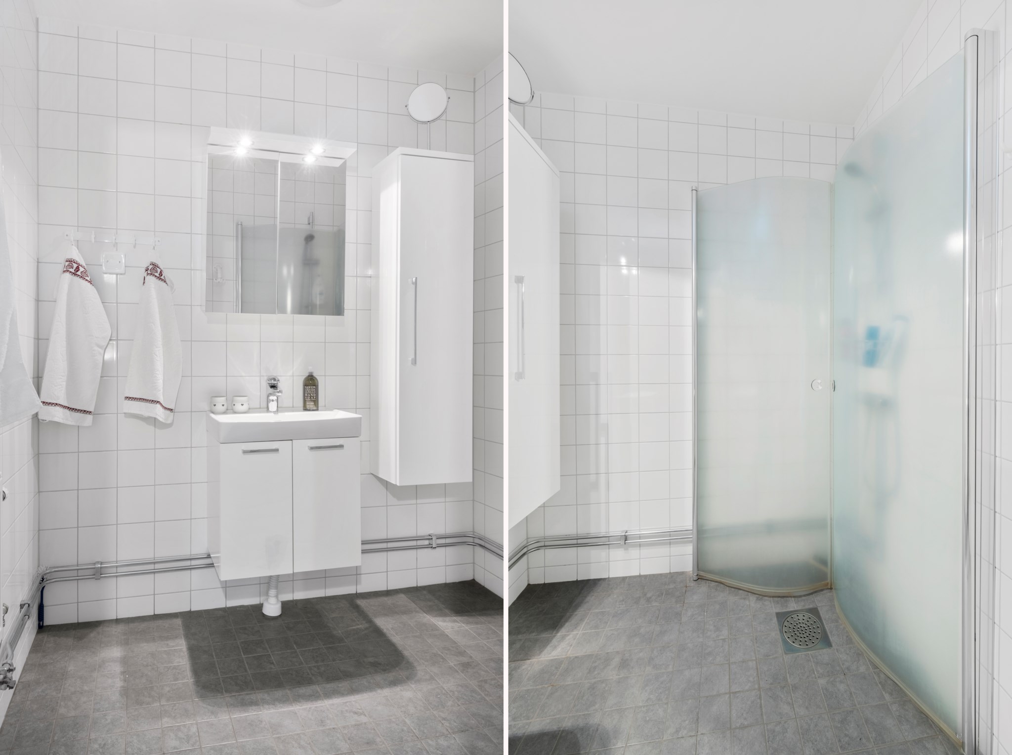 Stort och tidlöst helkaklat badrum med klinkergolv i grå kulör. WC, tvättställ med kommod och spegelskåp med belysning. Dusch med vikbara duschväggar, handdukstork på väggen samt extra väggskåp till förvaring.