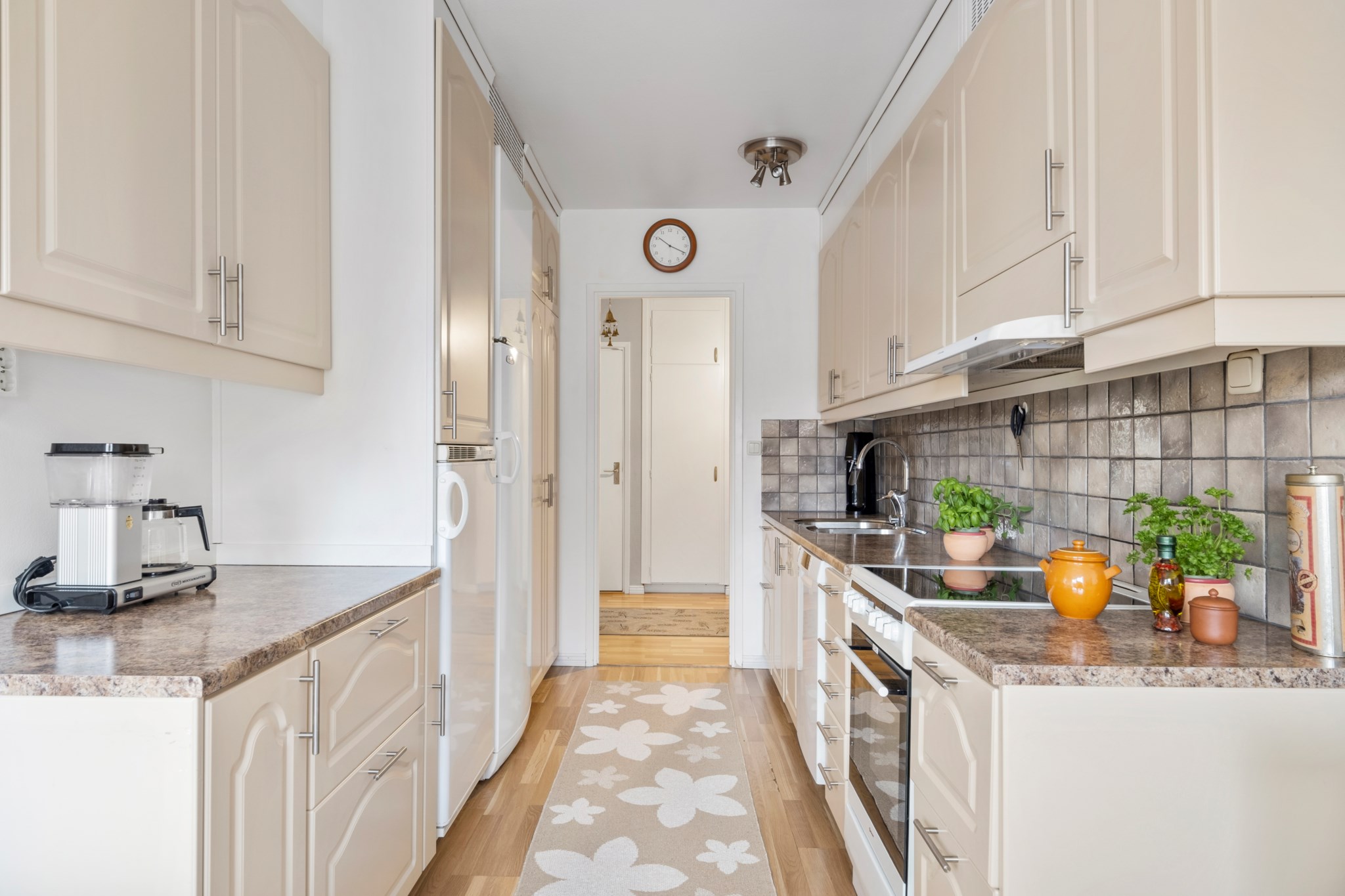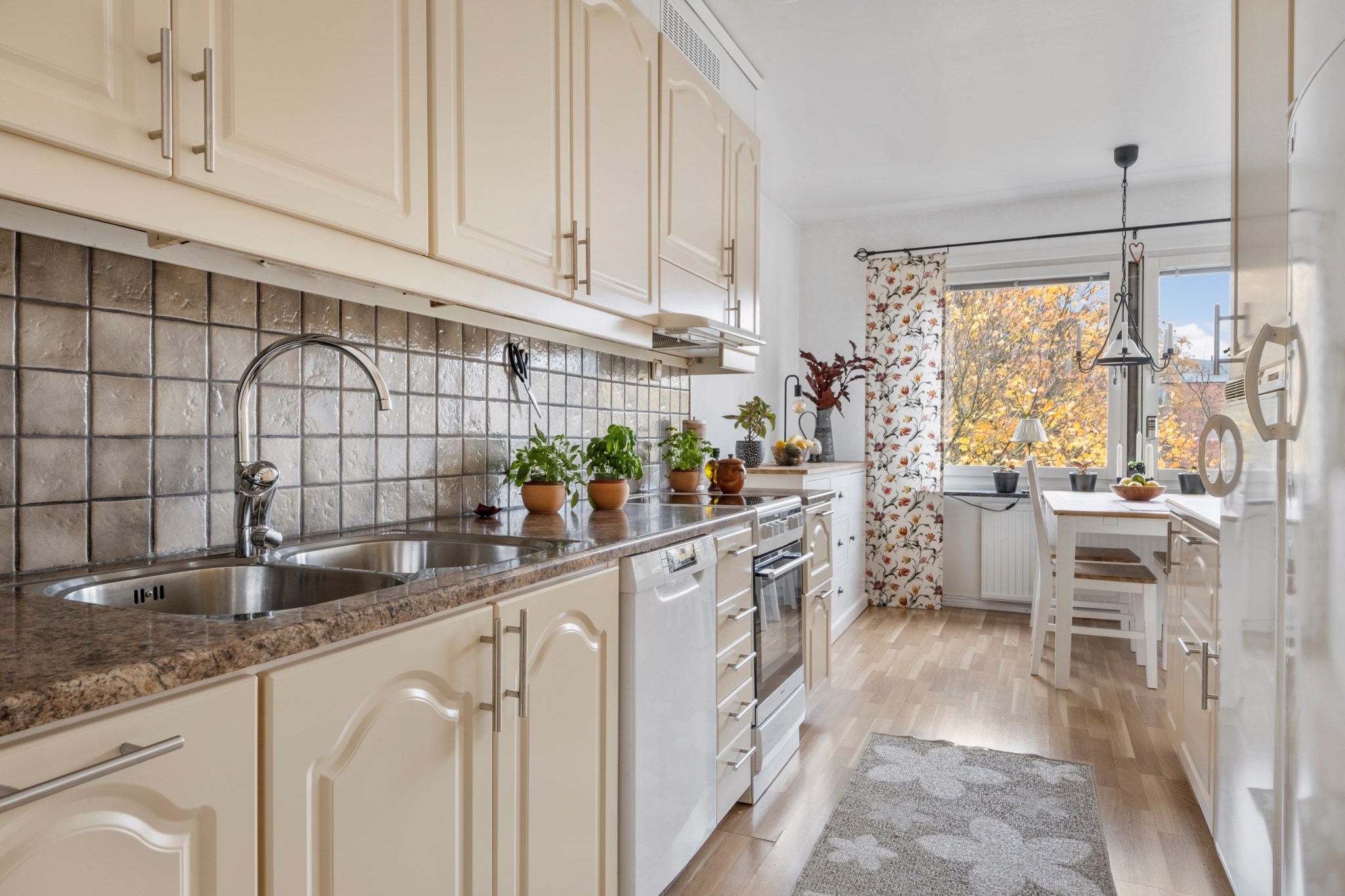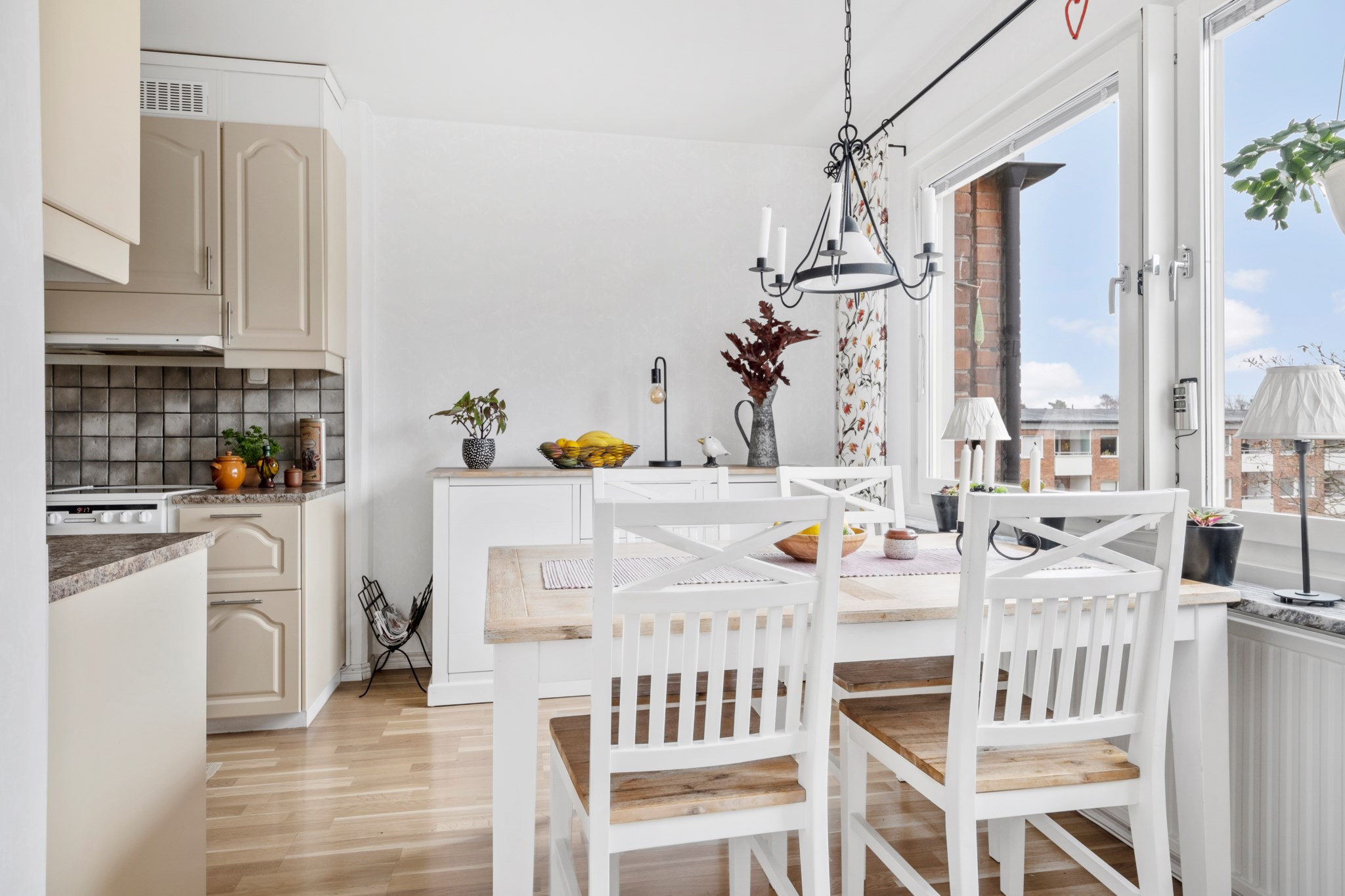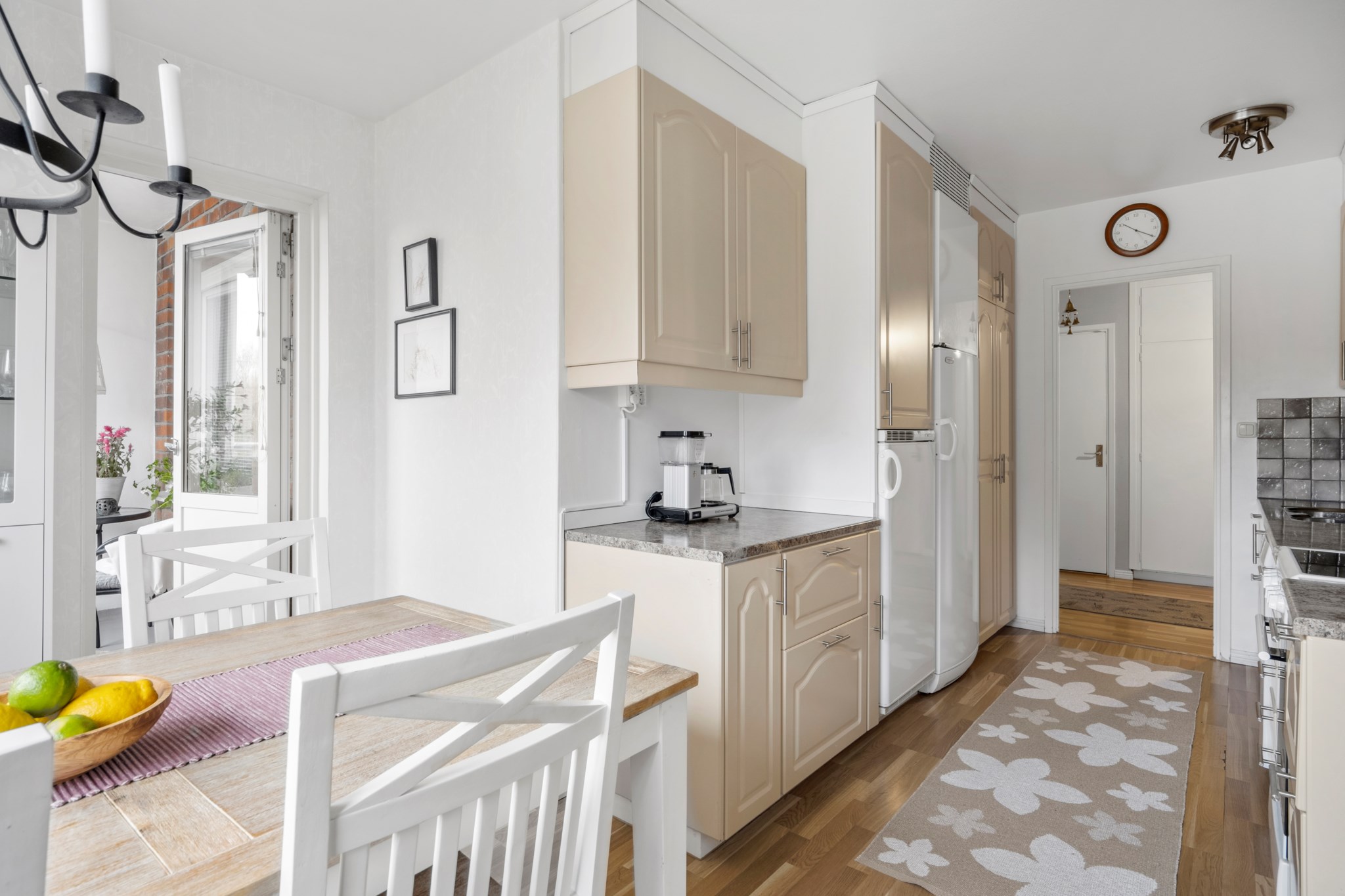 Ljust och fräscht kök med massor av förvaring och arbetsyta! Köket är i vacker beige kulör på köksskåp och lådor samt bänkskiva i vacker natursten, klinker i grå/beige toner som stänkskydd. Ett kök helt enkelt utmärkt för den glada kocken! Utrustningen består av en diskmaskin, diskho, spis, fläkt, ugn samt kyl och frys. Här finns det även ett naturligt utrymme för ett matbord med plats för upp till 4 personer. Den inglasade balkongen nås i anslutning från köket, här kan man njuta av många soltimmar eller bara njuta av den vackra utsikten.