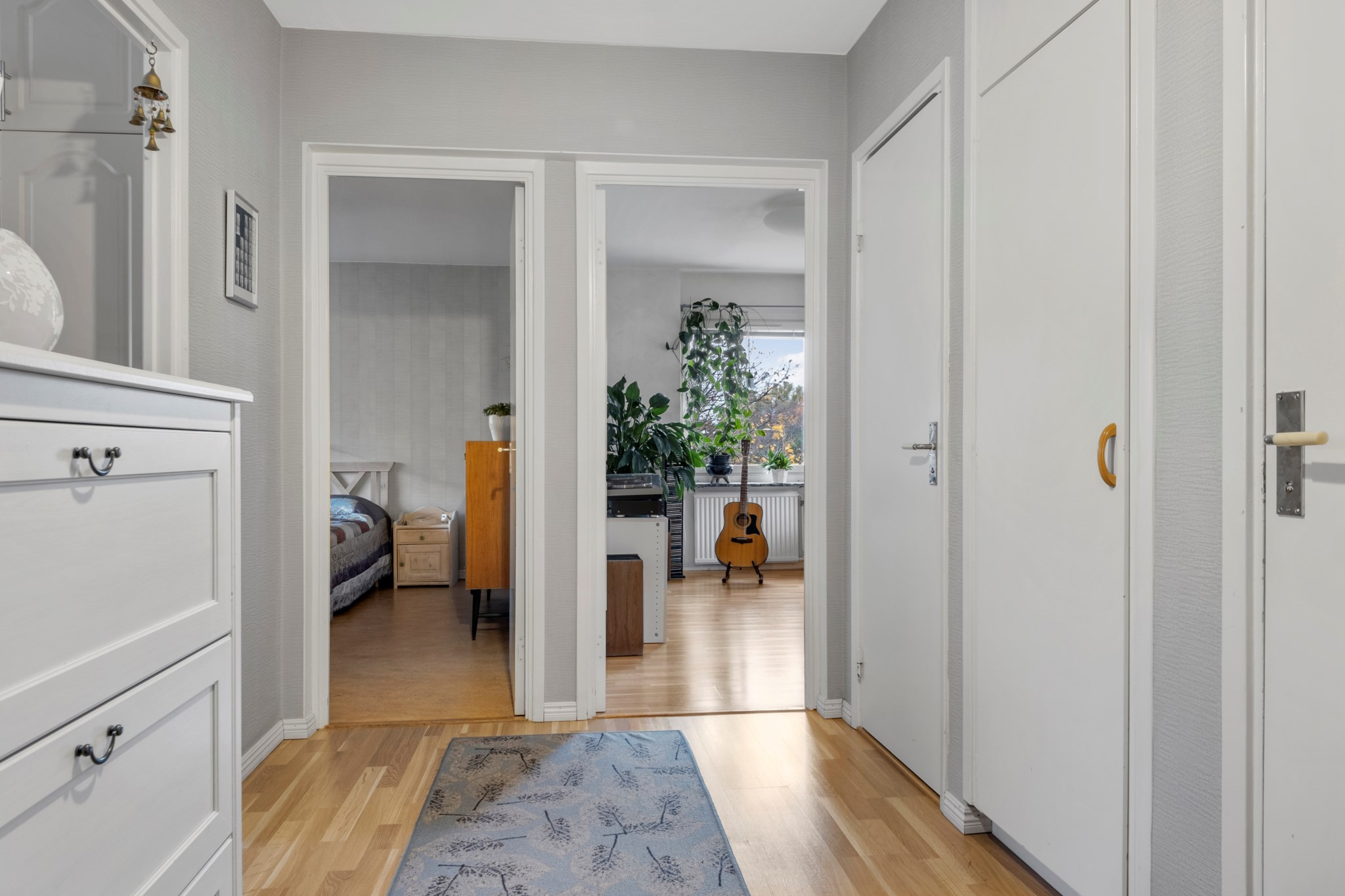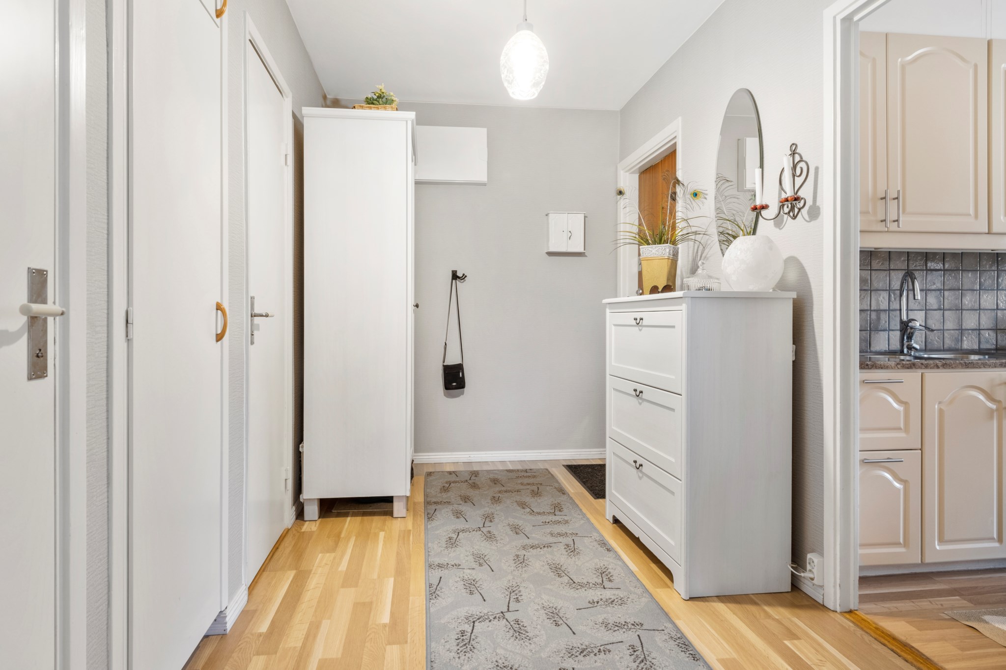 Välkomna in till en stor hall med gott om förvaringsmöjligheter. Direkt i anslutning till dörren finns det yta för avhängning samt avlastningsbord eller byrå om så önskas. Från hallen nås bostadens alla rum. På golvet hittar vi ekparkett och ljus gråa målade väggar.