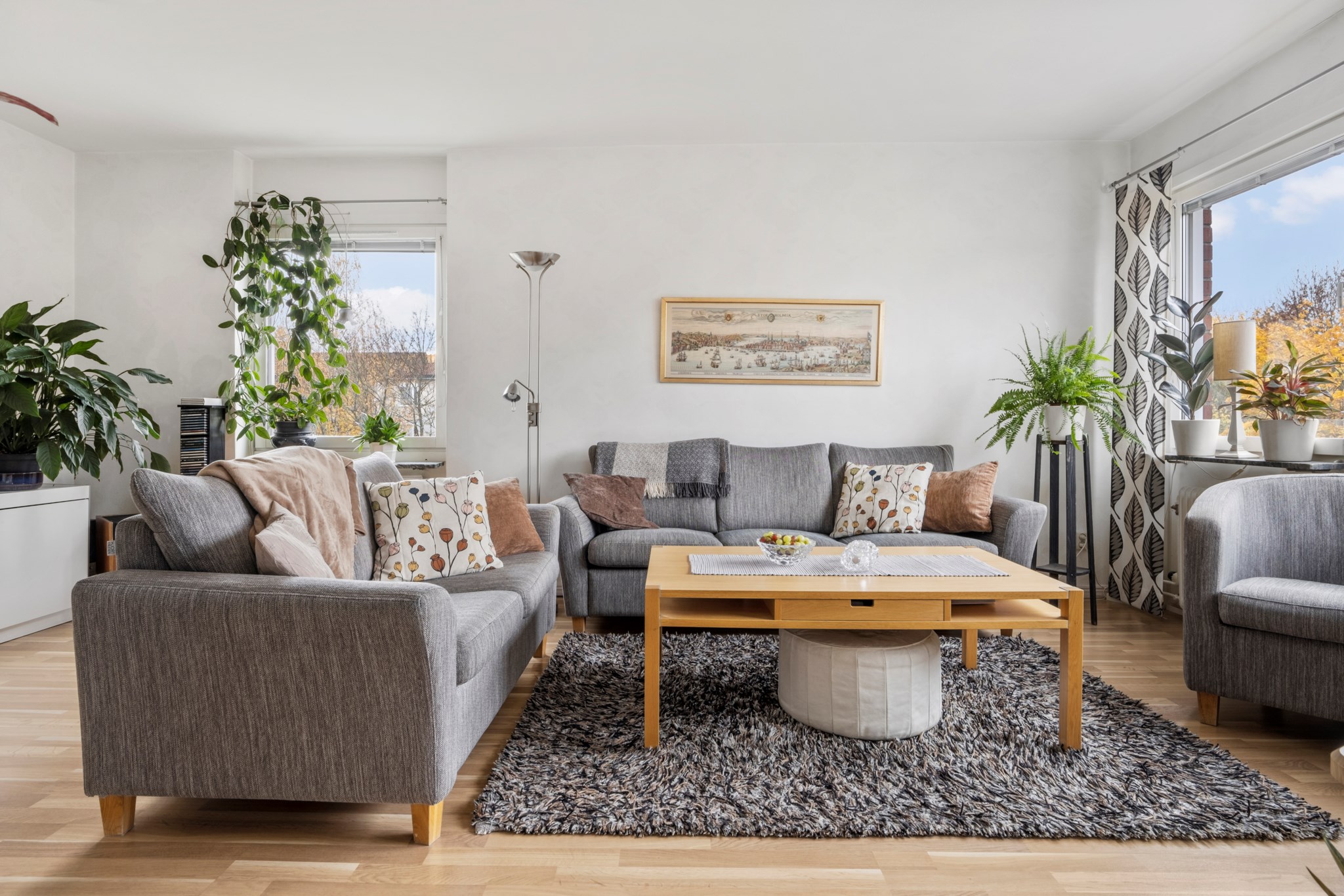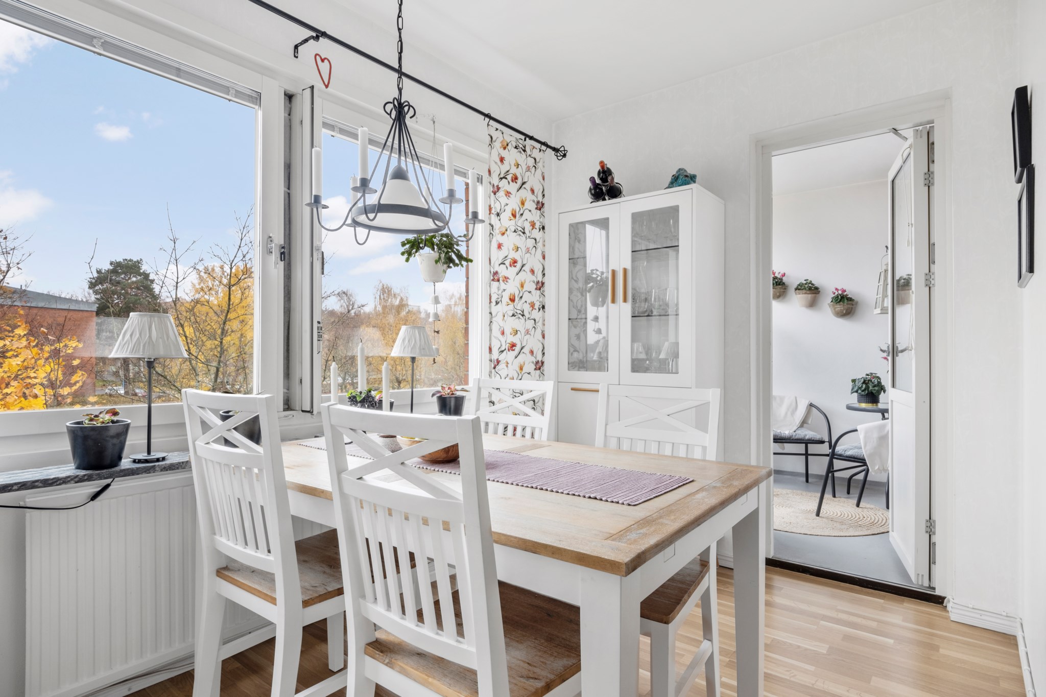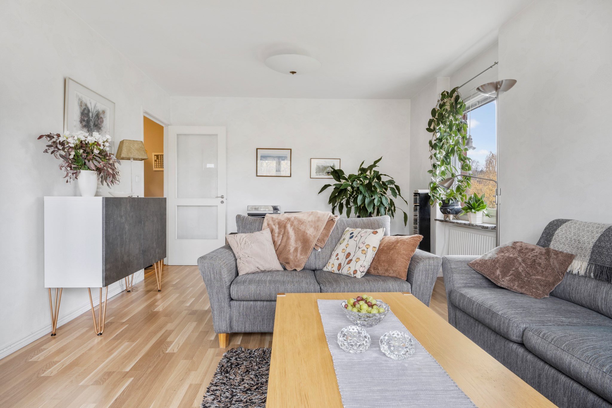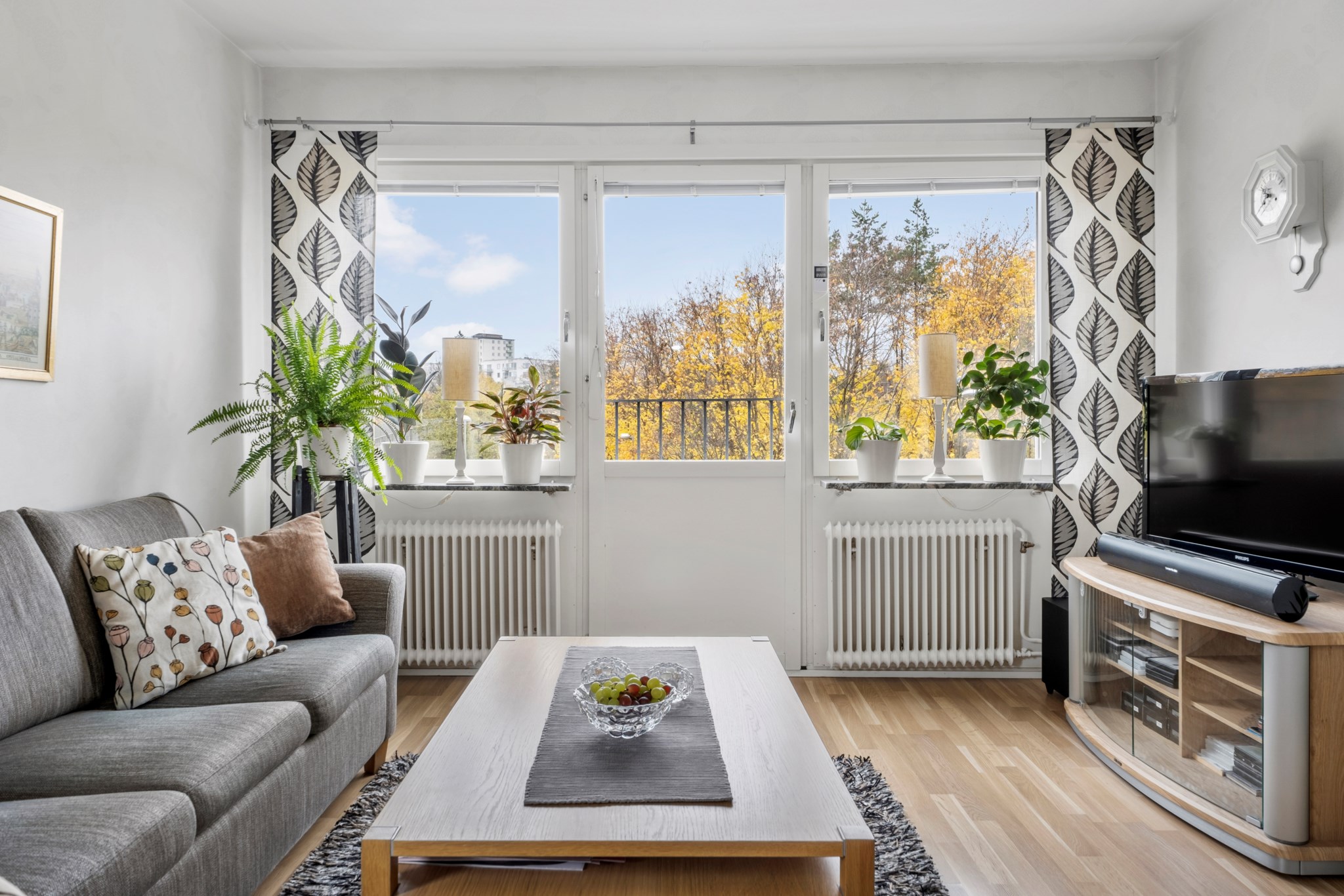 Stort och ljust vardagsrum med franskbalkong! Här finner man gott om plats för soffgruppen med tillhörande möblemang. Vackert ljusinsläpp från de stora fina fönsterpartierna. Här hittar vi också det vackra golvet i ekparkett som är genomgående genom bostaden. Väggarna i målade i ljus kulör, ett härligt vardagsrum att trivas i!