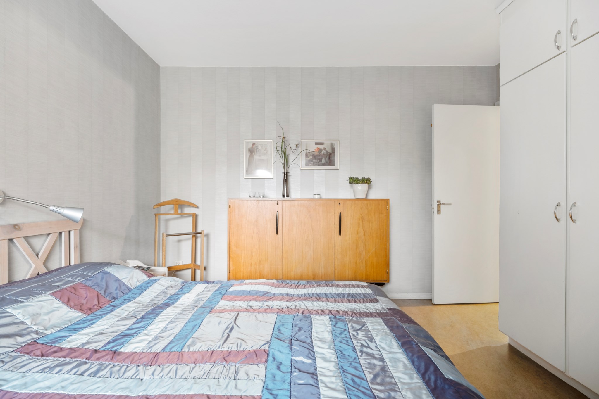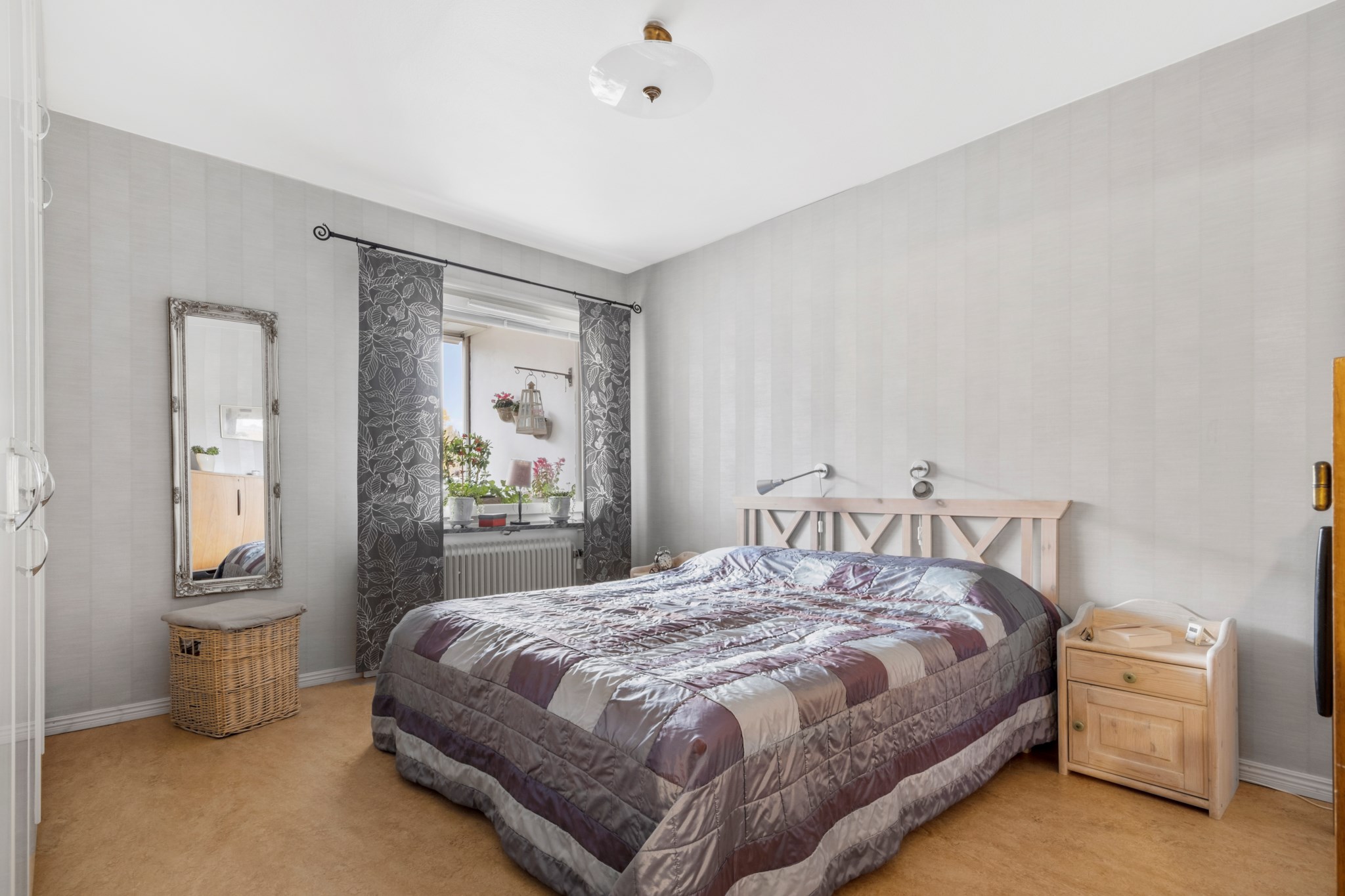 Stilrent och stort sovrum med gott om förvaring i de platsbyggda garderoberna. Plats för en dubbelsäng med tillhörande sängbord och annan möblemang. Grå tapet på väggar och golv i original. Stort fönster för massa ljusinsläpp men insynsskyddat.