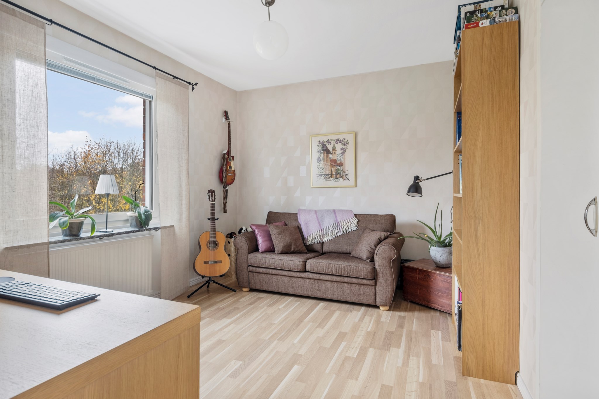 Ljust sovrum med plats för säng och tillhörande sängbord och skrivbord eller byrå. Sovrummet används idag som kontor och funkar lika bra det. På golvet har vi vacker parkett i ek och tapet på väggar i beige kulör.