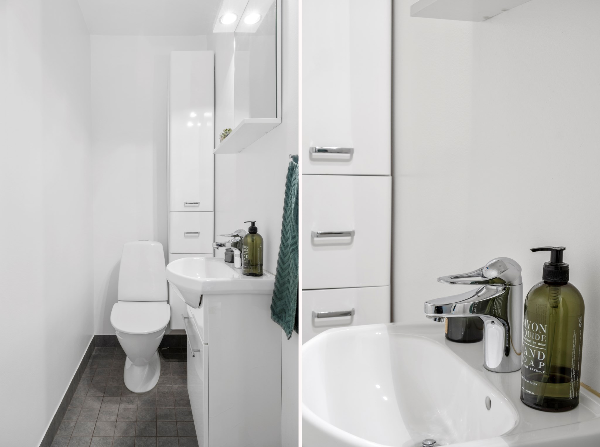 Praktiskt och kvadratsmart WC utrustad med tvättställ med kommod samt extra väggskåp för förvaring. Klinker i grå kulör på golv och vitt målade väggar.