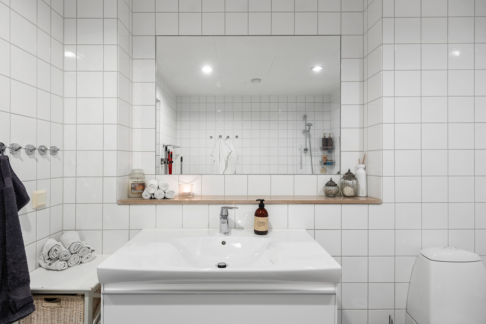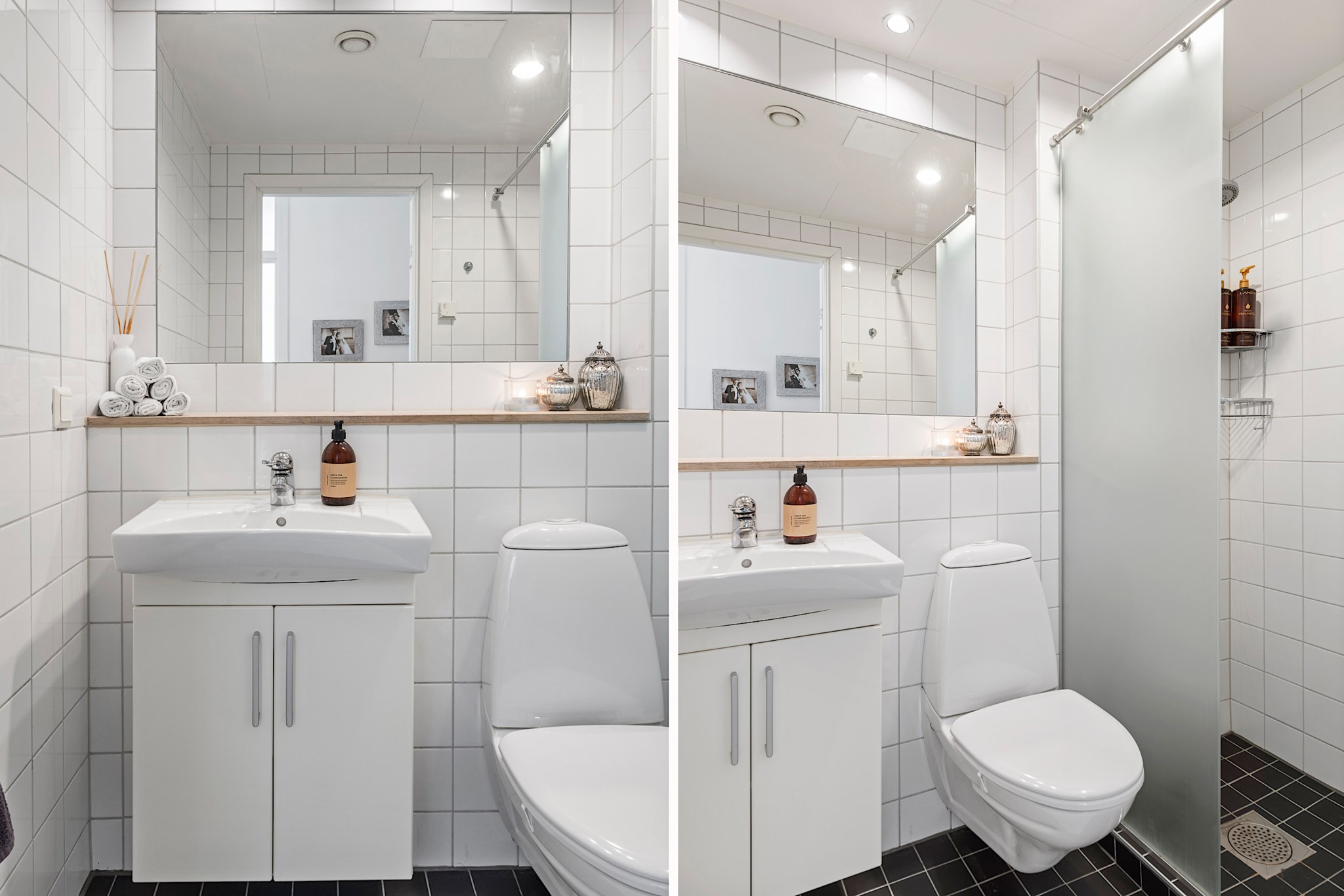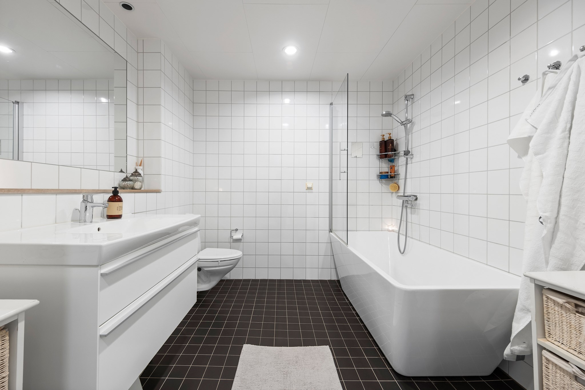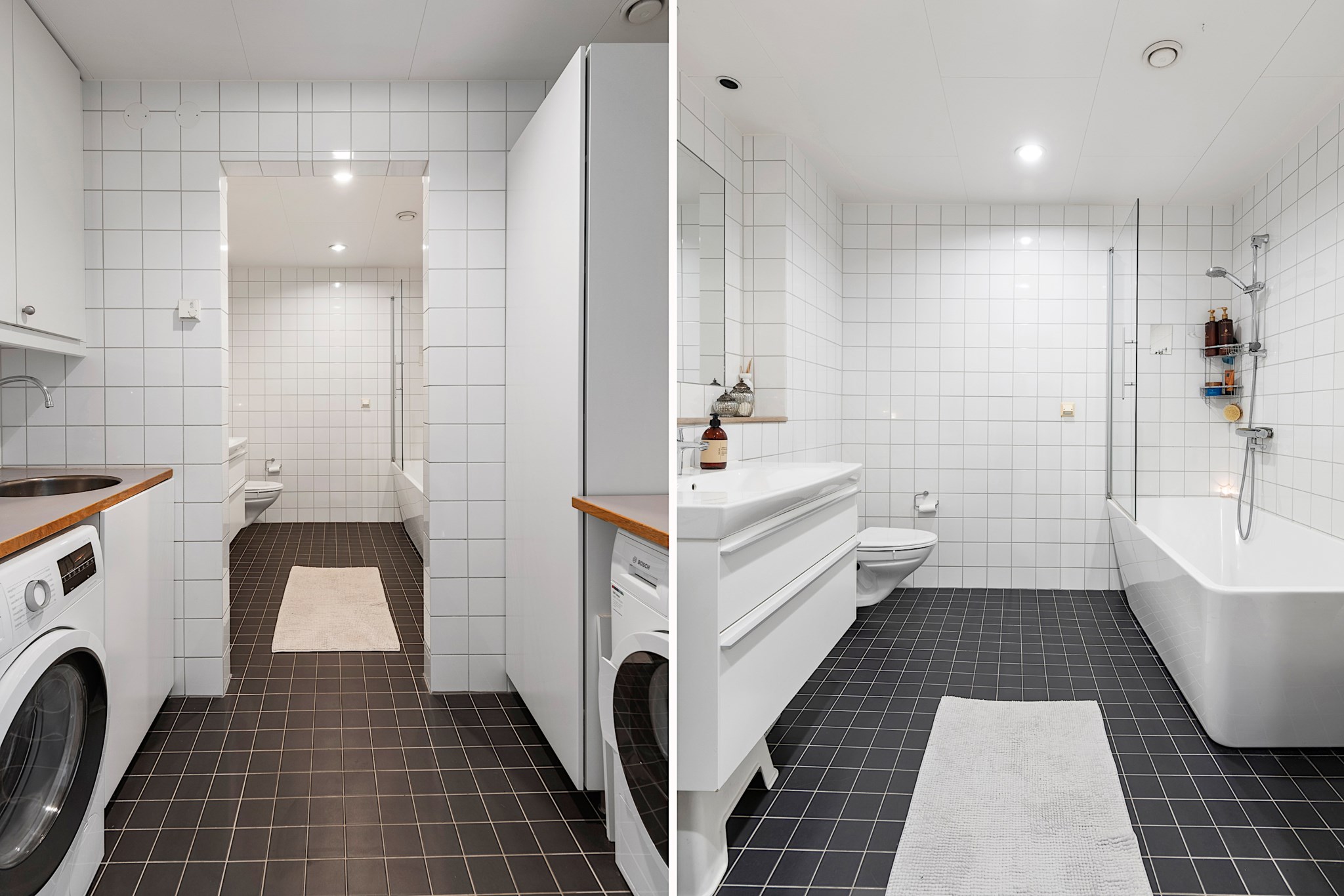 Det stora badrummet är helkaklat och utrustat med badkar, wc och en praktisk tvättavdelning med tvättmaskin, torktumlare, skåp och bänkyta. Dessutom finns en separat wc med dusch – perfekt för morgonrusningen eller gäster.