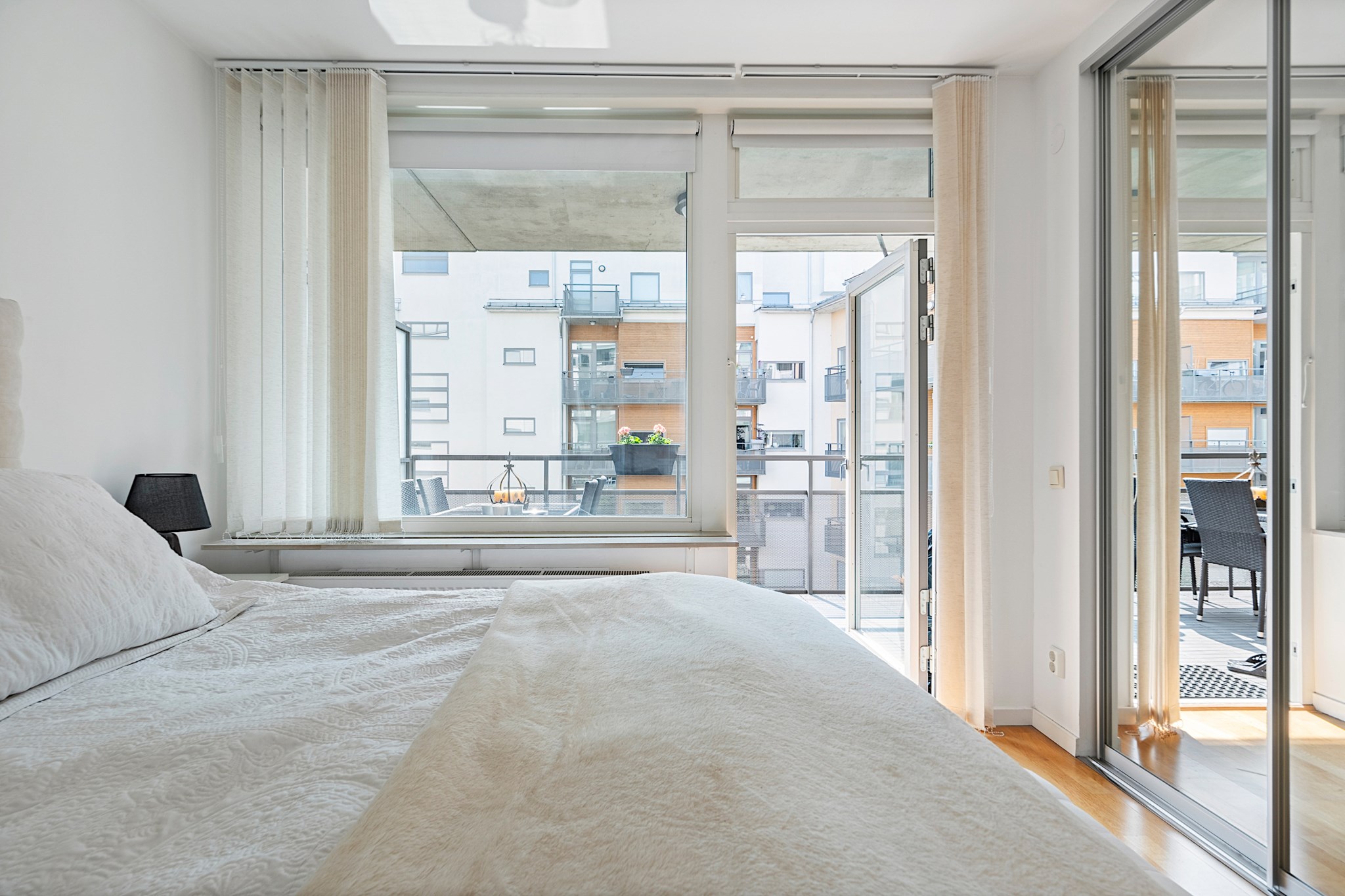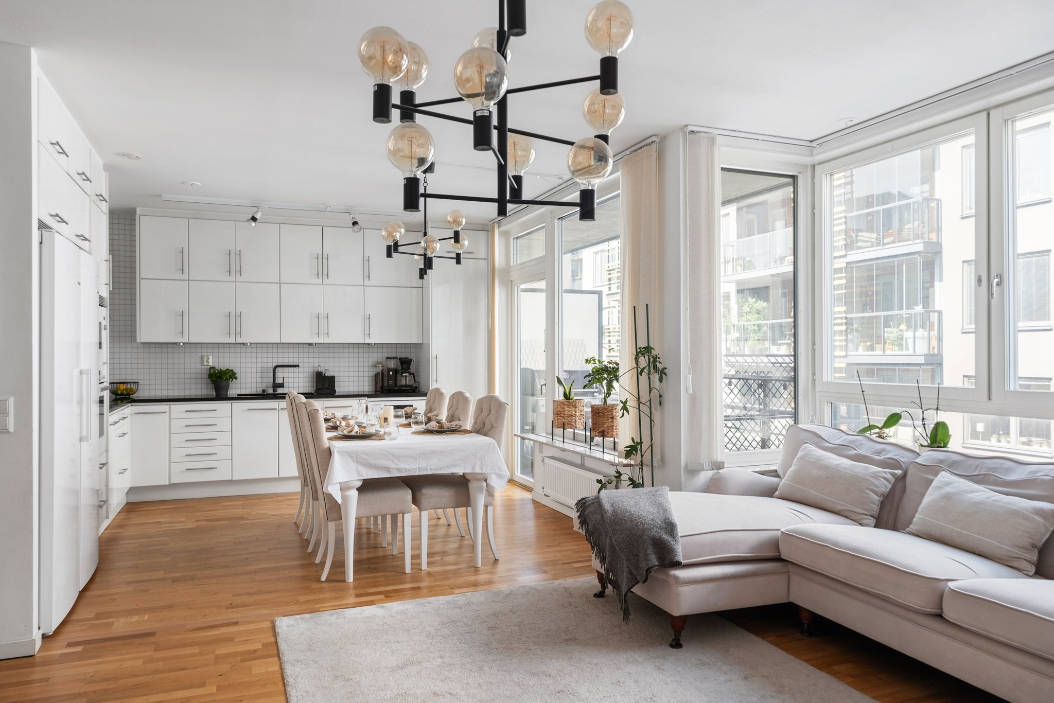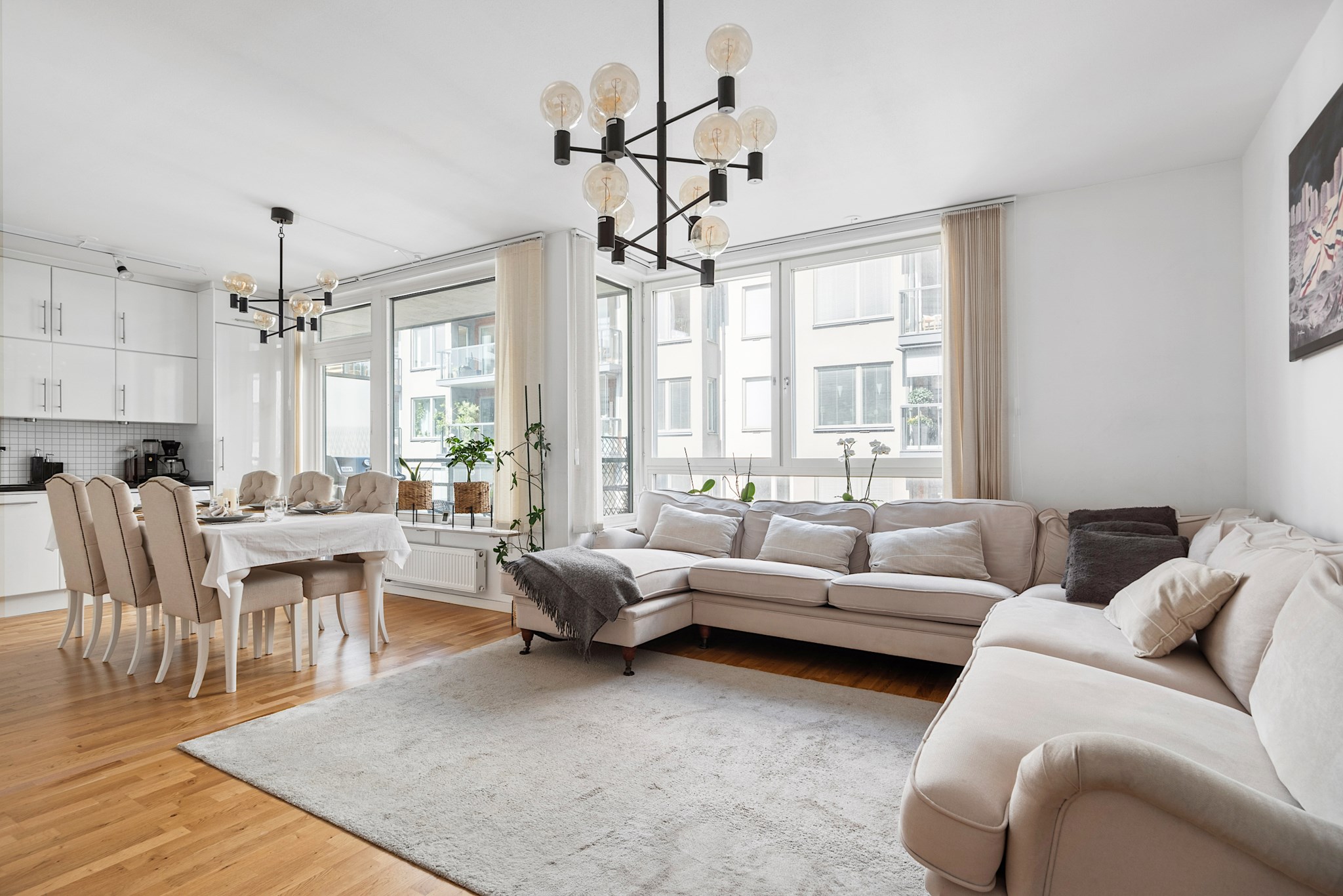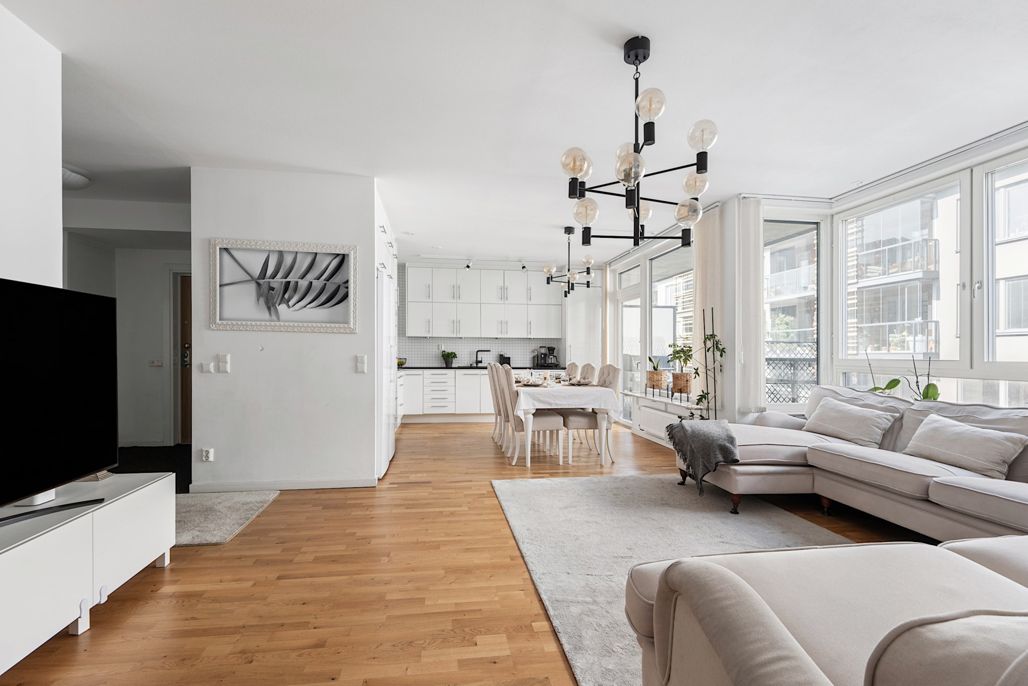 Bostaden präglas av en öppen och genomtänkt planlösning som skapar ett fantastiskt ljusflöde och inbjuder till umgänge och vardagslyx. Två generösa balkonger, två badrum, tre sovrum och gott om förvaring gör detta till ett hem som passar såväl barnfamiljen som paret med höga krav.