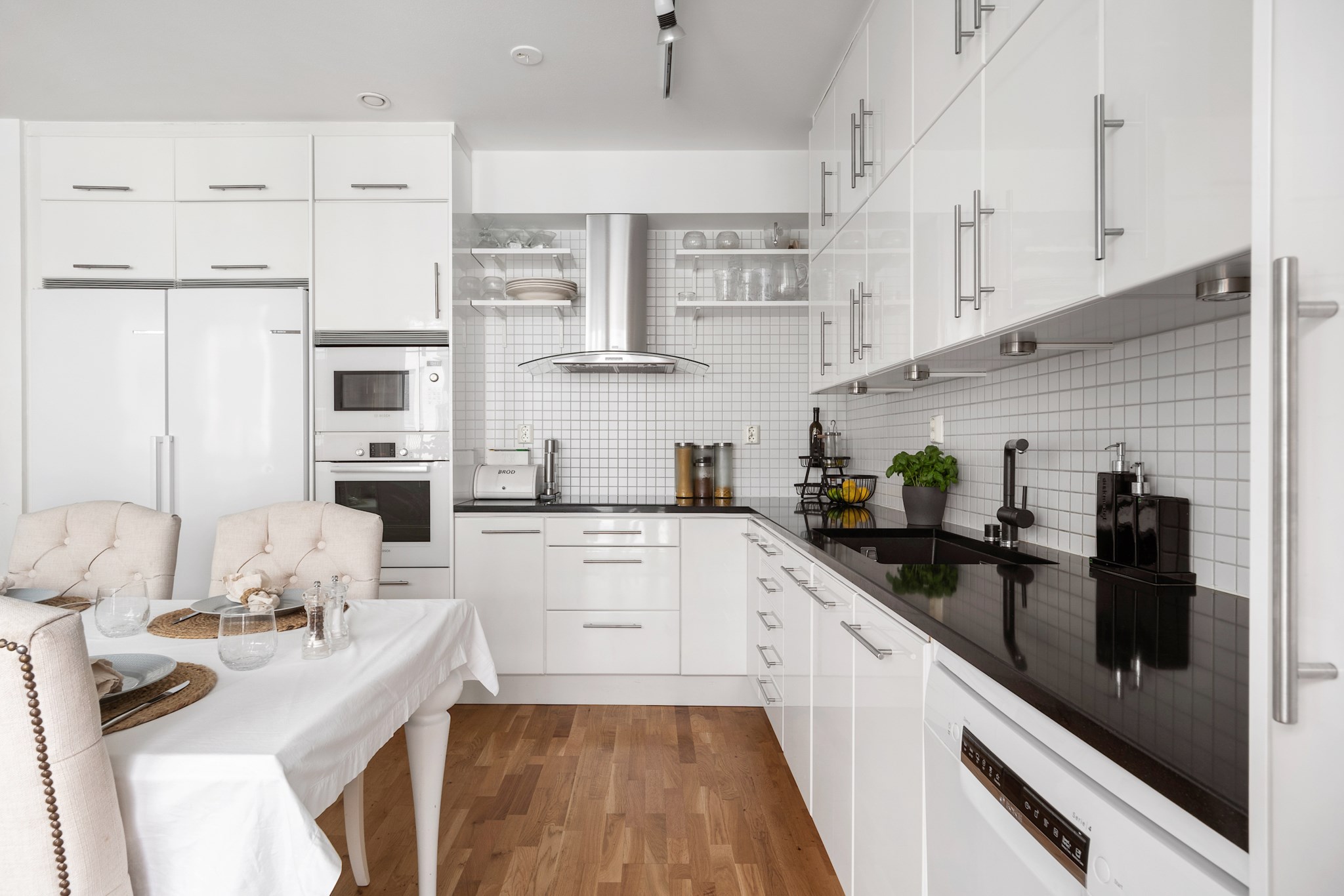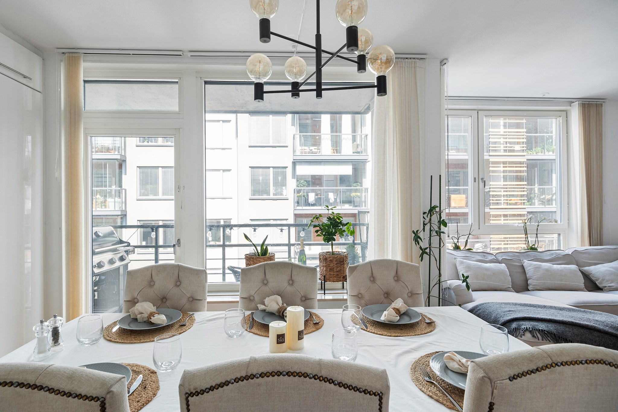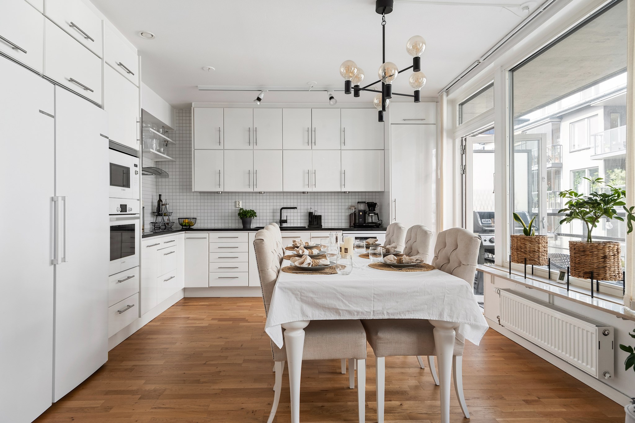 Det stora köket är både stilrent och funktionellt med fina arbetsytor, god förvaring samt påkostade vitvaror, däribland dubbla kyl/frysar, diskmaskin, varmluftsugn och mikro. En självklar samlingsplats för såväl vardagsmiddag som helgens bjudningar. Intill fönstret finns en rymlig matplats där du enkelt dukar upp för både vardag och fest med direkt access till balkongen utanför.