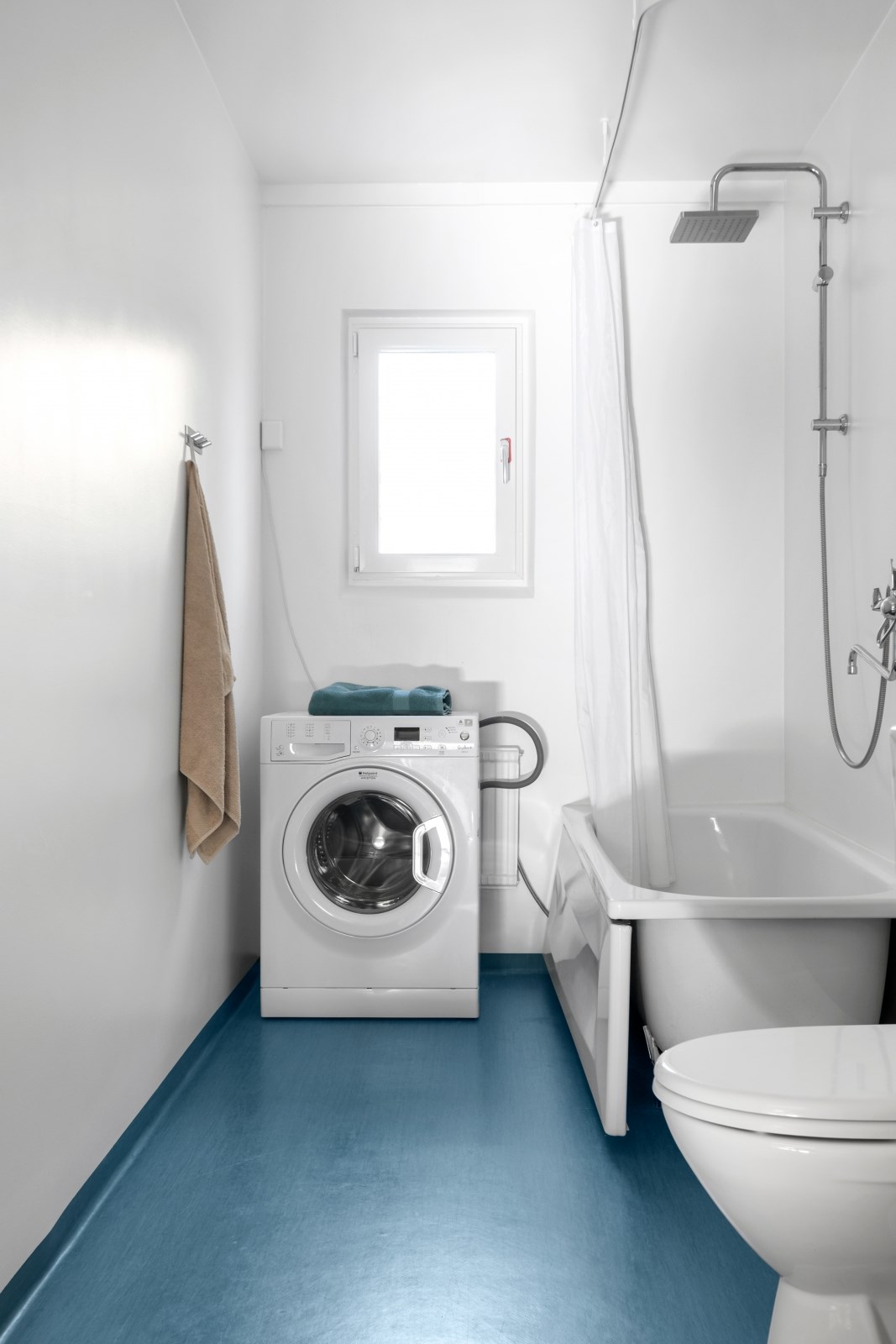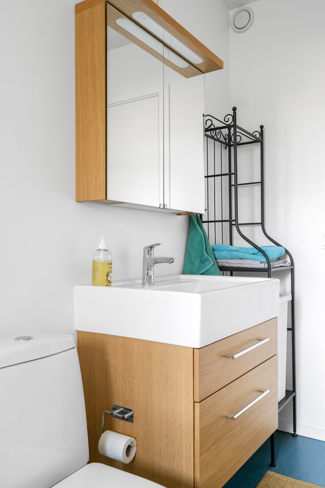 Stort badrum med målade väggar och på golvet ligger våtrumsmatta. Utrustningen består av: wc, badkar, tvättmaskin, kommod samt badrumsskåp. Det finns också ett mindre fönster för enkel vädring. Föreningen har planer om ca 2 år att påbörja stambyte med badrumsrenovering.