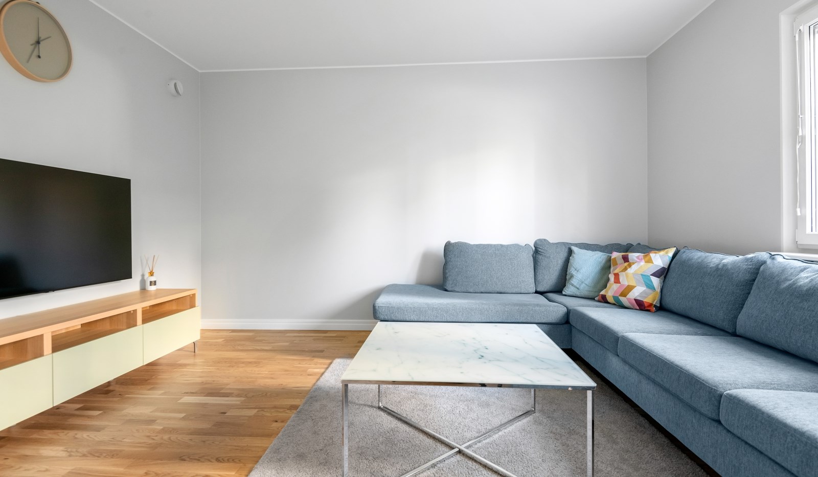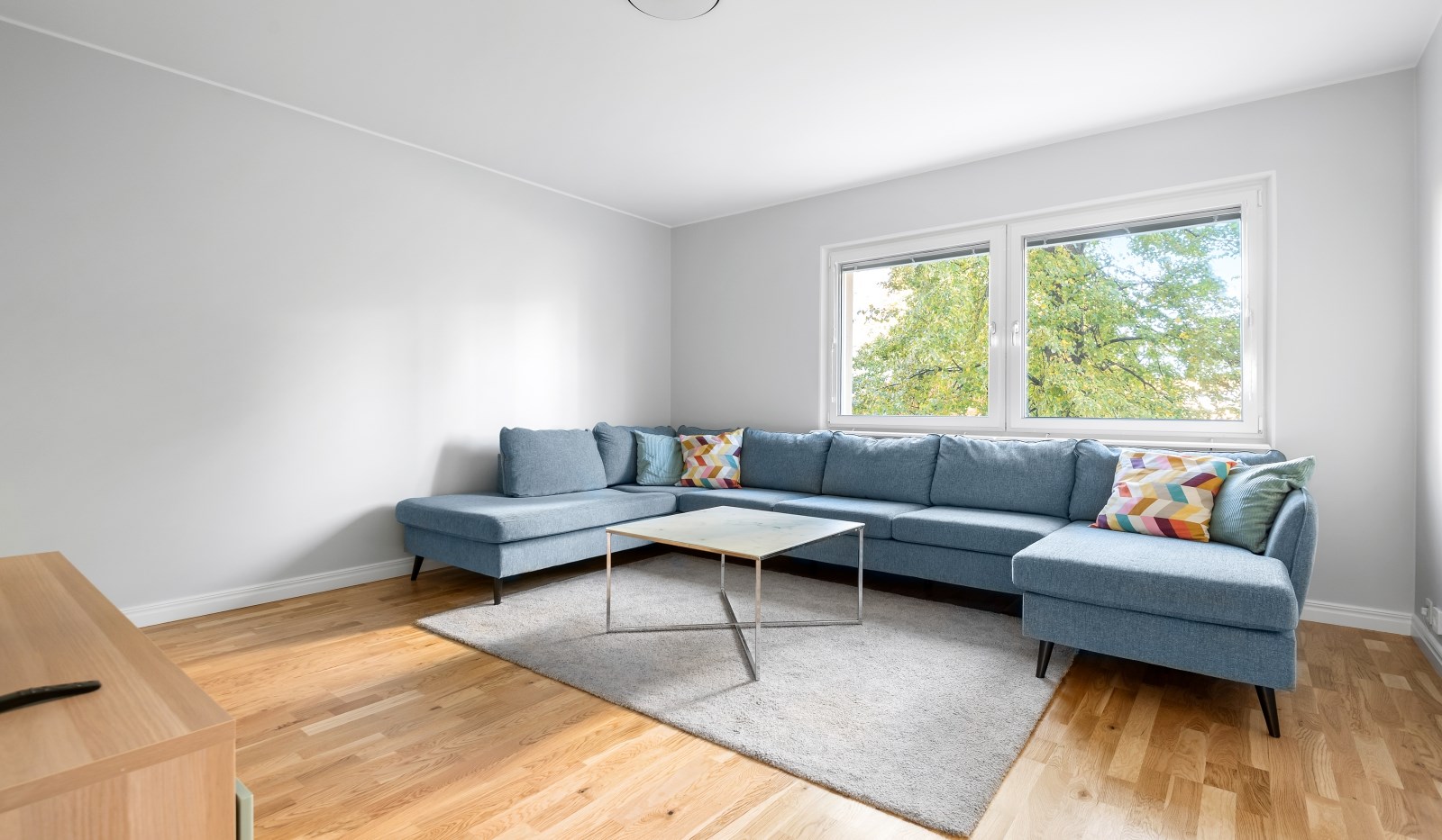 Rymligt och lättmöblerat vardagsrum med stora fönsterpartier som släpper in härligt ljus. Rummet har gott om plats för möblemang.