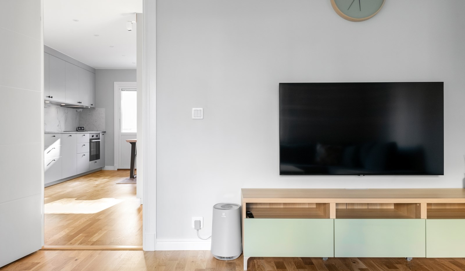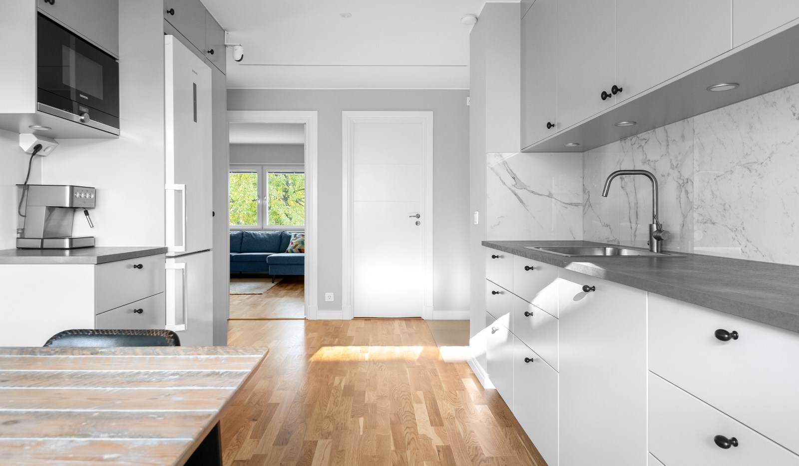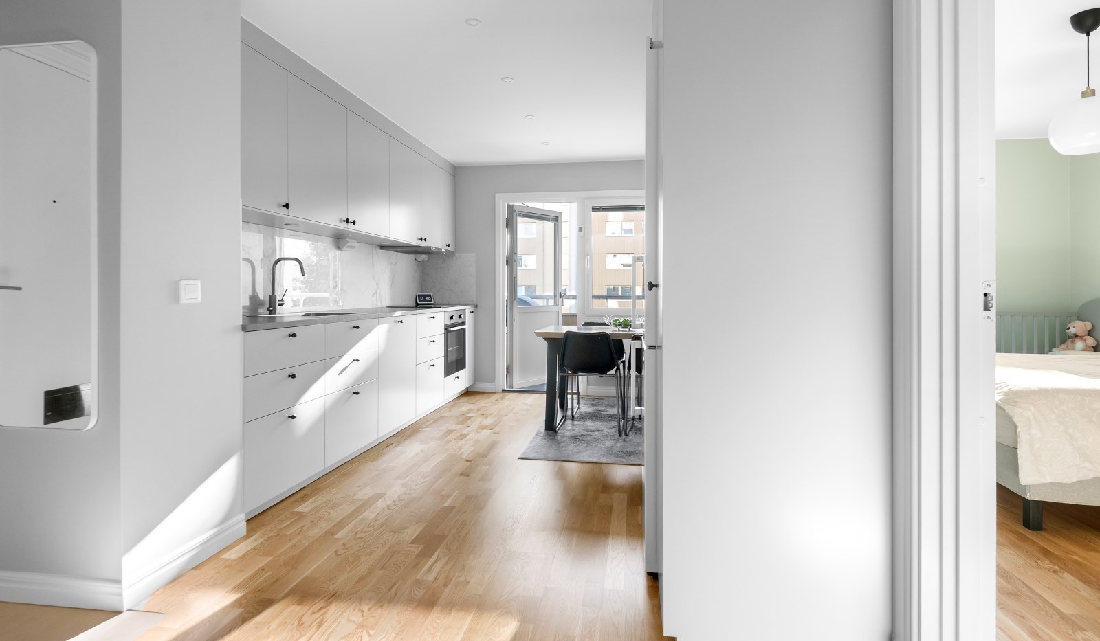 Välkomnande hall med öppen planlösning mot köket. Från hallen når man samtliga rum. Här finns plats att hänga av kläder och skor strax innanför dörren.