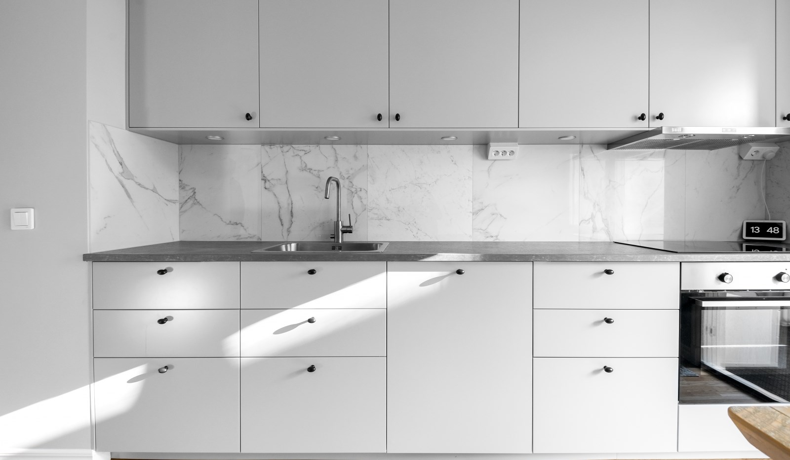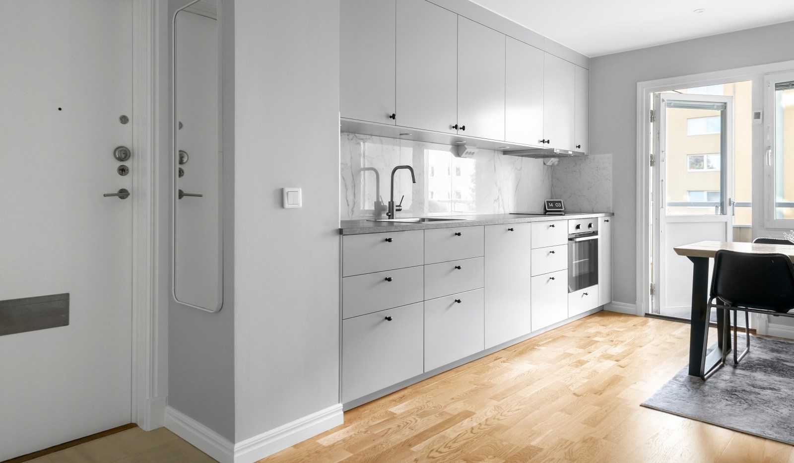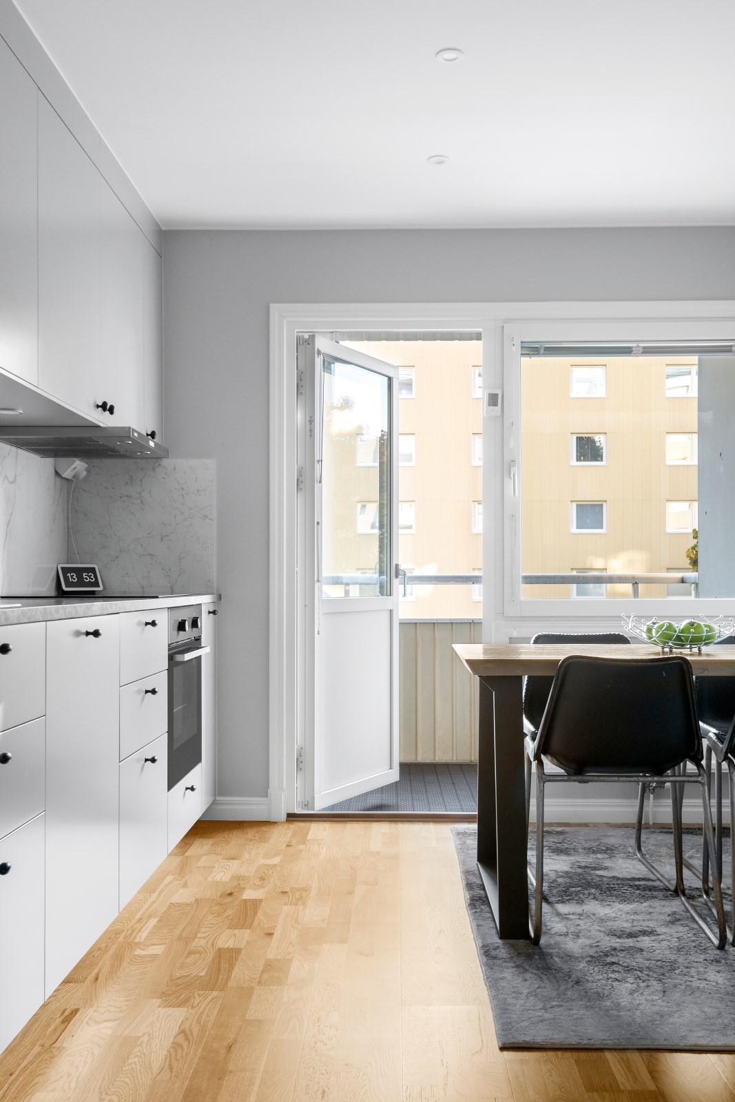 Snyggt fullutrustat kök med matplats invid fönstret. Här finns gott om förvaringsutrymmen och bra arbetsytor. Den maskinella utrustningen består av induktionshäll, ugn, micro, fläkt, integrerad diskmaskin samt kyl/frys i fullhöjd. Från köket är det utgång till lägenhetens balkong.