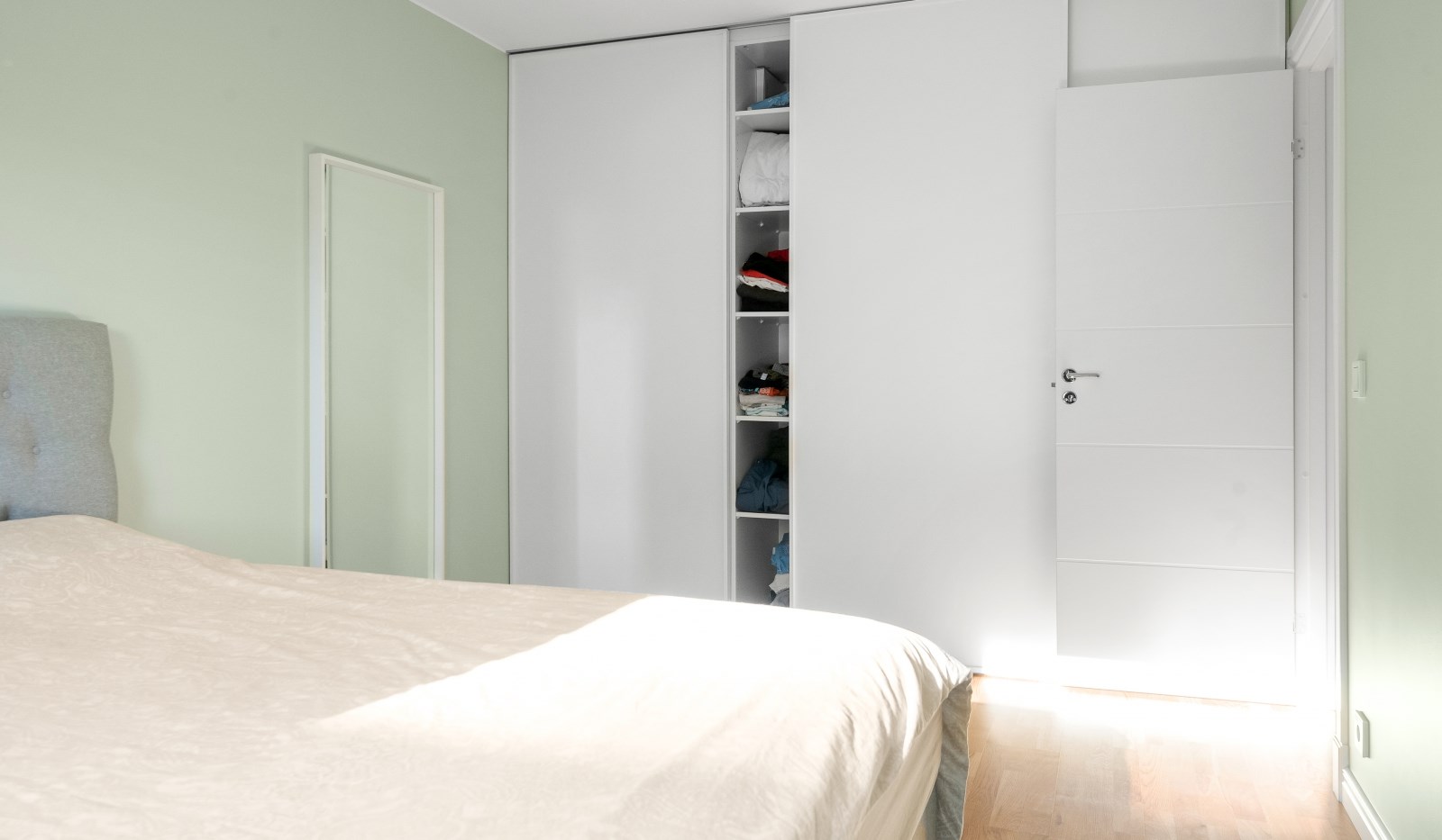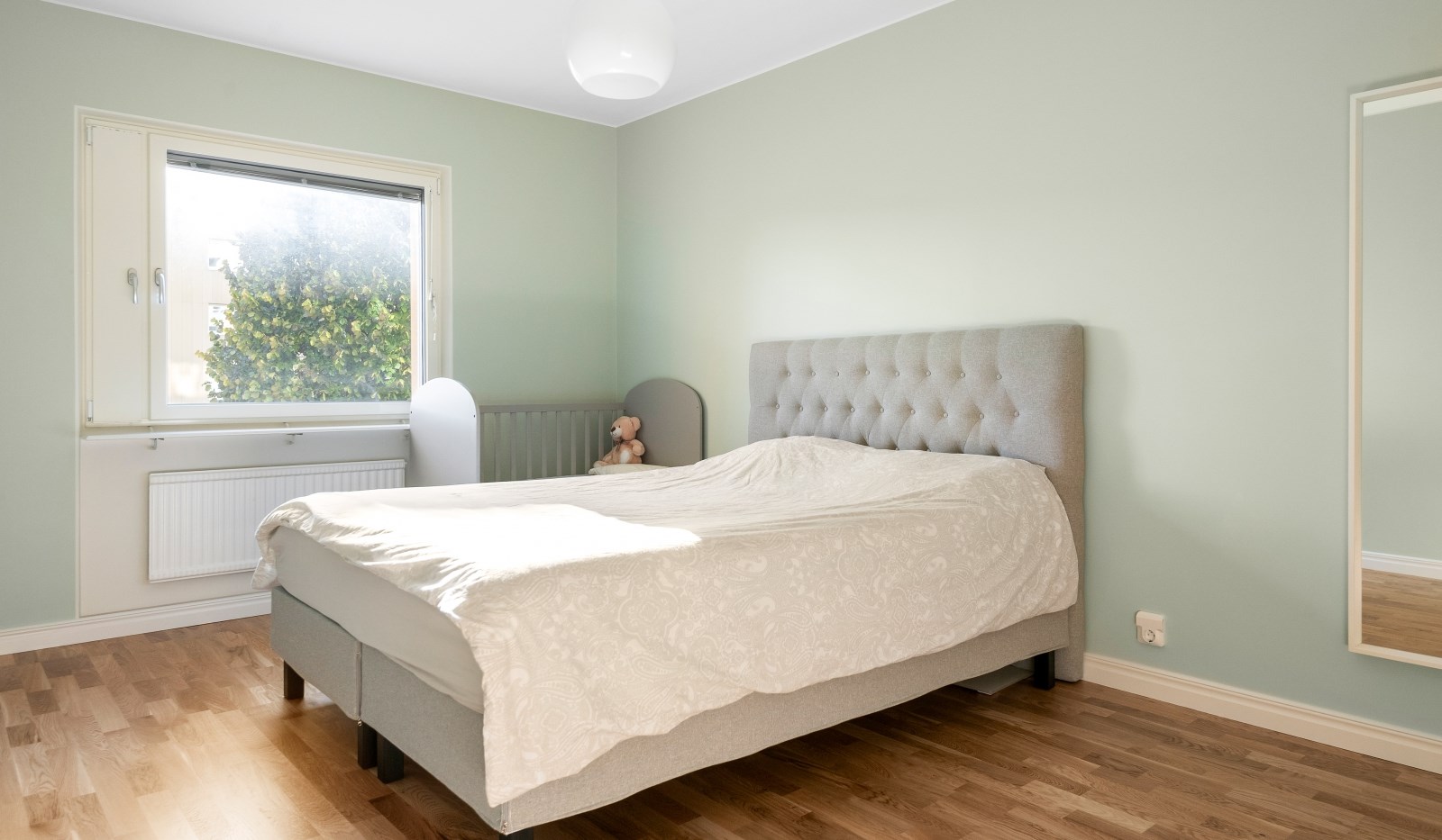 Det här är ett stort sovrum med fönster och garderober längs ena väggen med skjutdörrar. Rummet har gott om plats för en stor säng samt diverse sovrumsmöblemang.