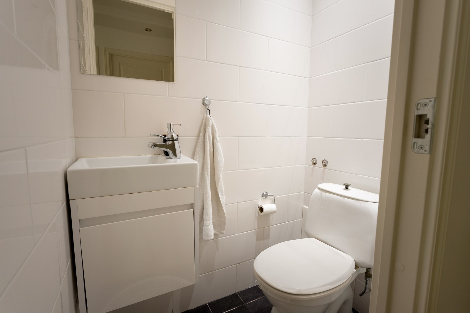 Helkaklat gästtoalett med spotbelysning i tak, wc, kommod och spegel.