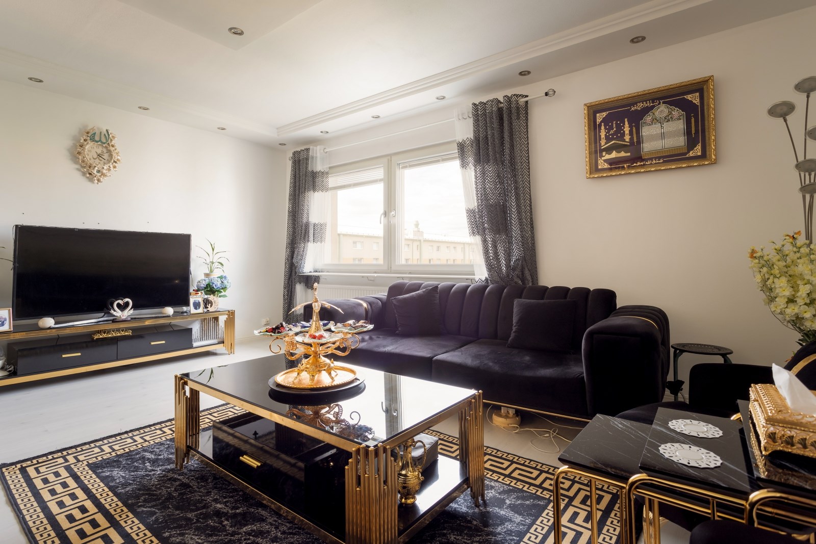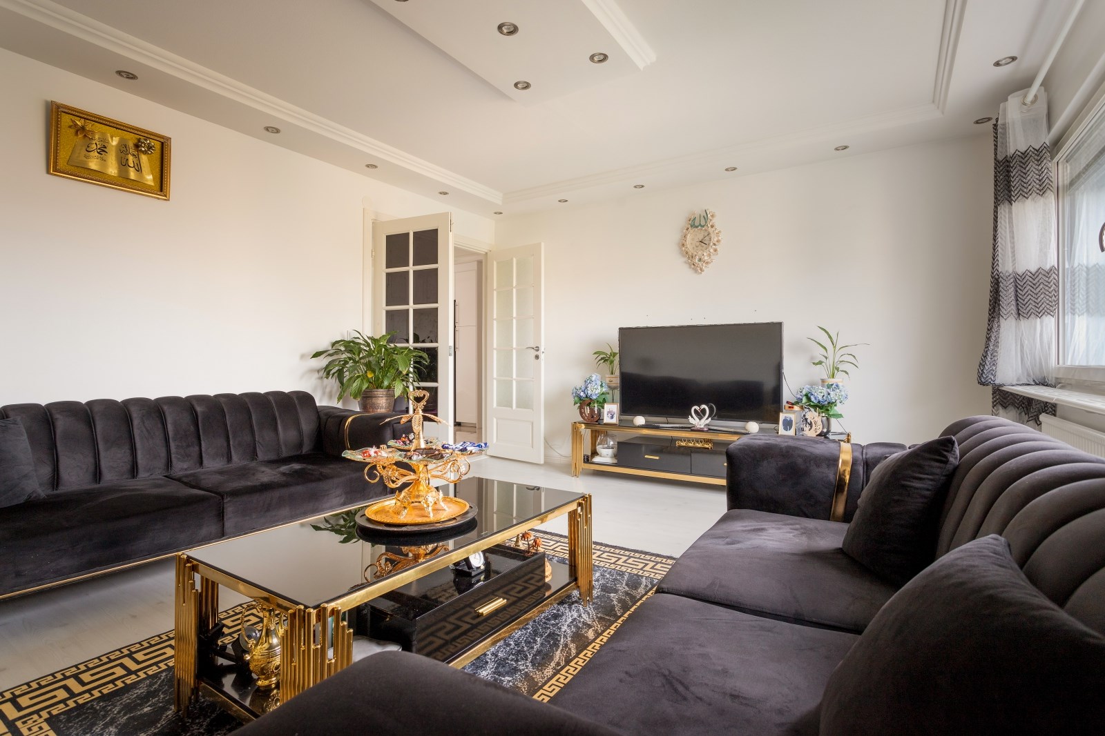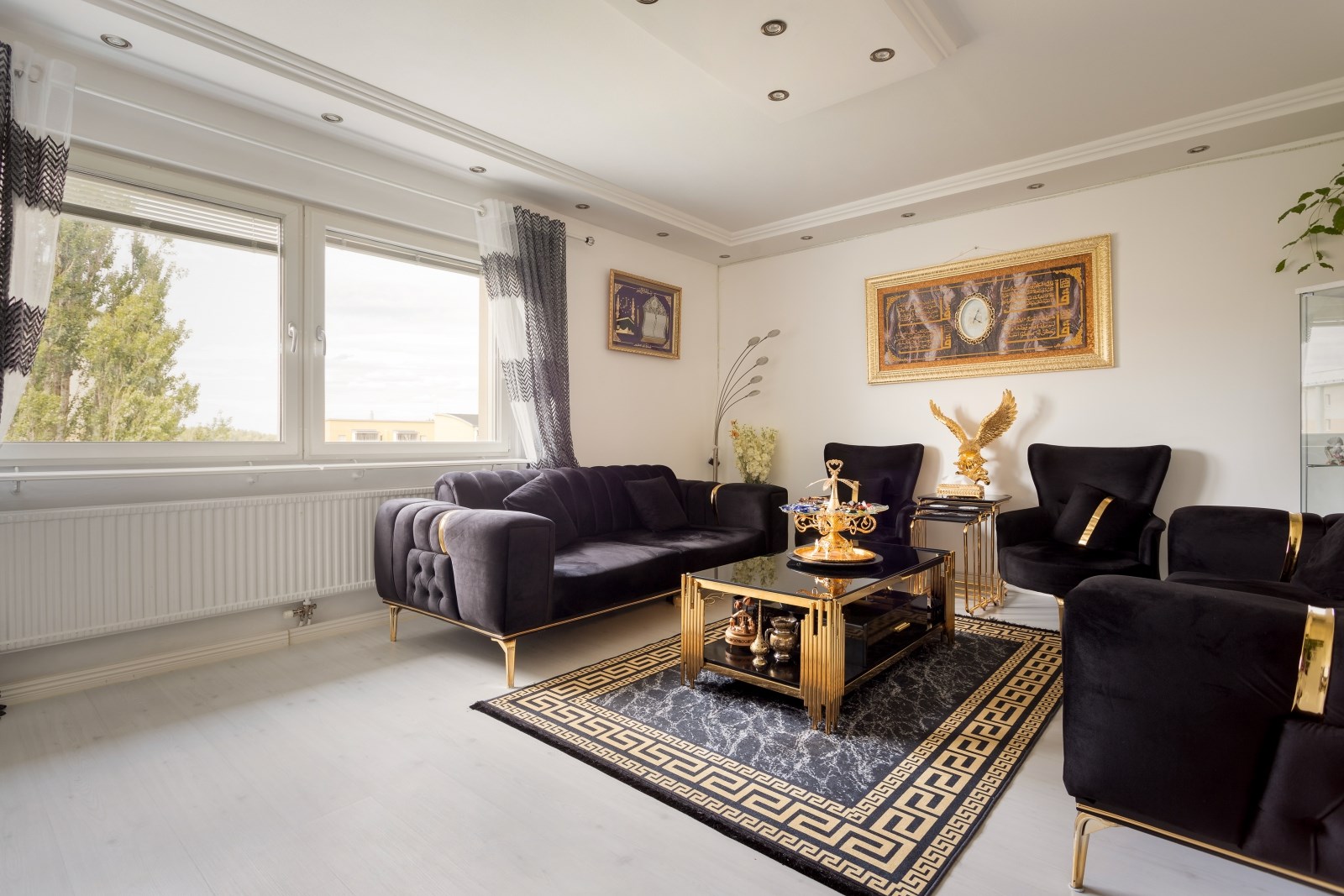 Rymligt och lättmöblerat vardagsrum med laminatgolv, målade väggar, läcker stuckatur i taket med inbyggd spotbelysning samt stora fönsterpartier som släpper in härligt ljus. Här finns gott om plats för möblemang.