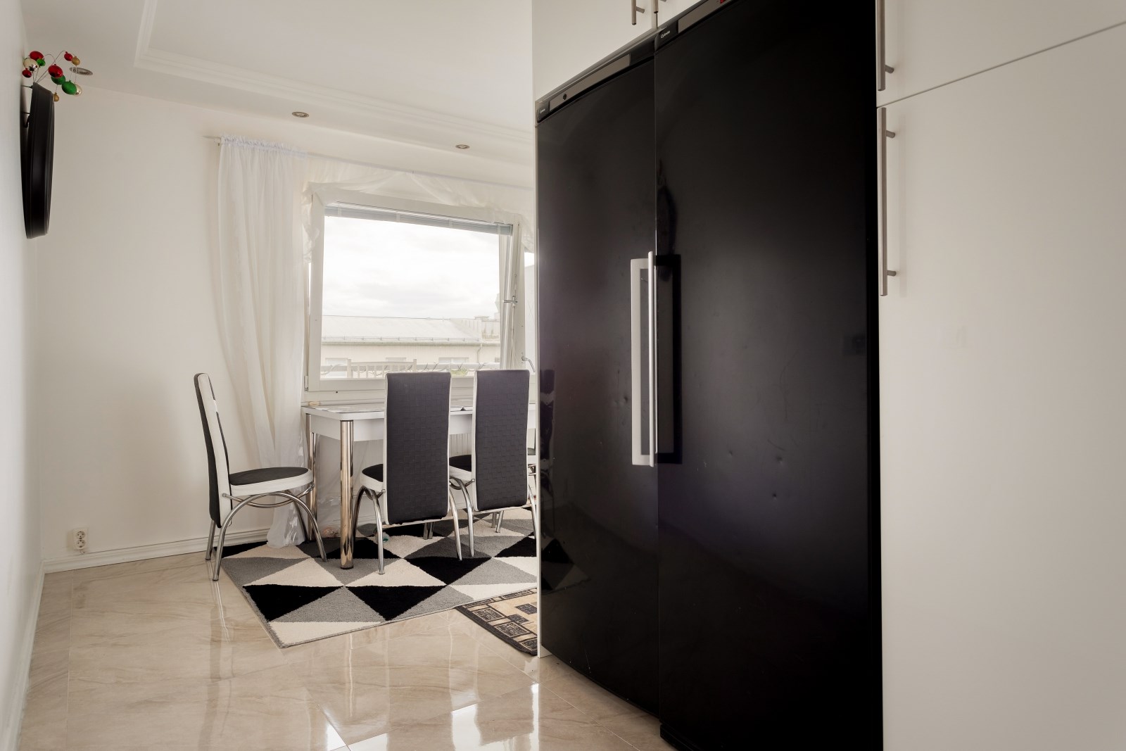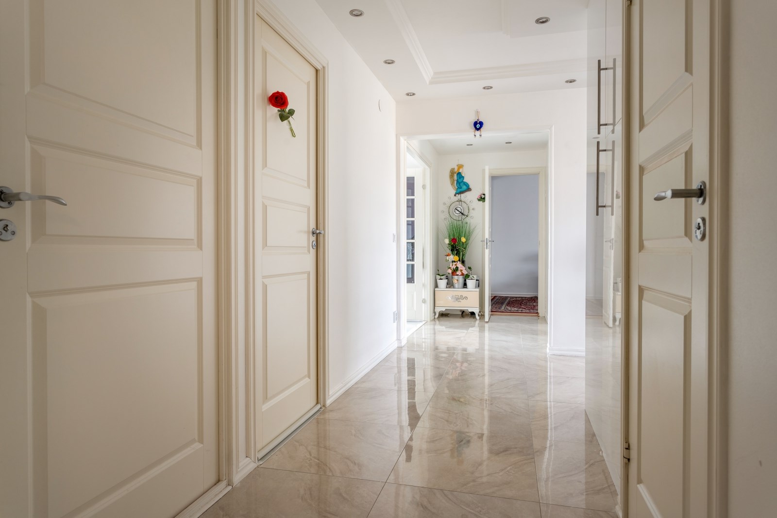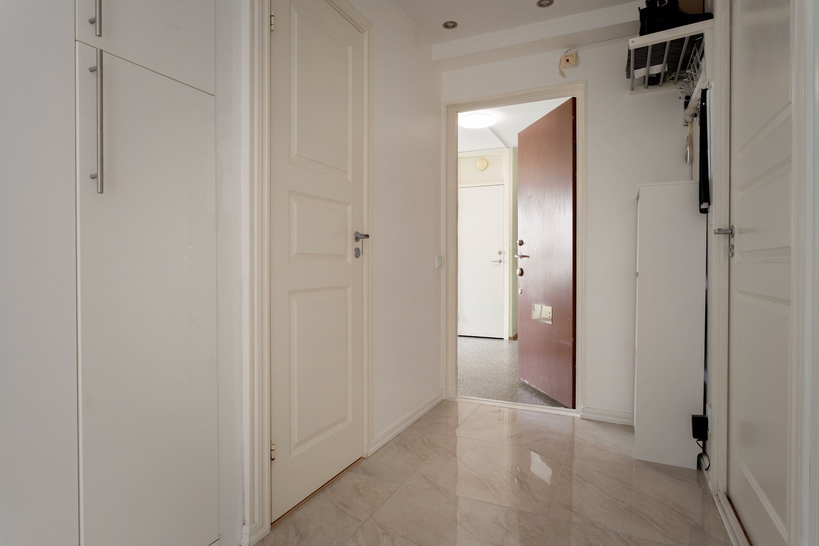 Välkomnande hall med läcker stuckatur i tak med inbyggd spotbelysning, garderob, Ljusa väggar och på golvet ligger klinker som sträcker sig in till köket. Lägenheten är utrustat med säkerhetsdörr.