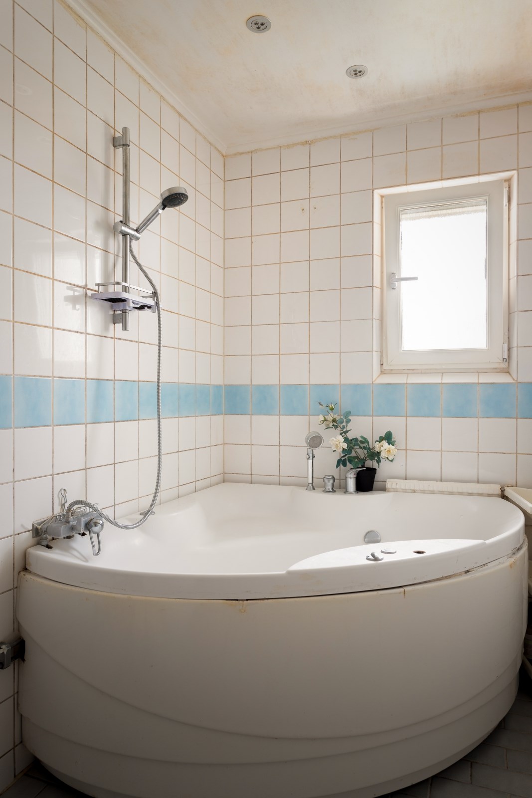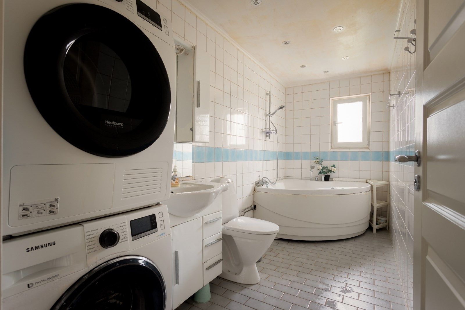 Helkaklat badrum med spotbelysning och fönster. Badrumsutrustningen består av: wc, bubbel badkar, kommod, spegelskåp, tvättmaskin och torktumlare.