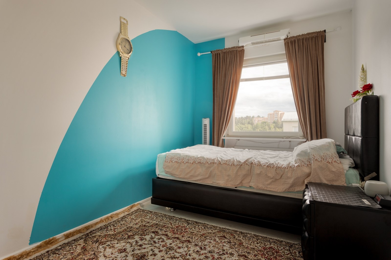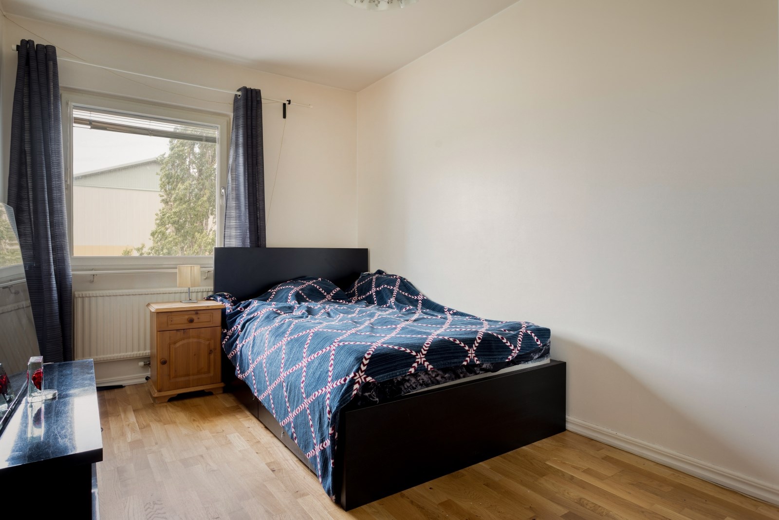 Rofyllt sovrum med laminatgolv, målade väggar och fönster.