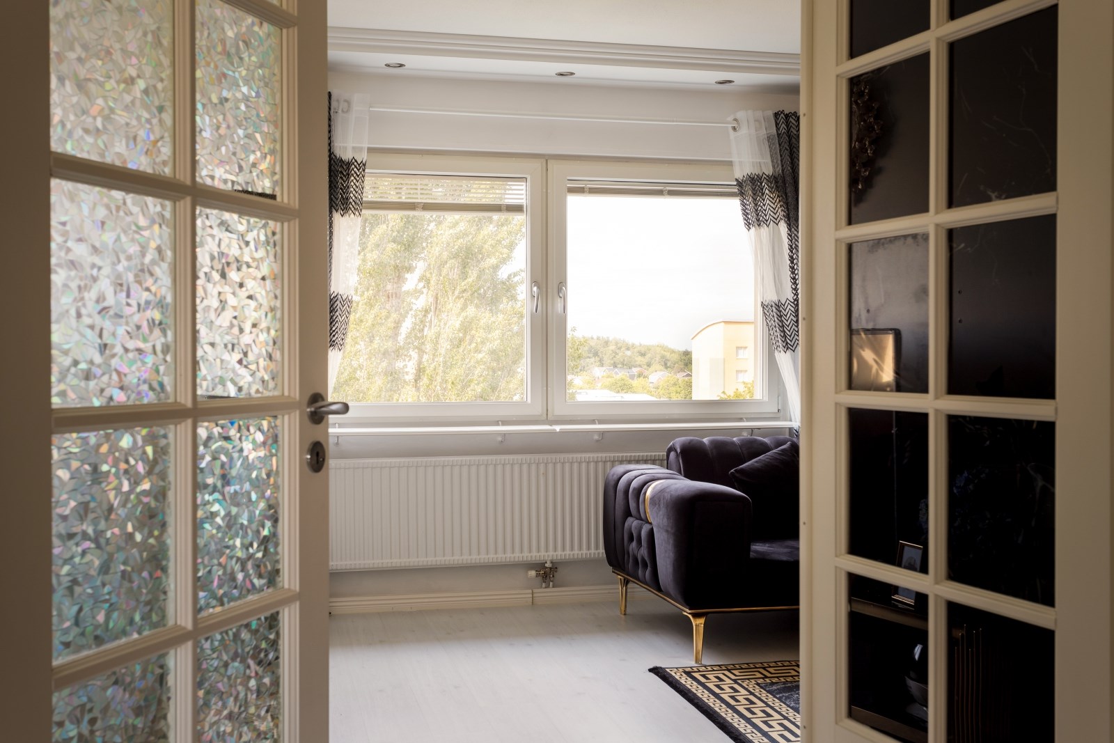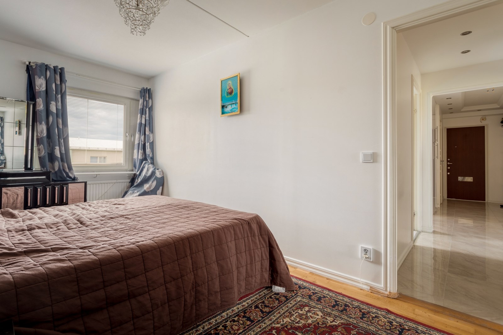 Trivsamt sovrum med parkettgolv, målade väggar och fönster.