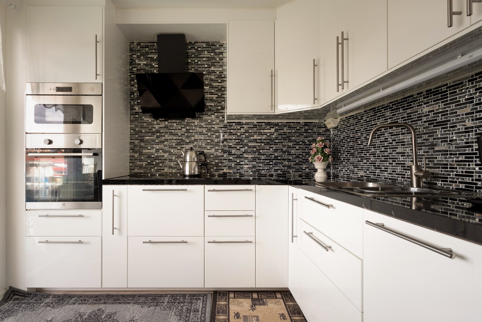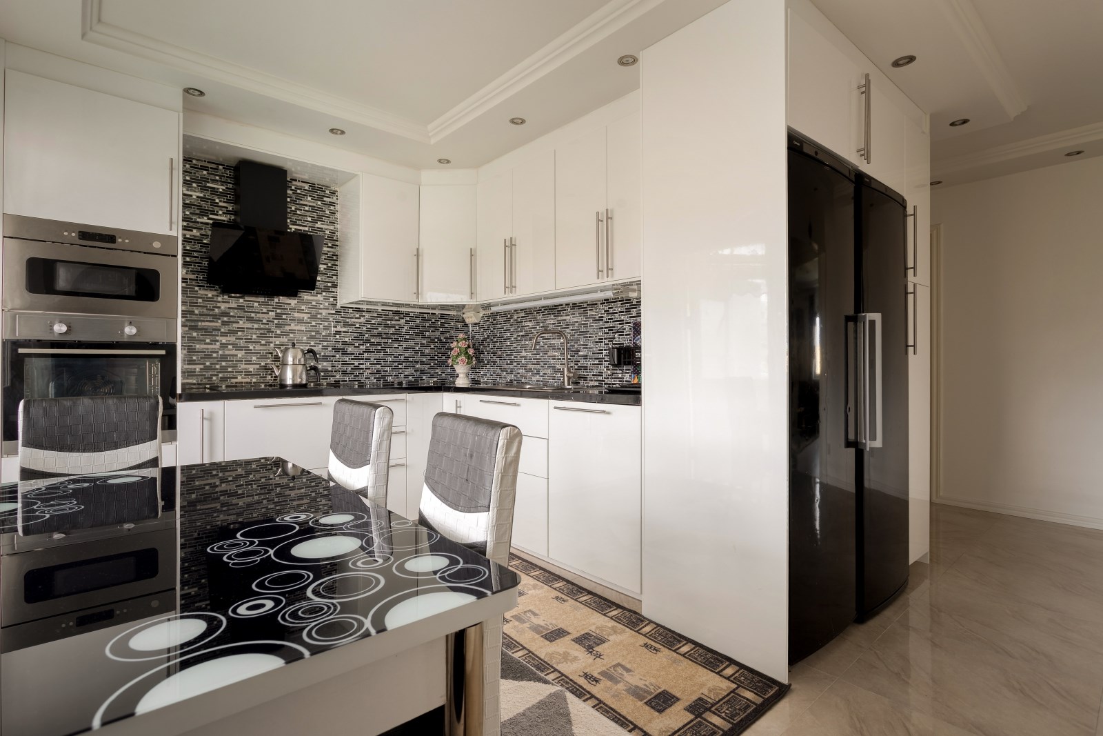 Stilrent fullutrustat kök med stuckatur i taket med inbyggd spotbelysning samt matplats invid fönstret. Här erbjuds gott om förvaring och mycket bra arbetsytor som underlättar matbestyren. Kökets maskinpark som består av: inbyggd micro, inbyggd ugn, integrerad diskmaskin, induktionshäll, fläkt, kylskåp och frys. Här blir det ett nöje att laga mat och bjuda hem gäster på middag. Från köket är det utgång till lägenhetens rymliga balkong.
