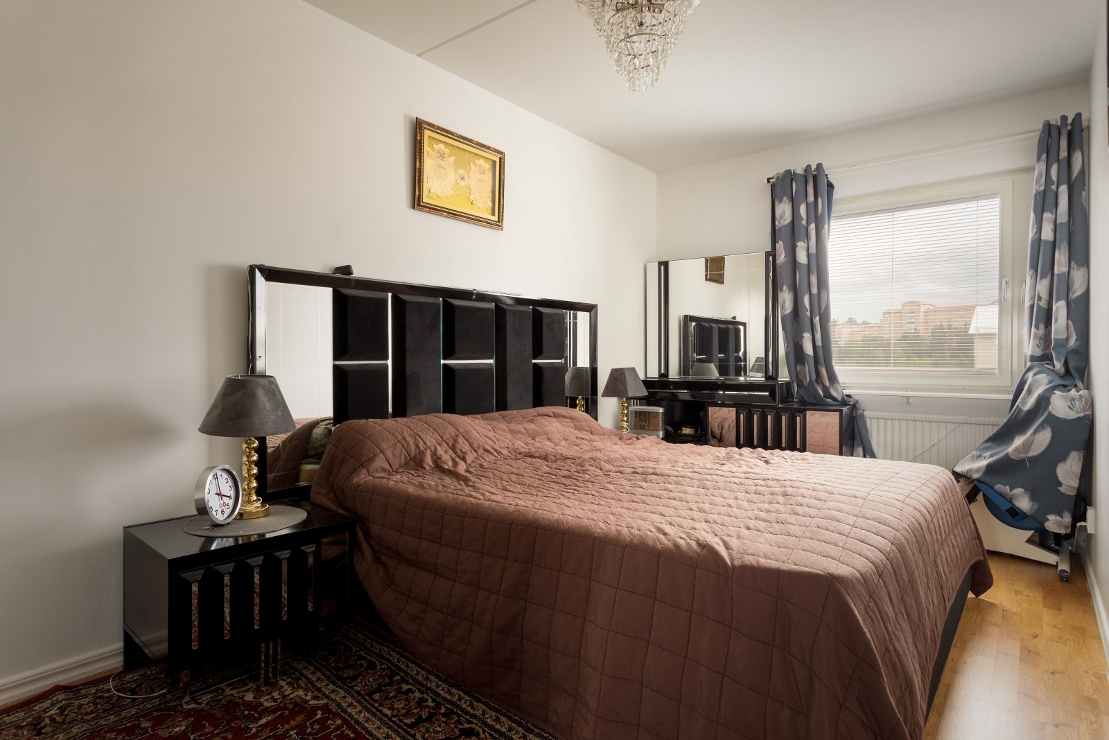 Stort sovrum med garderober, parkettgolv, målade väggar samt fönster. Här finns plats med sovrumsmöblemang såsom dubbelsäng, nattduksbord och mer därtill.