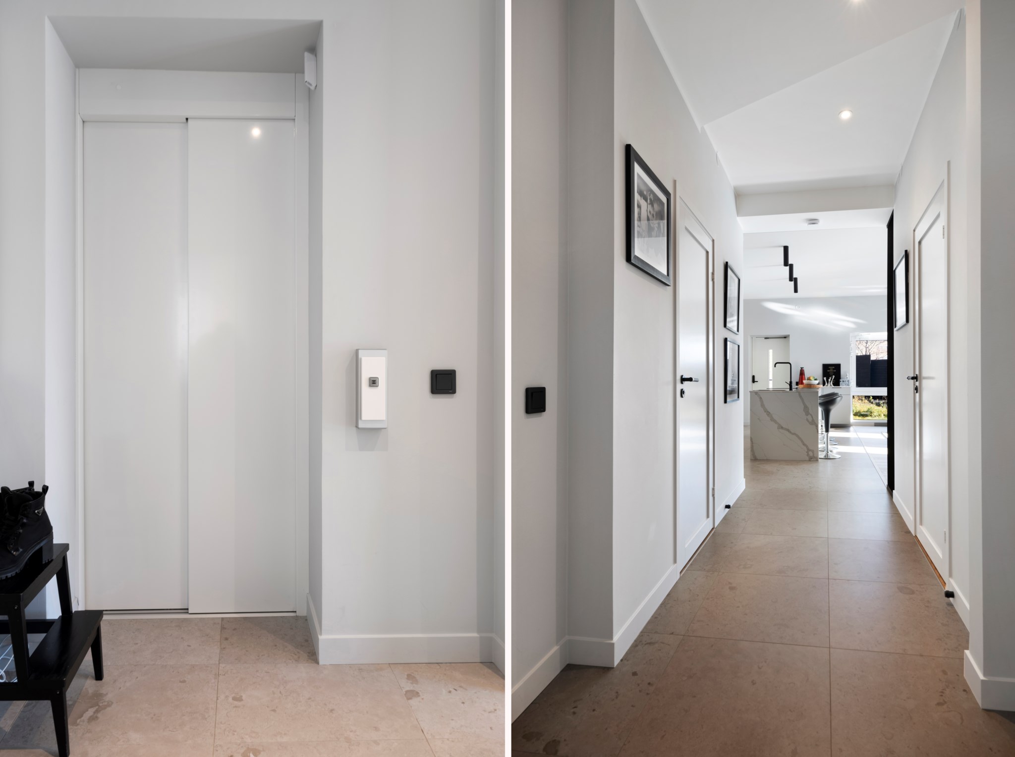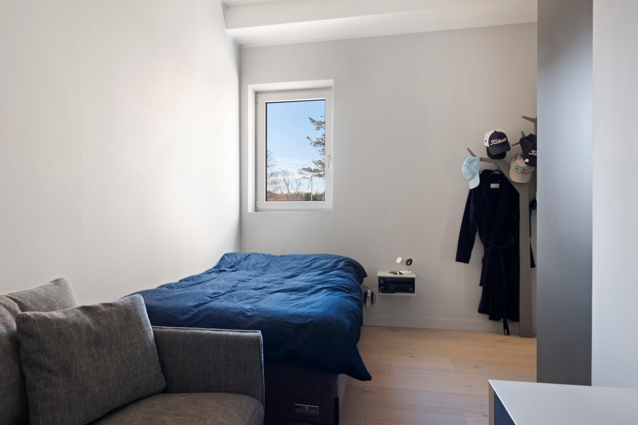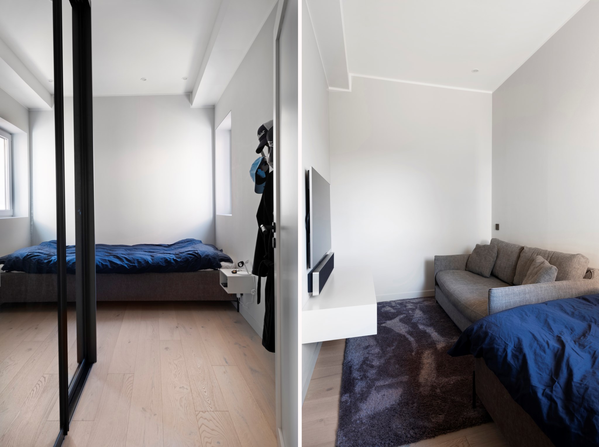 Välplanerad sovrum med goda förvaringsmöjligheter med Lux-garderober. Socklar dörrkarmar och dörrar i samma ljus gråa kulör i hela lägenheten.