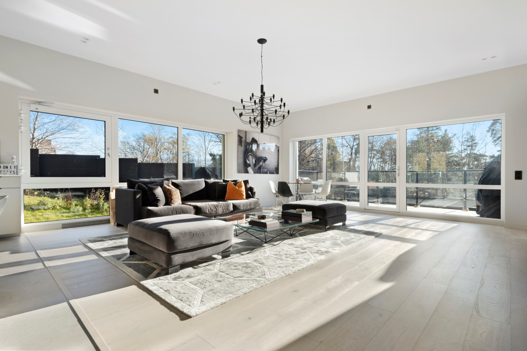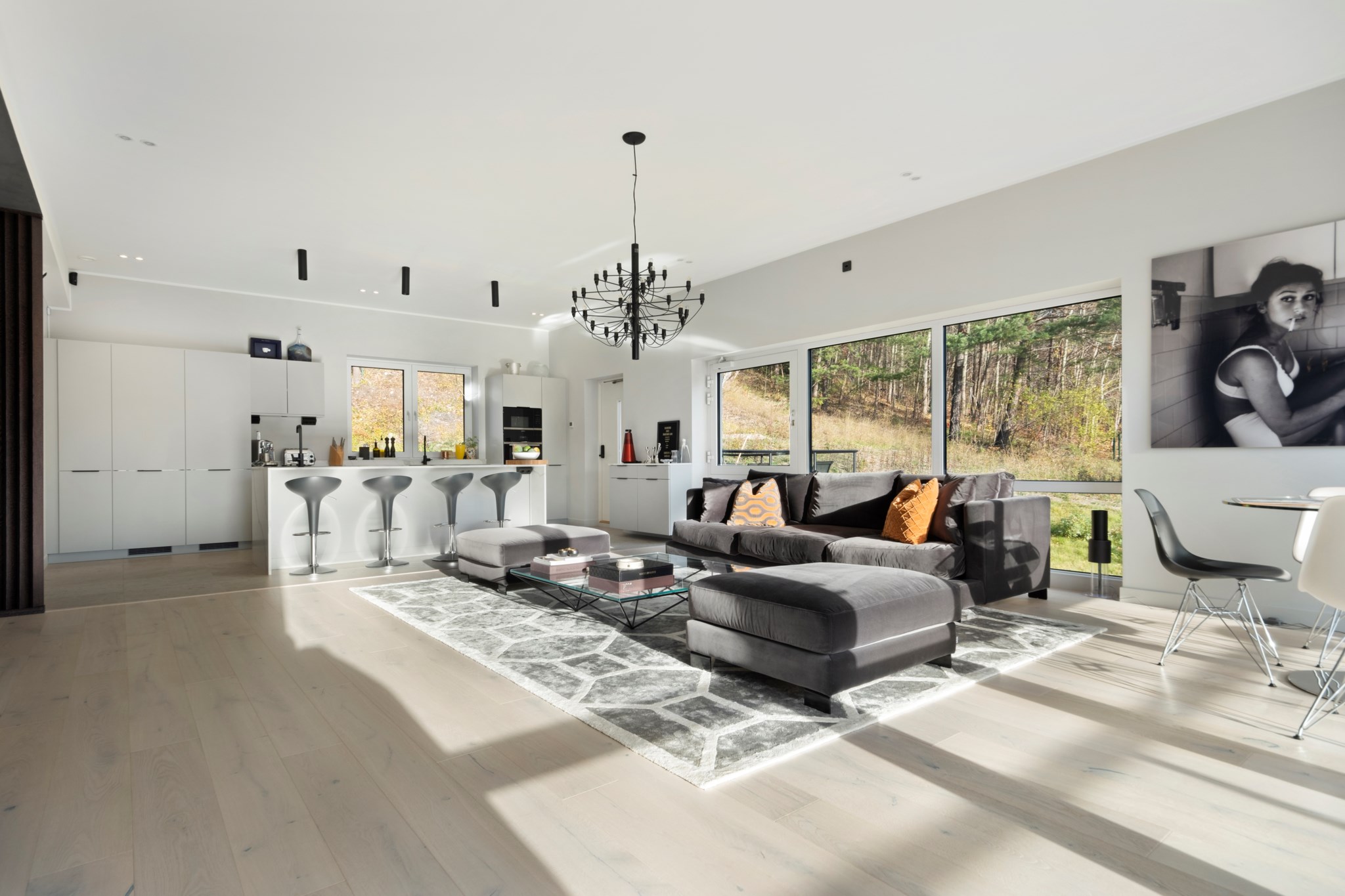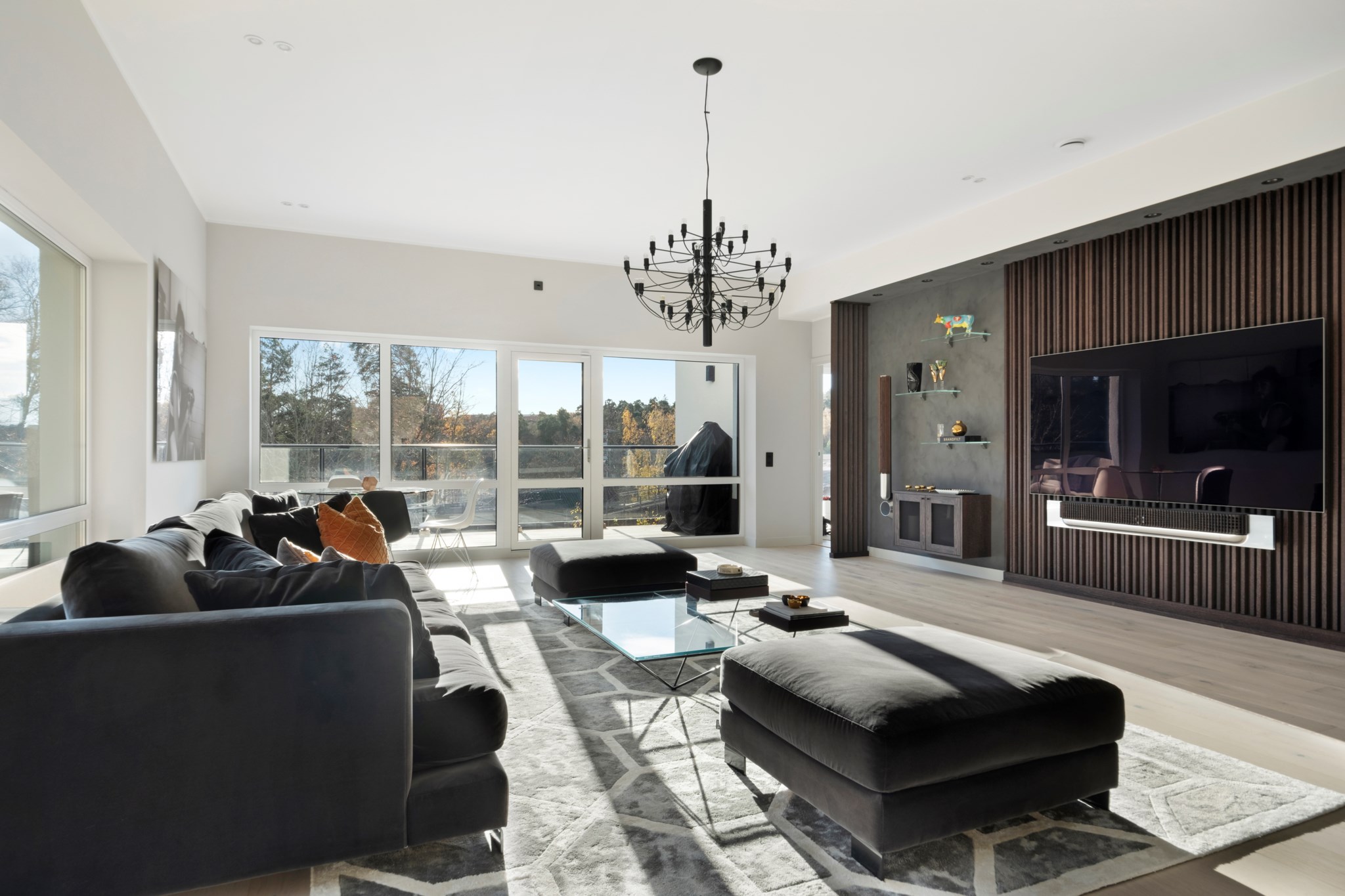 Generöst välplanerat vardagsrum som erbjuder bra möbleringsmöjligheter efter behag. Infälld ledbelysning i vardagsrummet. Här finns plats för både soffgrupp och matbord. Härligt ljusinsläpp från fina fönsterpartier och soligt läge som bidrar till en extra härlig atmosfär i vardagsrummet.