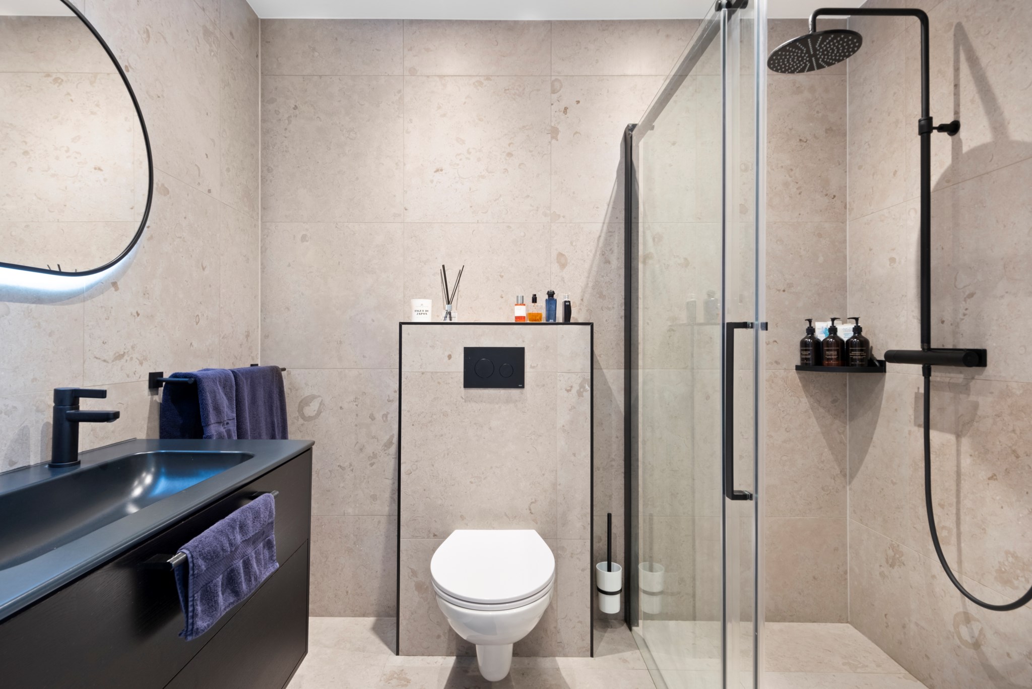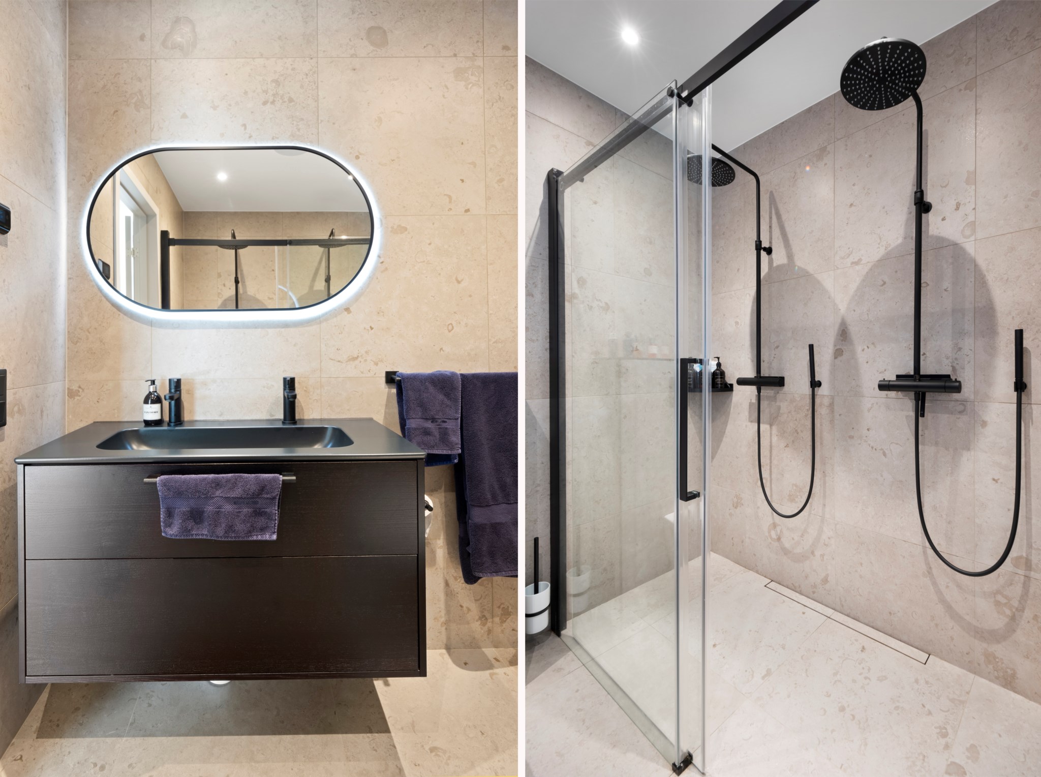 Helkaklat badrum med dubbeldusch med skjutbara glaspartier, vägghängd wc och kommod med god förvaring. Golvvärme och infällda högtalare i taket, Bluesound Powernode x 2.