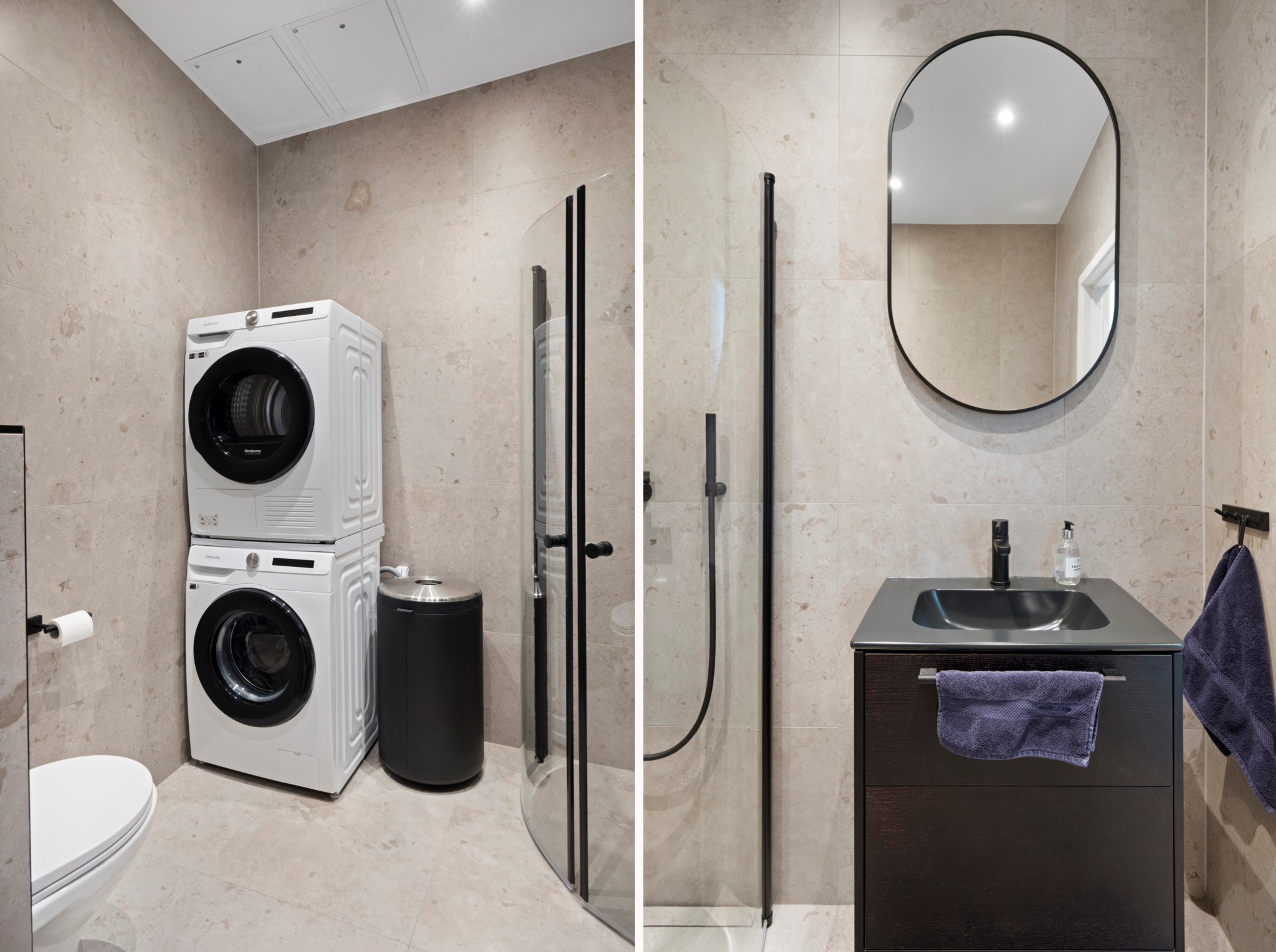 Helkaklat badrum med dusch, wc och kommod, infällda högtalare i taket. Egen tvättavdelning med tvättmaskin och torktumlare, Bluesound Powernode x 2.