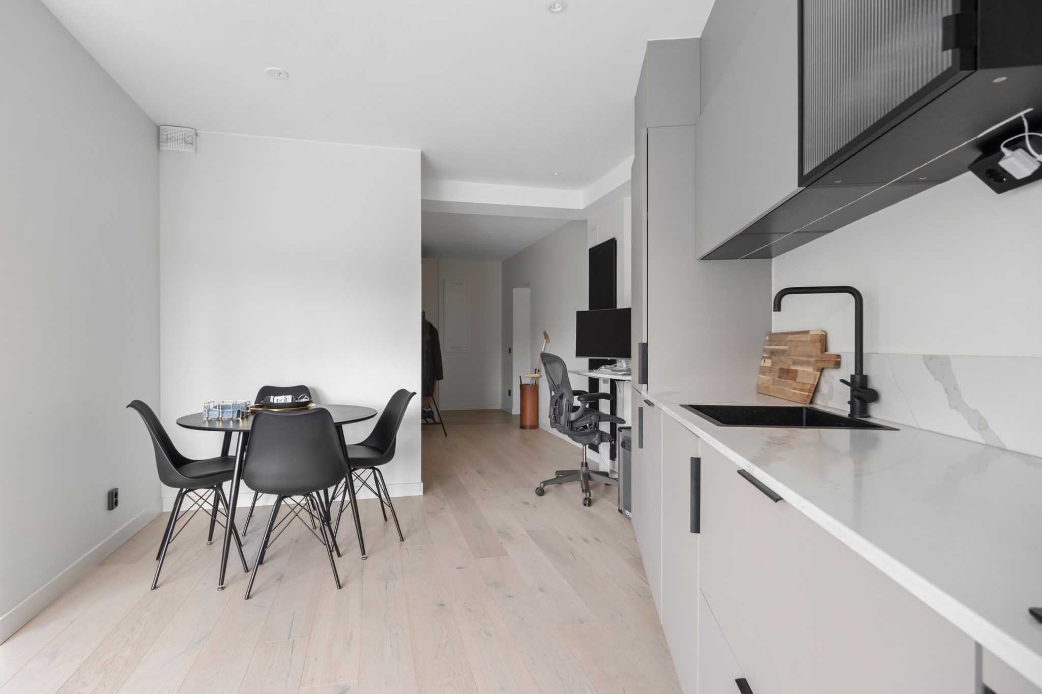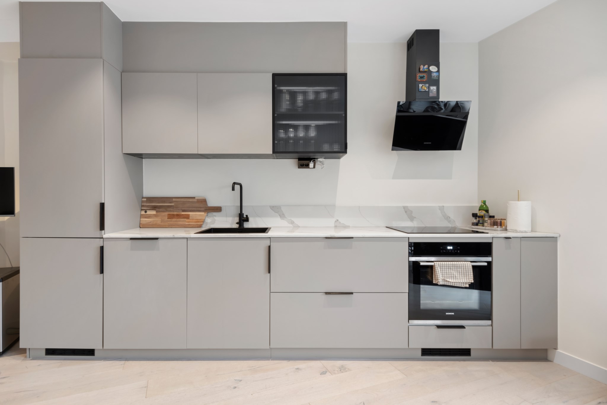 Modernt kök från Kvick med vitvaror från Siemens. Här finns integrerad kyl/frys, diskmaskin, varmluftsugn, induktionshäll och en stilig fläkt.
