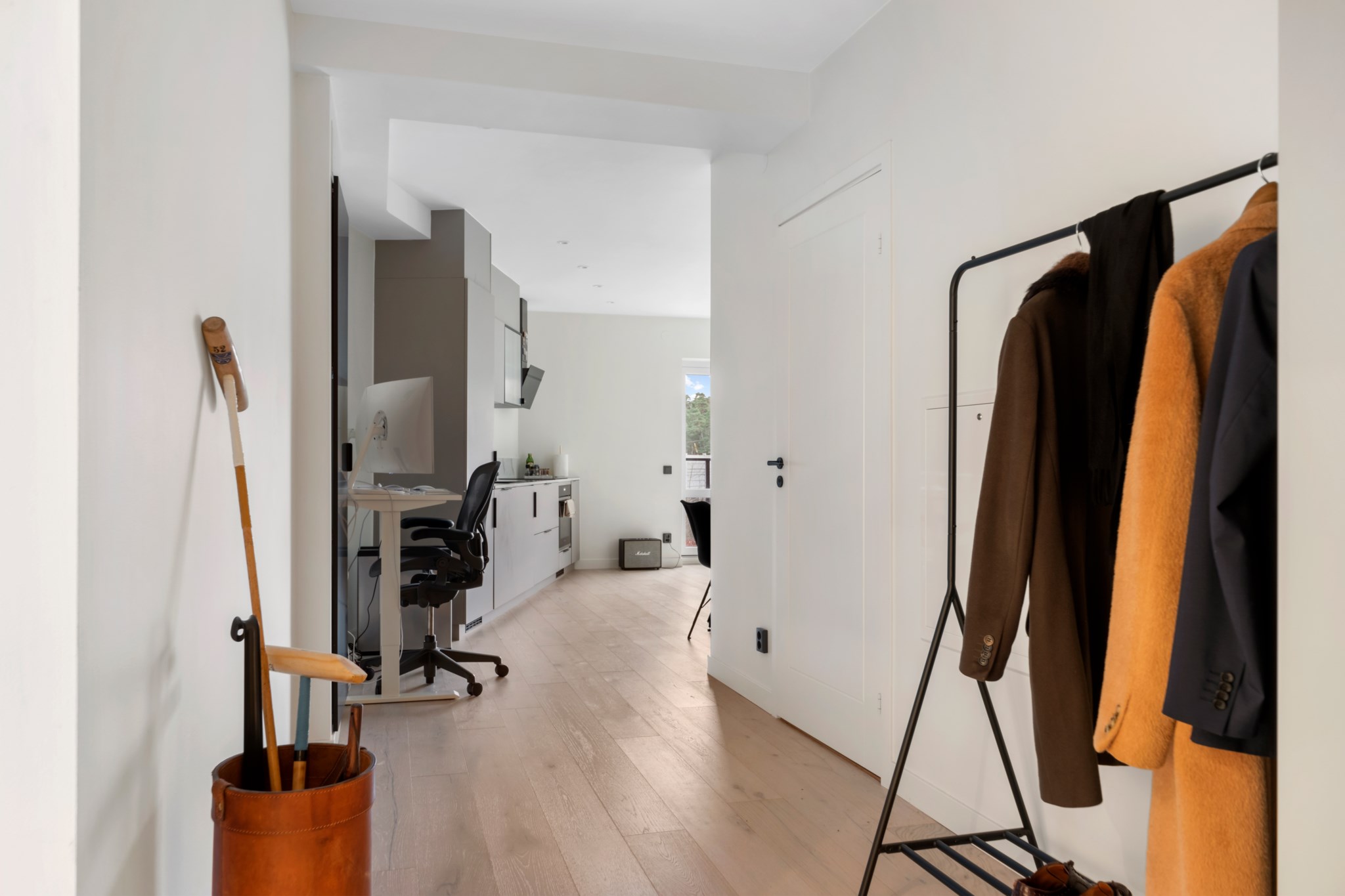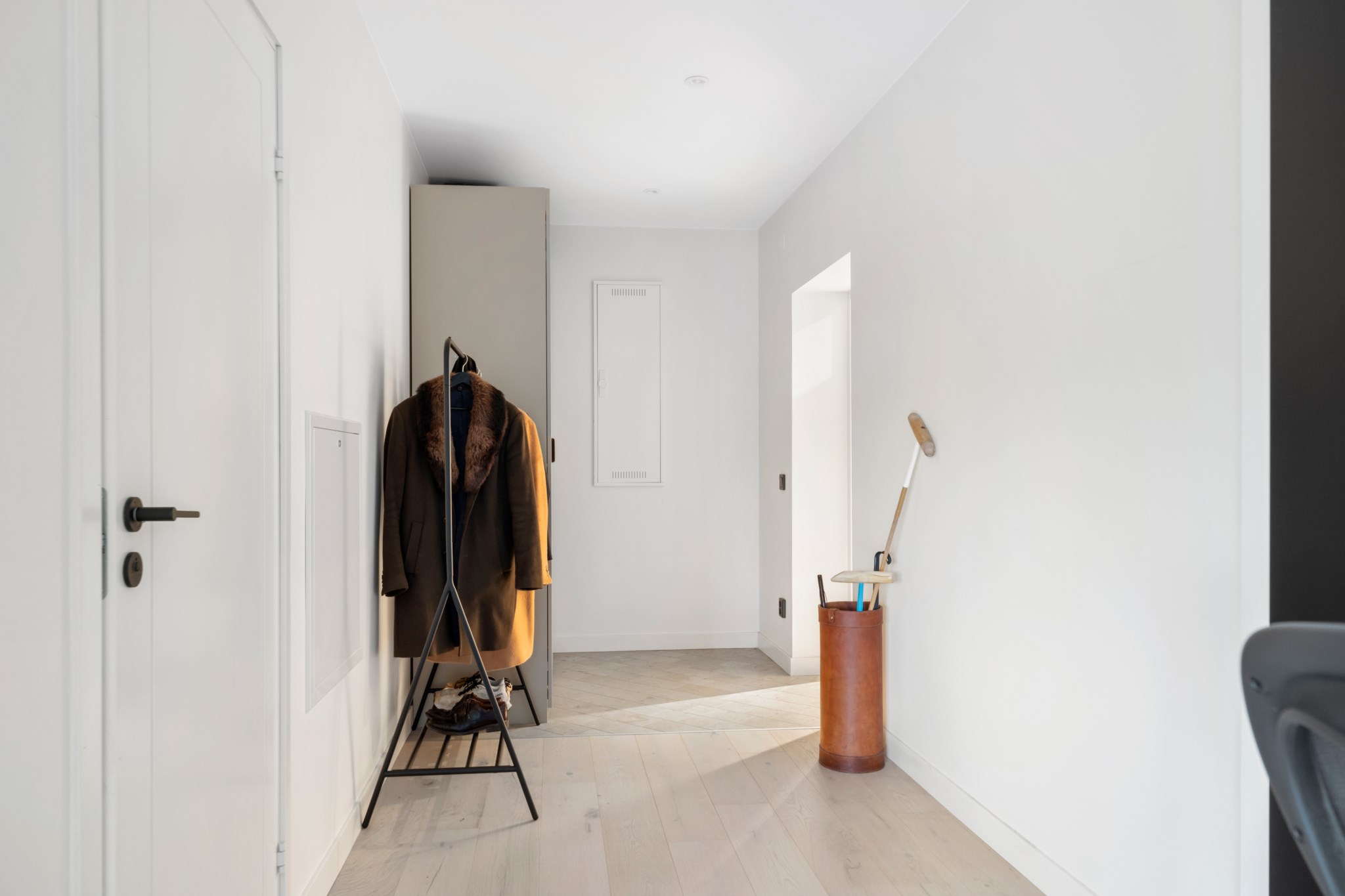 Entré til en hall med garderober för förvaring av ytterkläder och skor. I hallen finns ett städskåp.