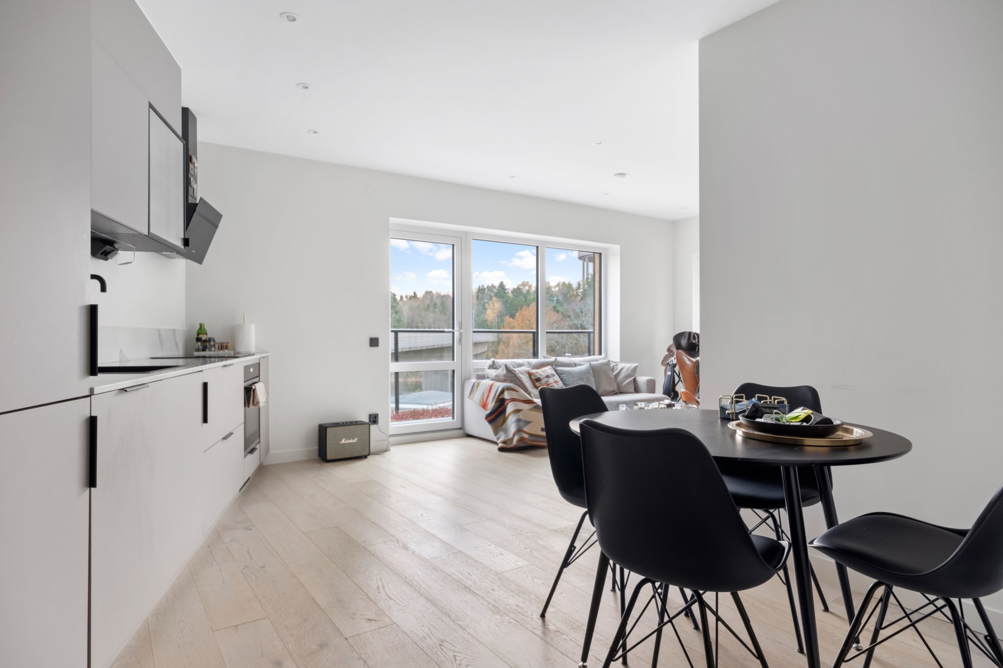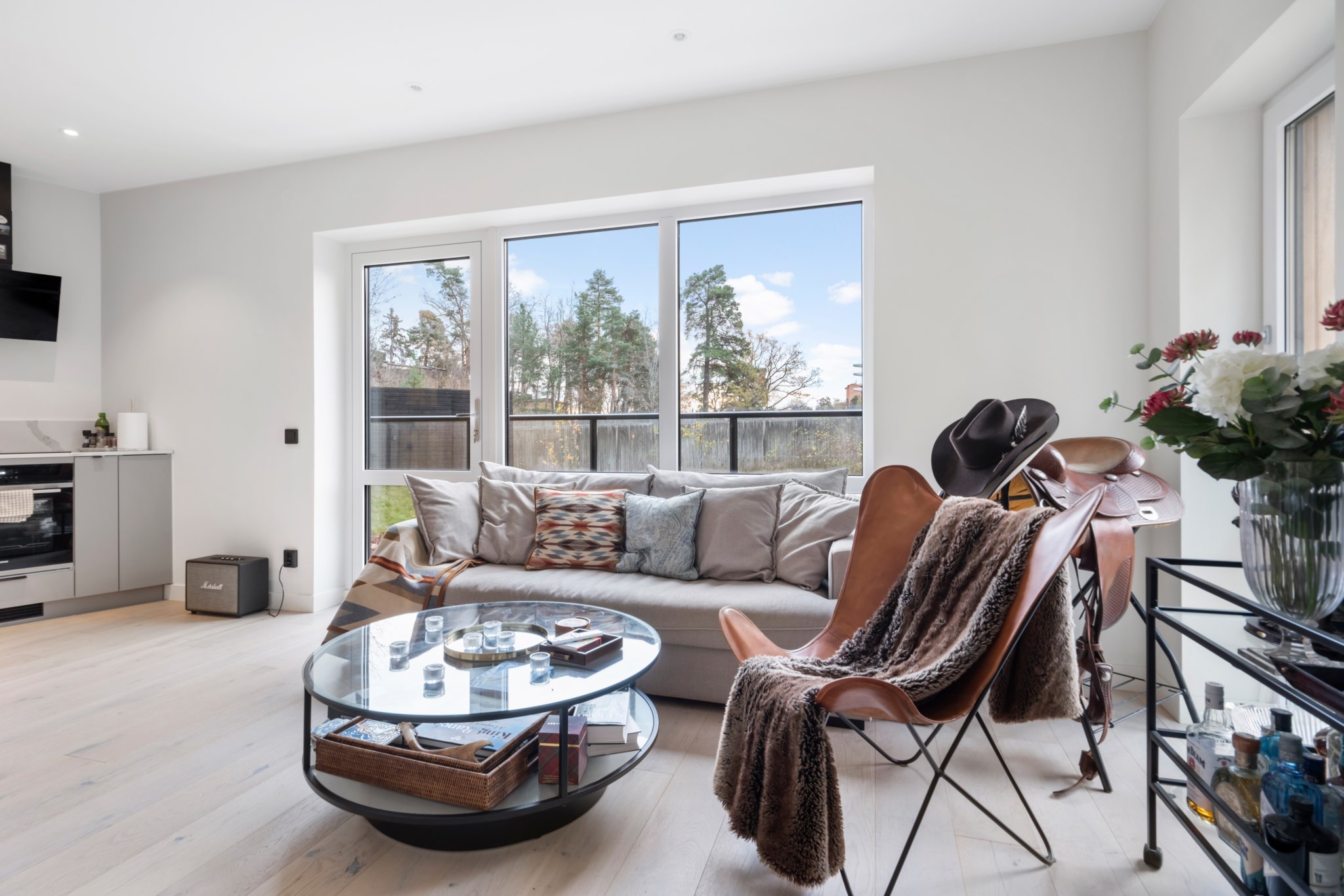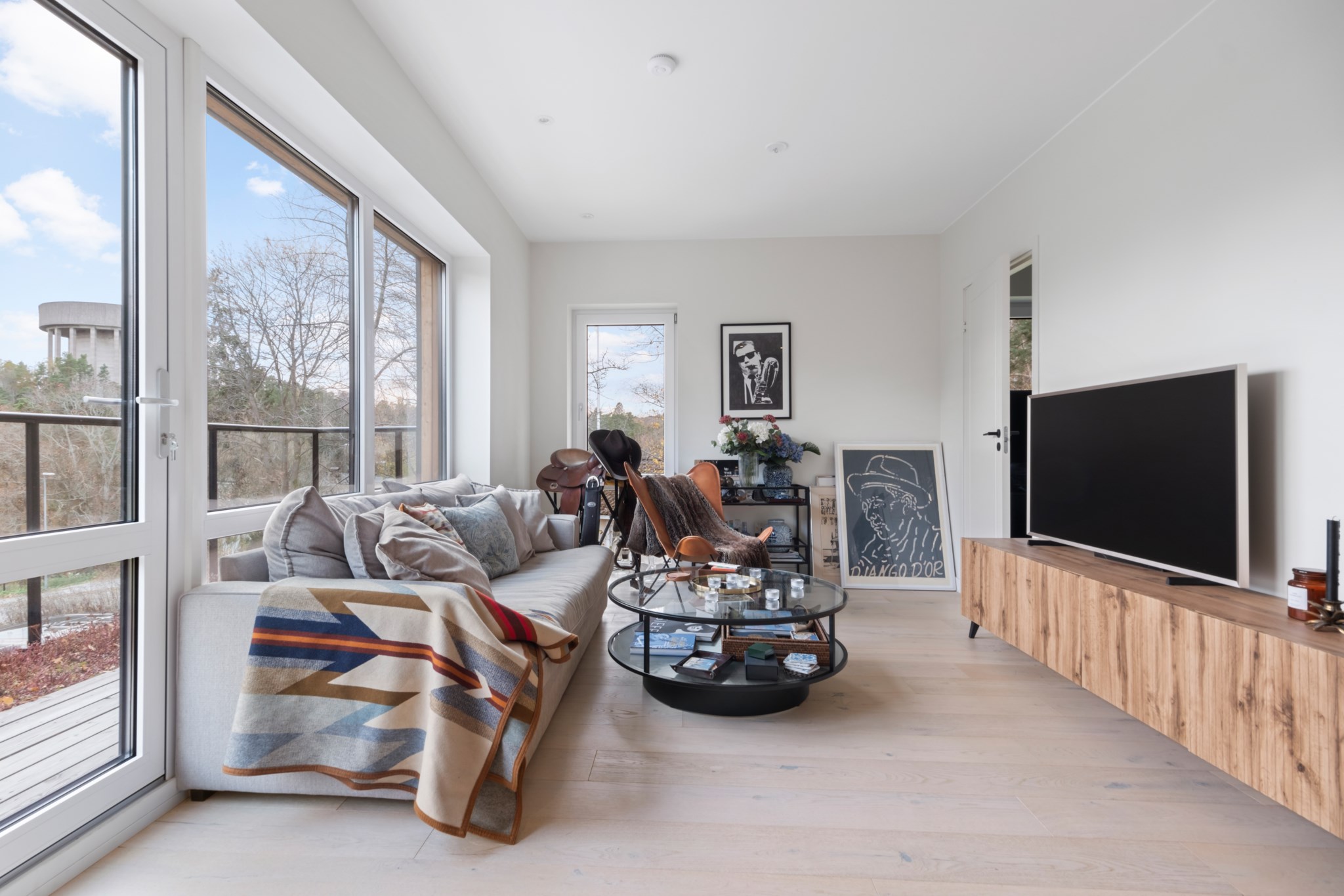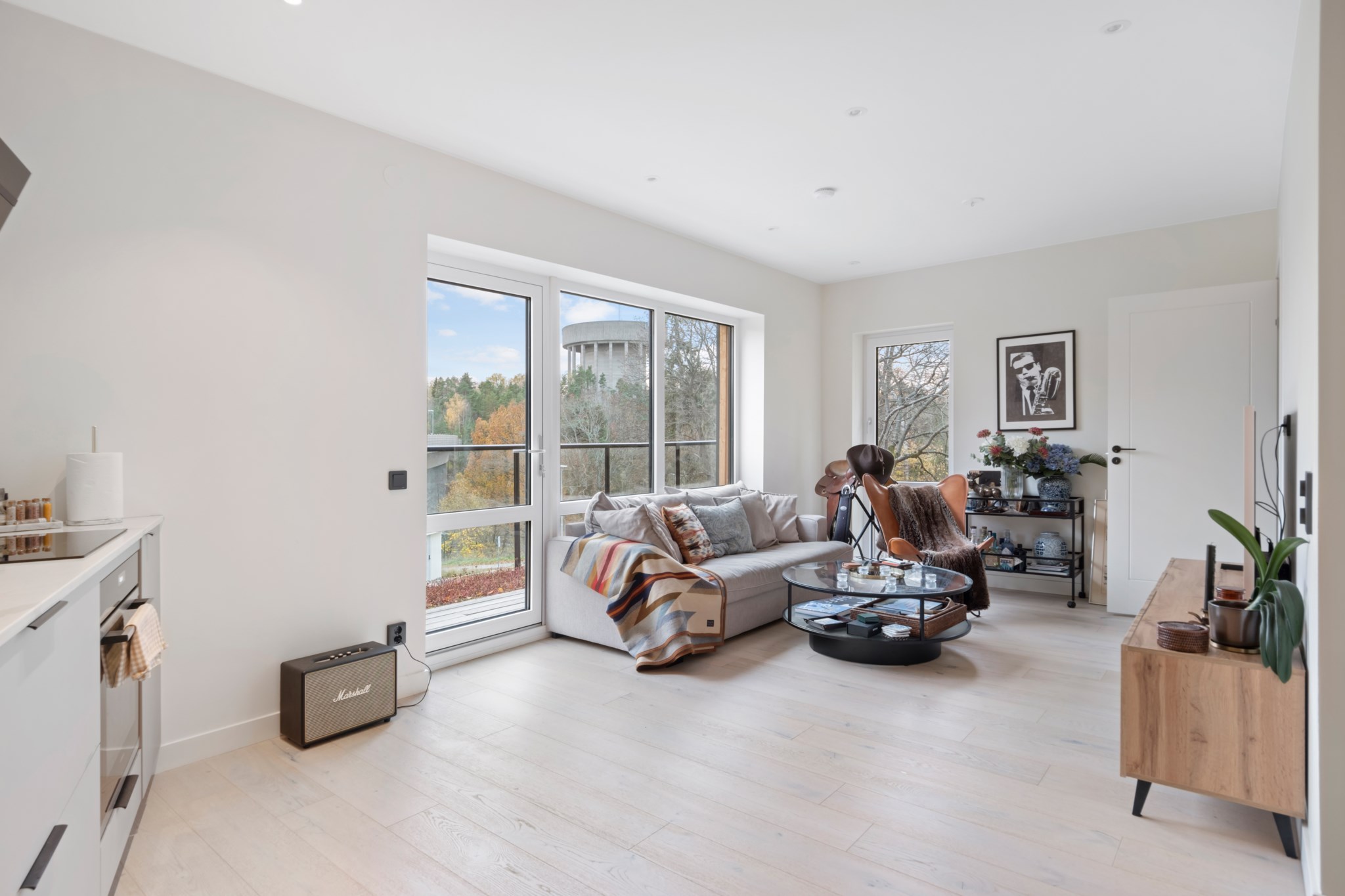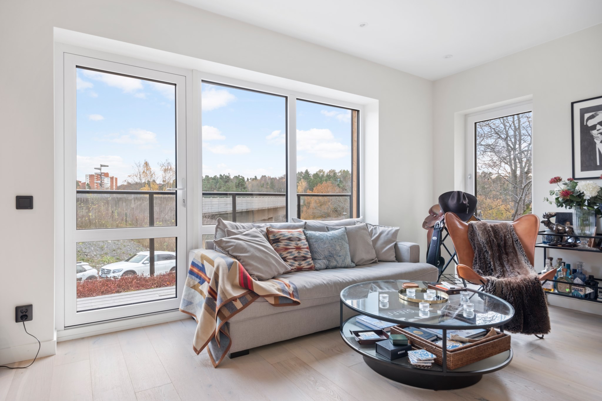 Härligt vardagsrum med fönster i två väderstreck. Här finns plats för soffgrupp och matbord, vardagsrummet är i öppen planlösning och härifrån når du balkongen som blir en förlängning av lägenheten.