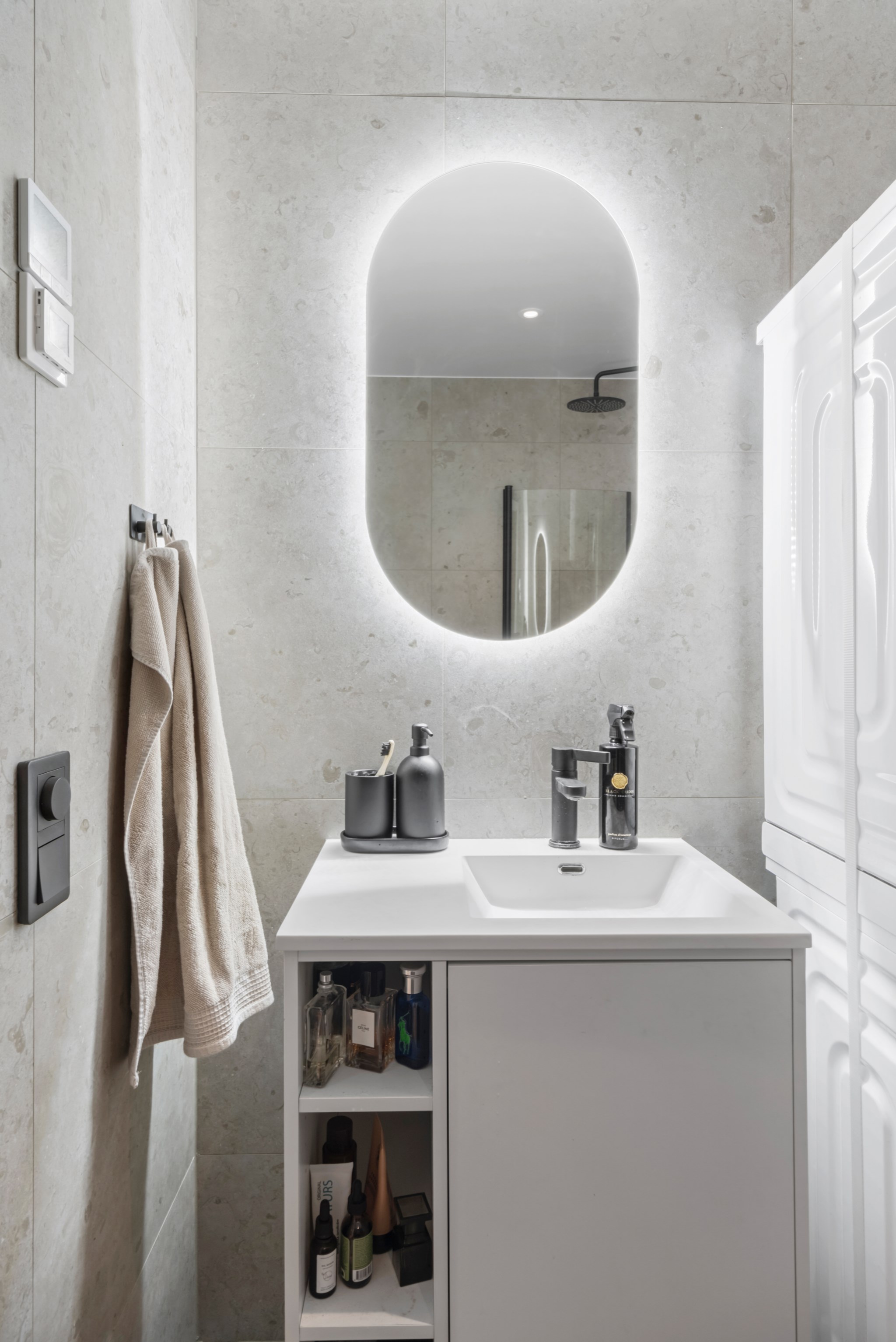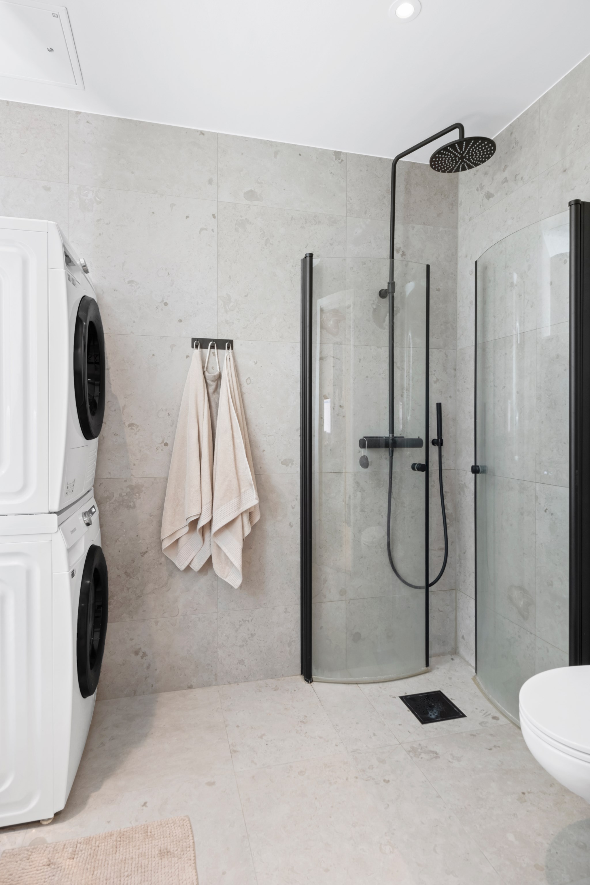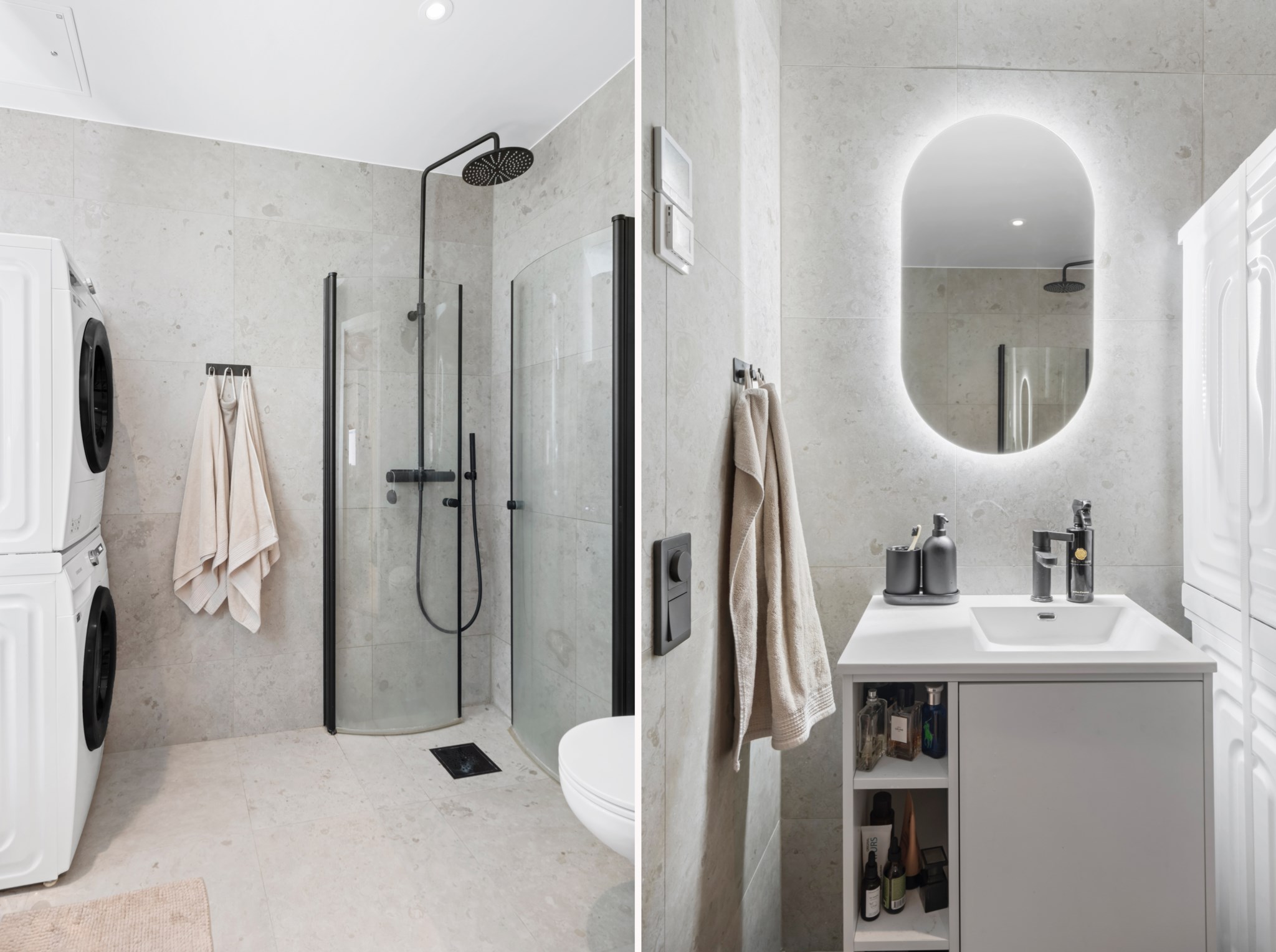 Helkaklat badrum från Bricmate, vägghängd wc, kommod och tvättställ, spegel med ledbelysning, tvättmaskin och torktumlare i pelare. I badrummet finns en dusch med vikbara glasväggar, samtliga blandare kommer från Tapwell. I badrummet finns golvvärme.