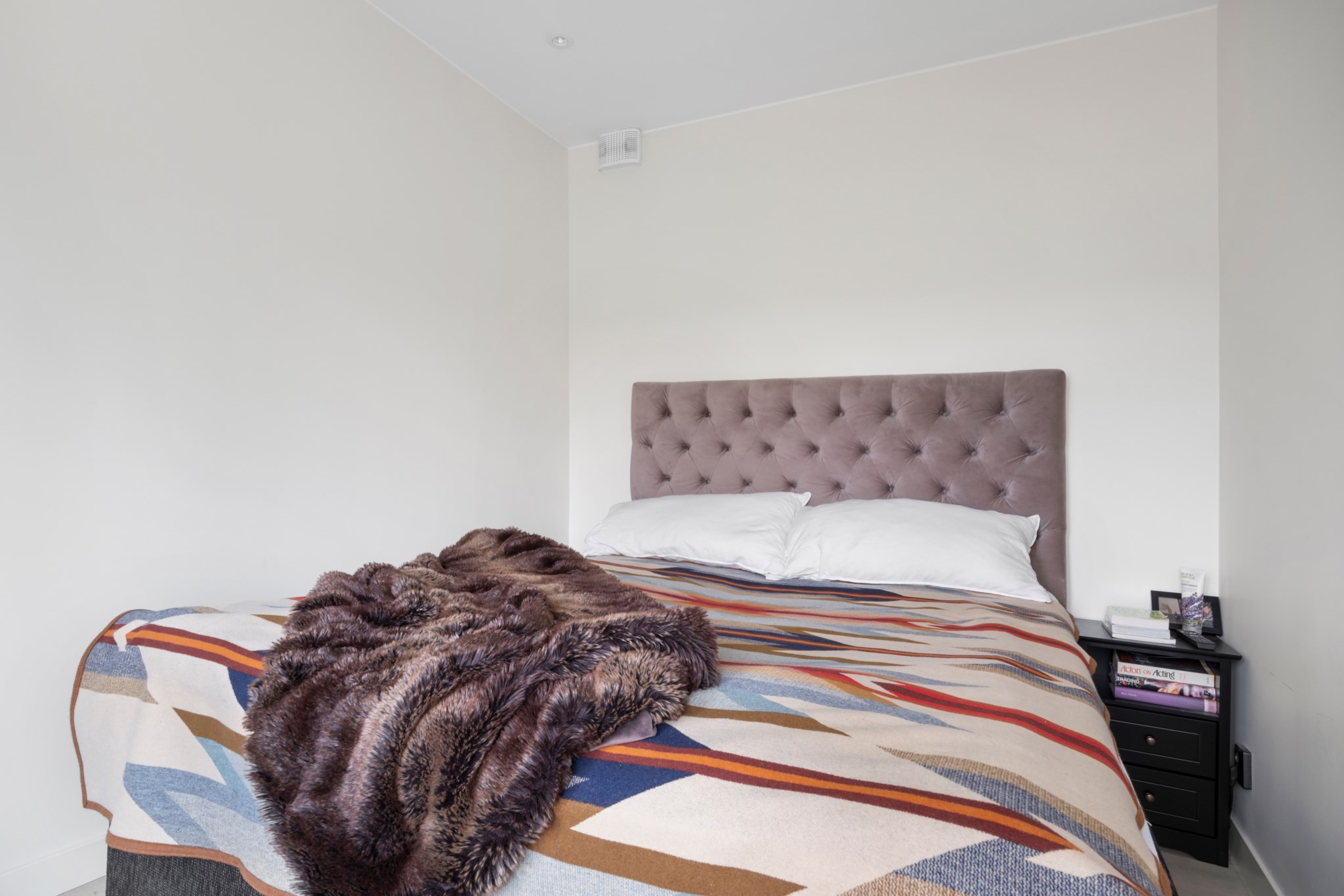 Rymligt sovrum med plats för en dubbelsäng. På golvet finns vackert enstavsparkett samt målade väggar vilket är genomgående i hela lägenheten.