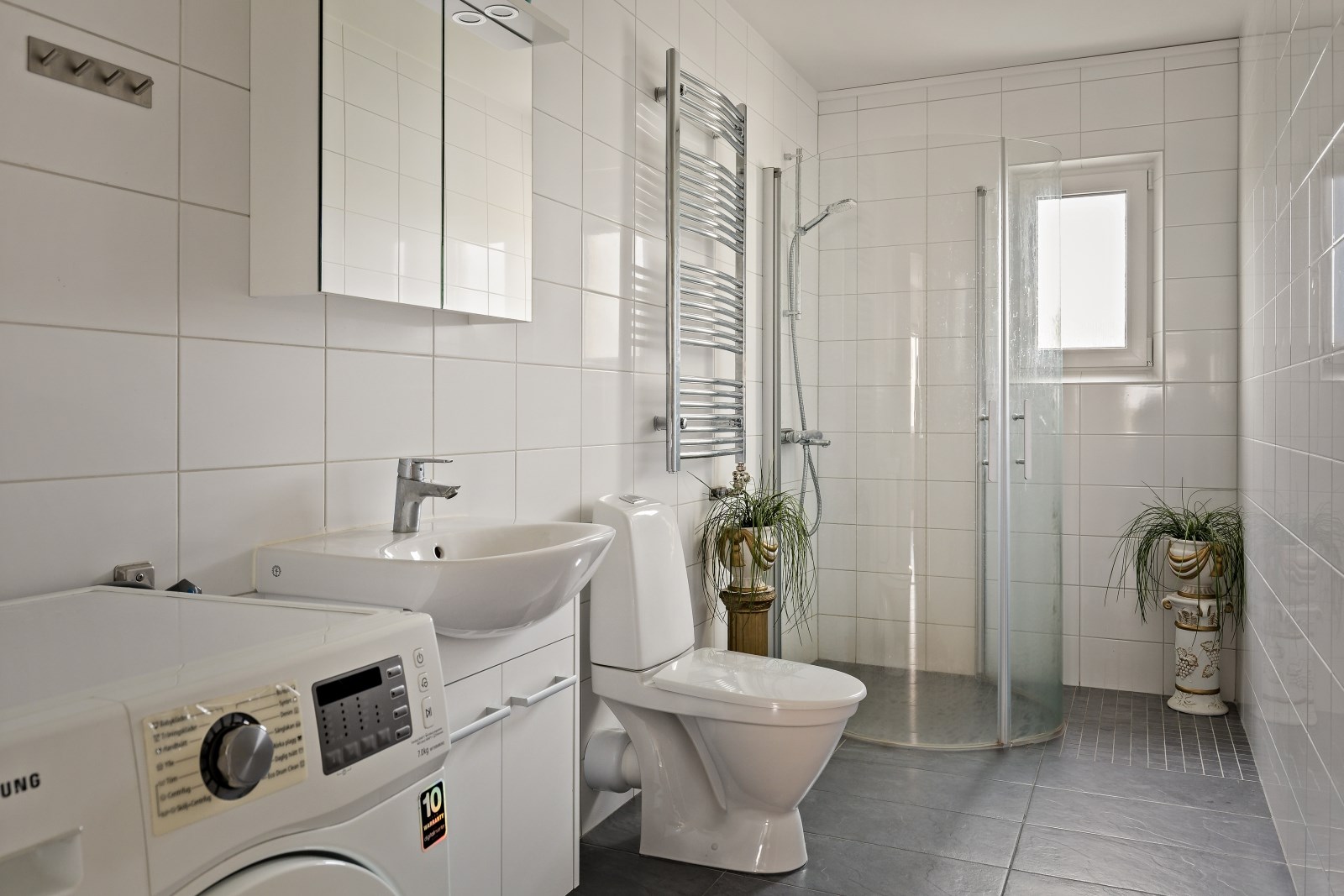 Stort stambytt helkaklat badrum. Badrummet är utrustat med wc, dusch, vattenburen handdukstork, kommod, badrumsskåp. Det finns också tvättmaskin och ett mindre fönster för enkel vädring.