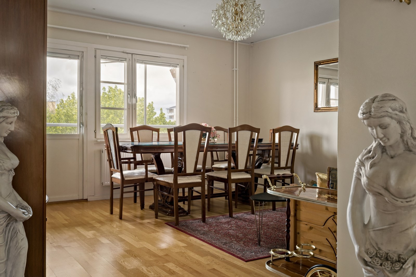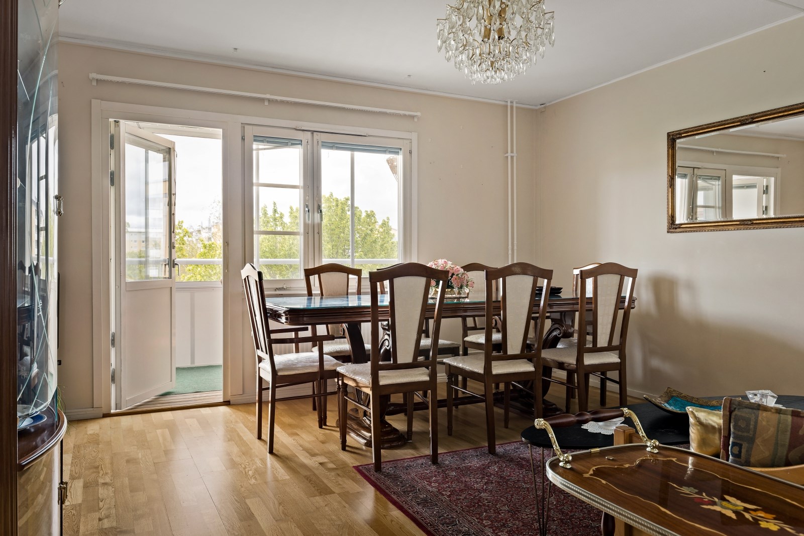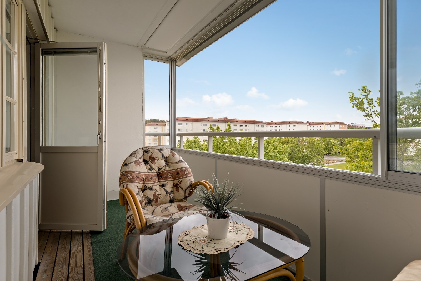 Rymligt och lättmöblerat vardagsrum med parkettgolv och stora fönsterpartier som släpper in härligt ljus. Rummet har gott om plats för möblemang. Från vardagsrummet nås lägenhetens inglasade balkong som bjuder på fin utsikt över omgivningen. Här finns gott om plats att möblera med utemöbler och blommor. Det här kan bli en riktigt mysig plats för avkoppling där de praktiska skjutbara glasdörrarna kan öppnas upp eller stängas till efter säsong. Inglasningen möjliggör också en utökad användning under året.