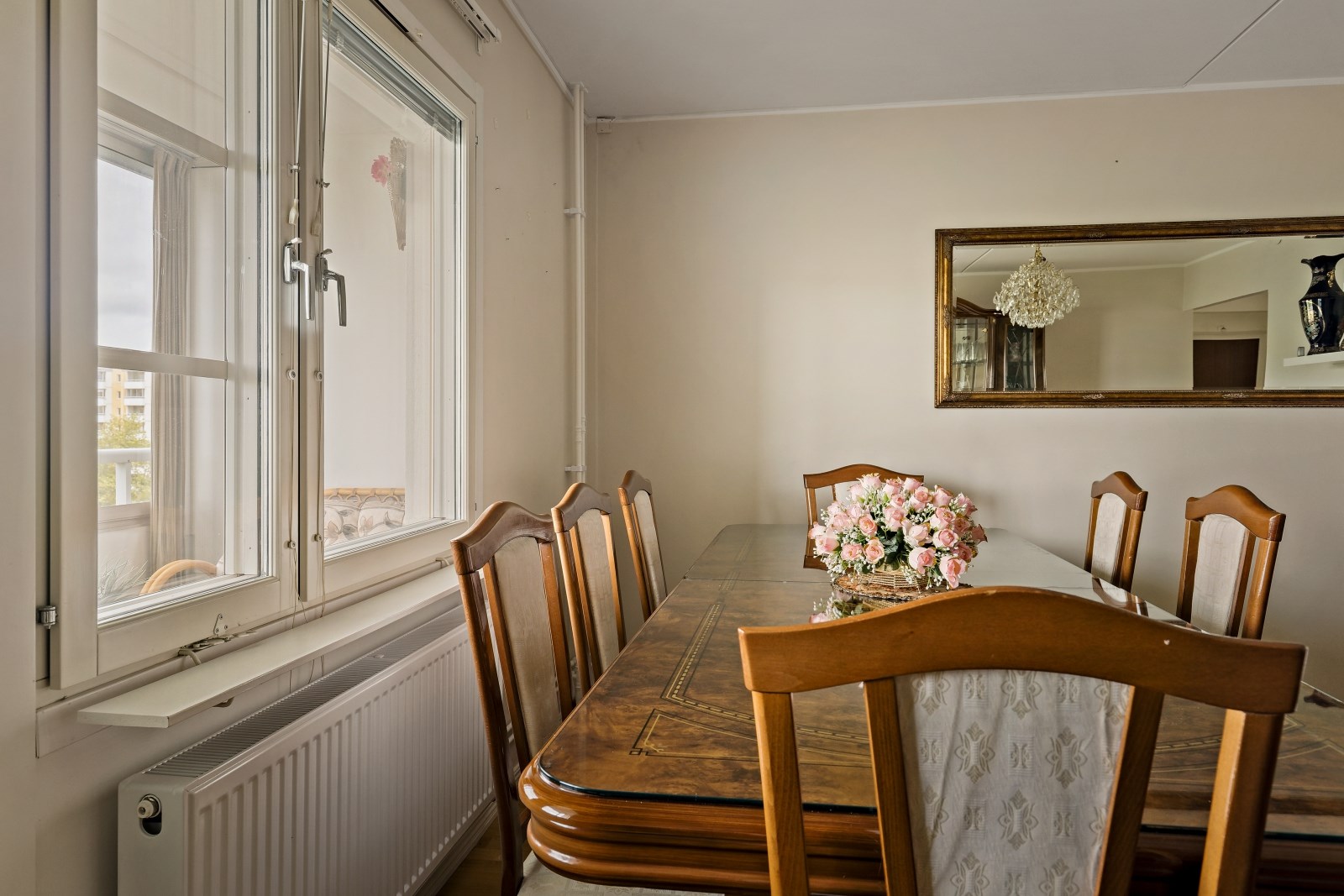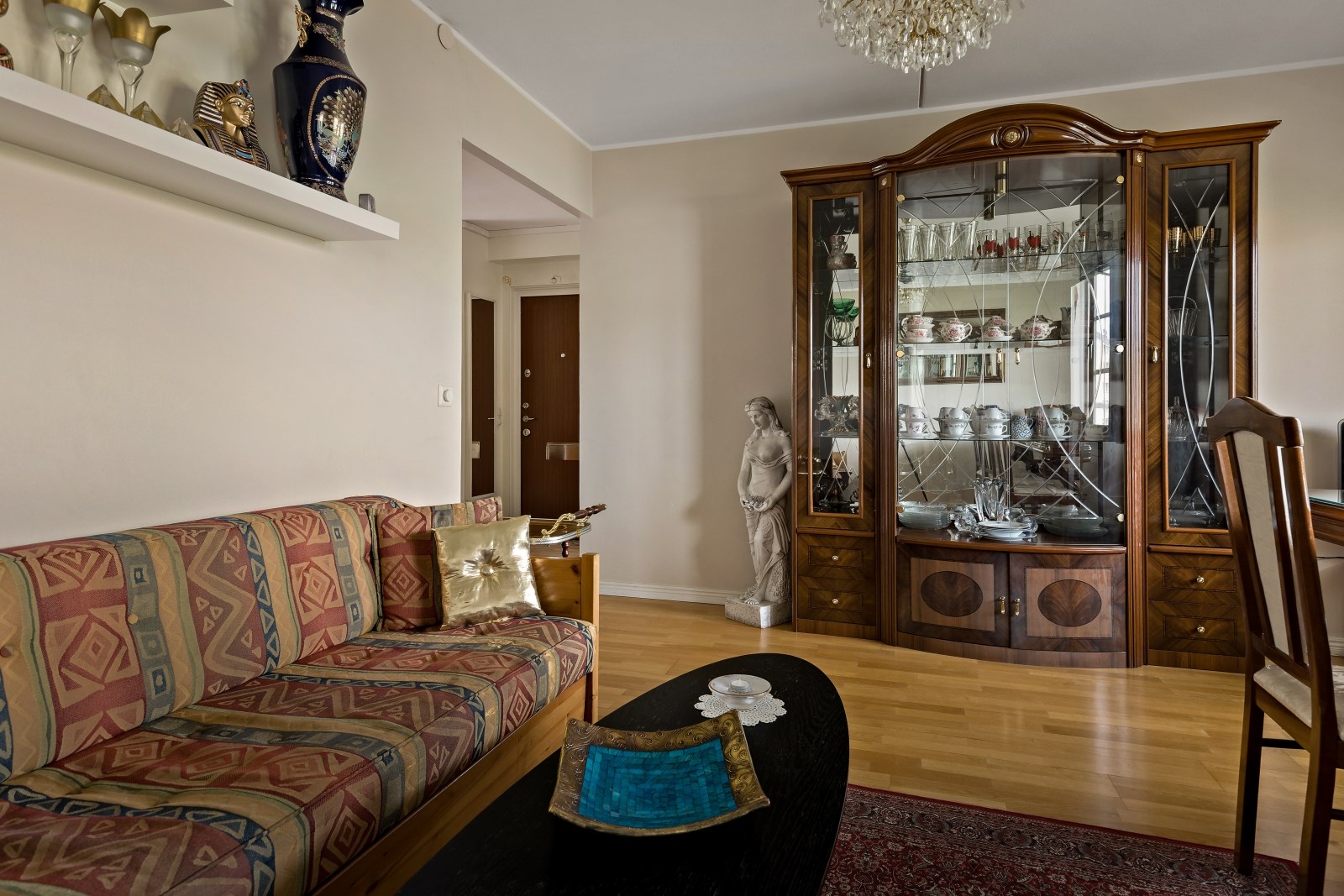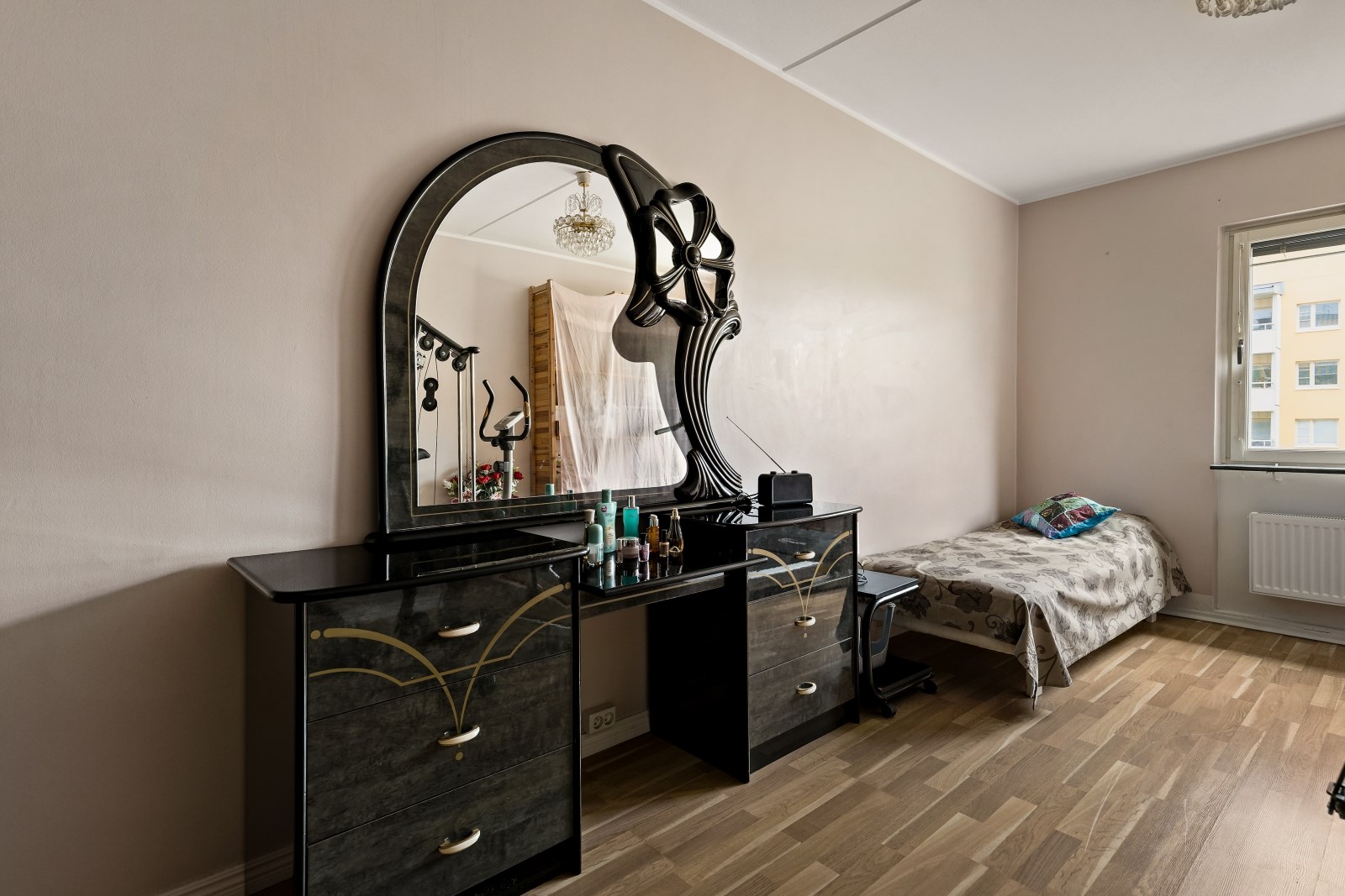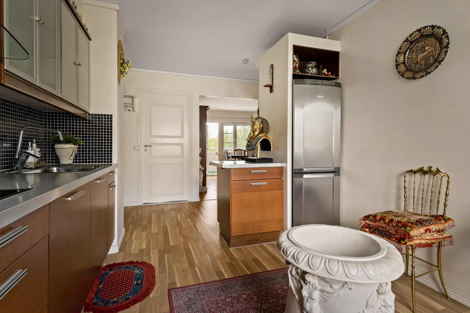 Rymligt och lättmöblerat vardagsrum med parkettgolv och stora fönsterpartier som släpper in härligt ljus. Rummet har gott om plats för möblemang. Från vardagsrummet nås lägenhetens inglasade balkong som bjuder på fin utsikt över omgivningen. Här finns gott om plats att möblera med utemöbler och blommor. Det här kan bli en riktigt mysig plats för avkoppling där de praktiska skjutbara glasdörrarna kan öppnas upp eller stängas till efter säsong. Inglasningen möjliggör också en utökad användning under året.