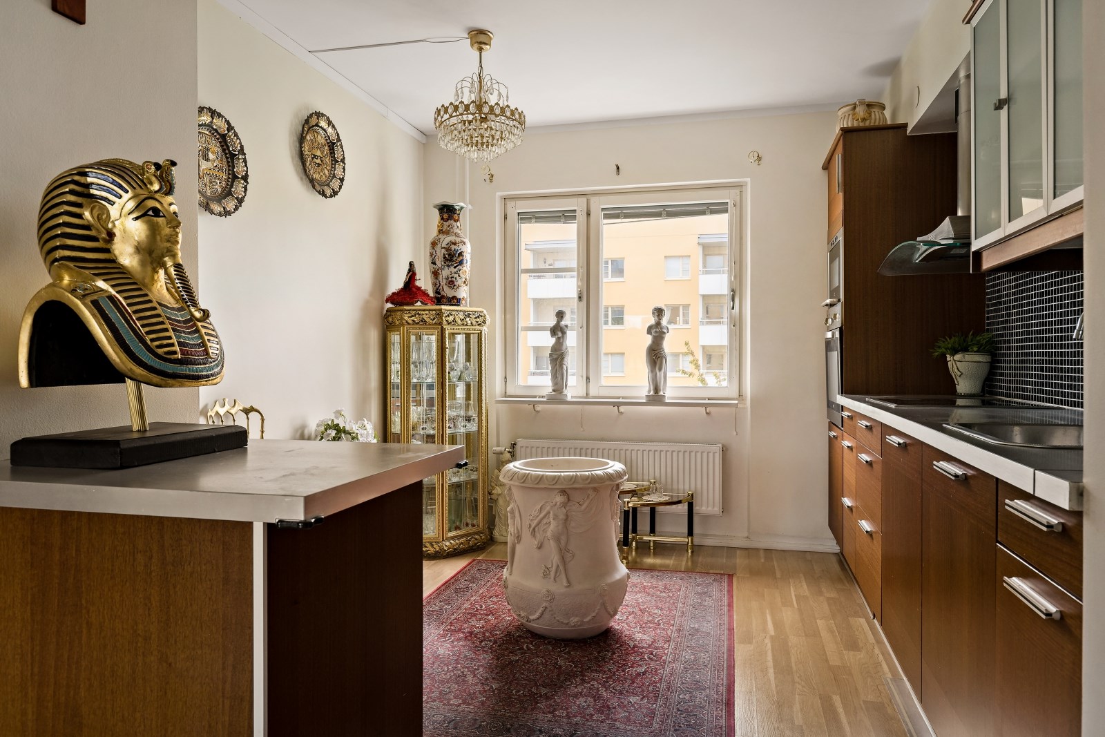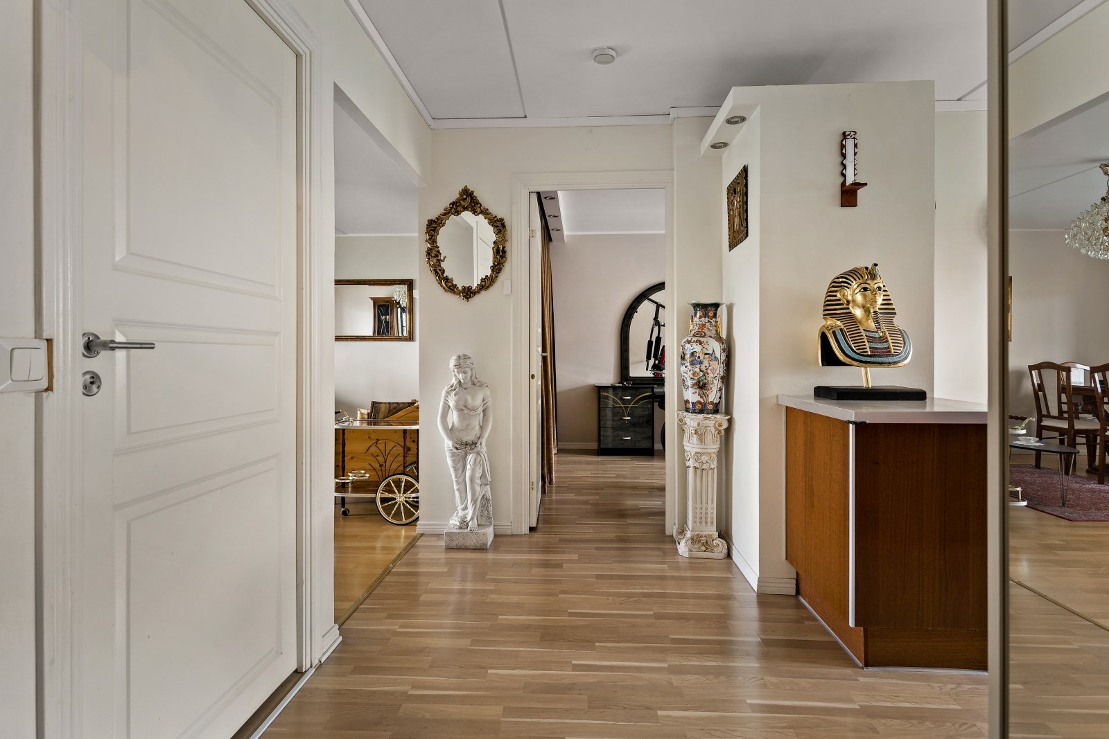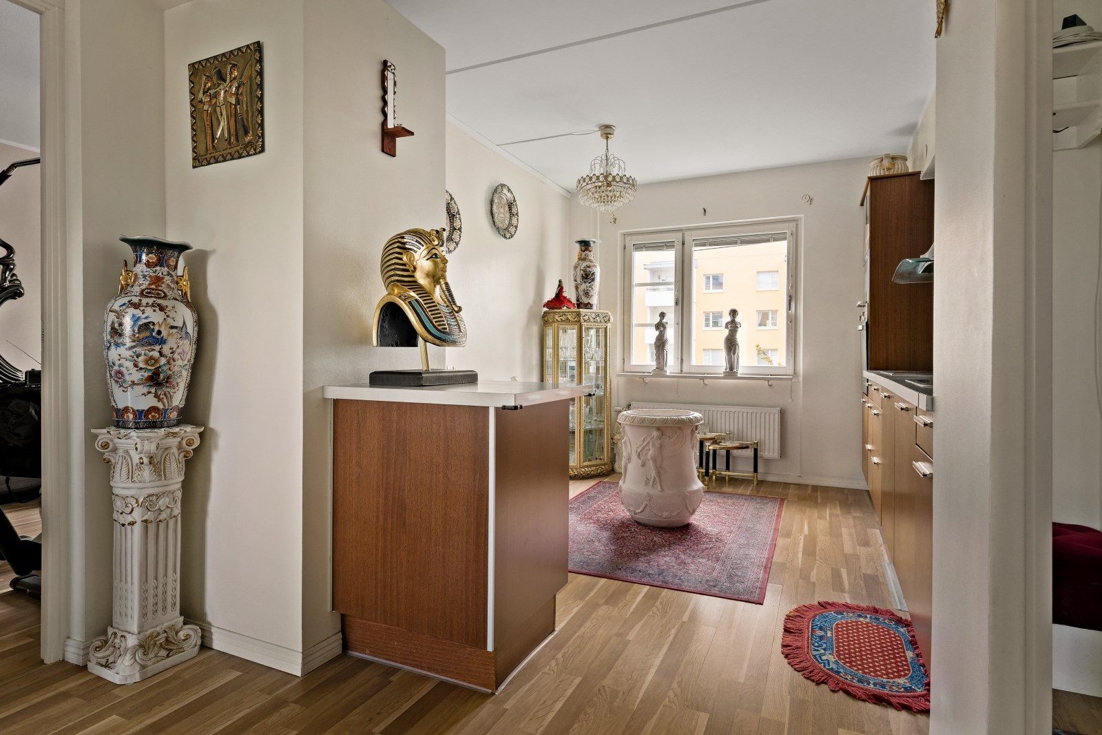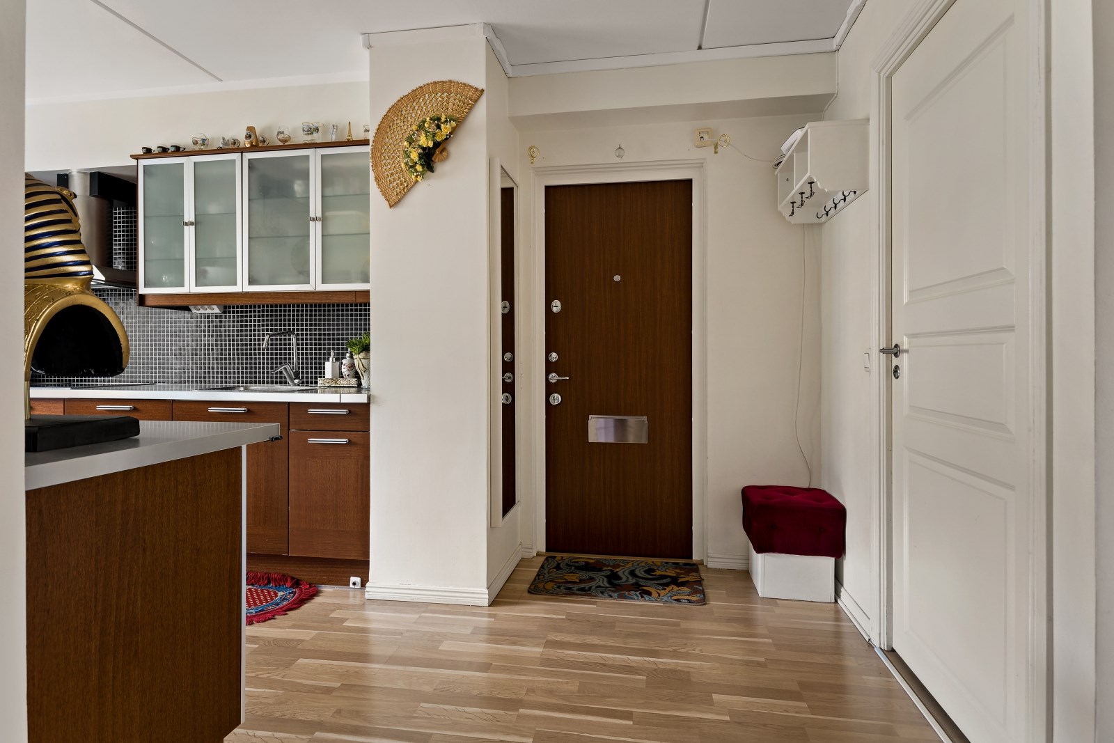 Välkomnande hall med öppen planlösning mot köket. Här finns plats att hänga av kläder och skor strax innanför dörren. På golvet ligger parkett som sträcker sig in till köket samt sovrummet. Lägenheten är utrustad med säkerhetsdörr.