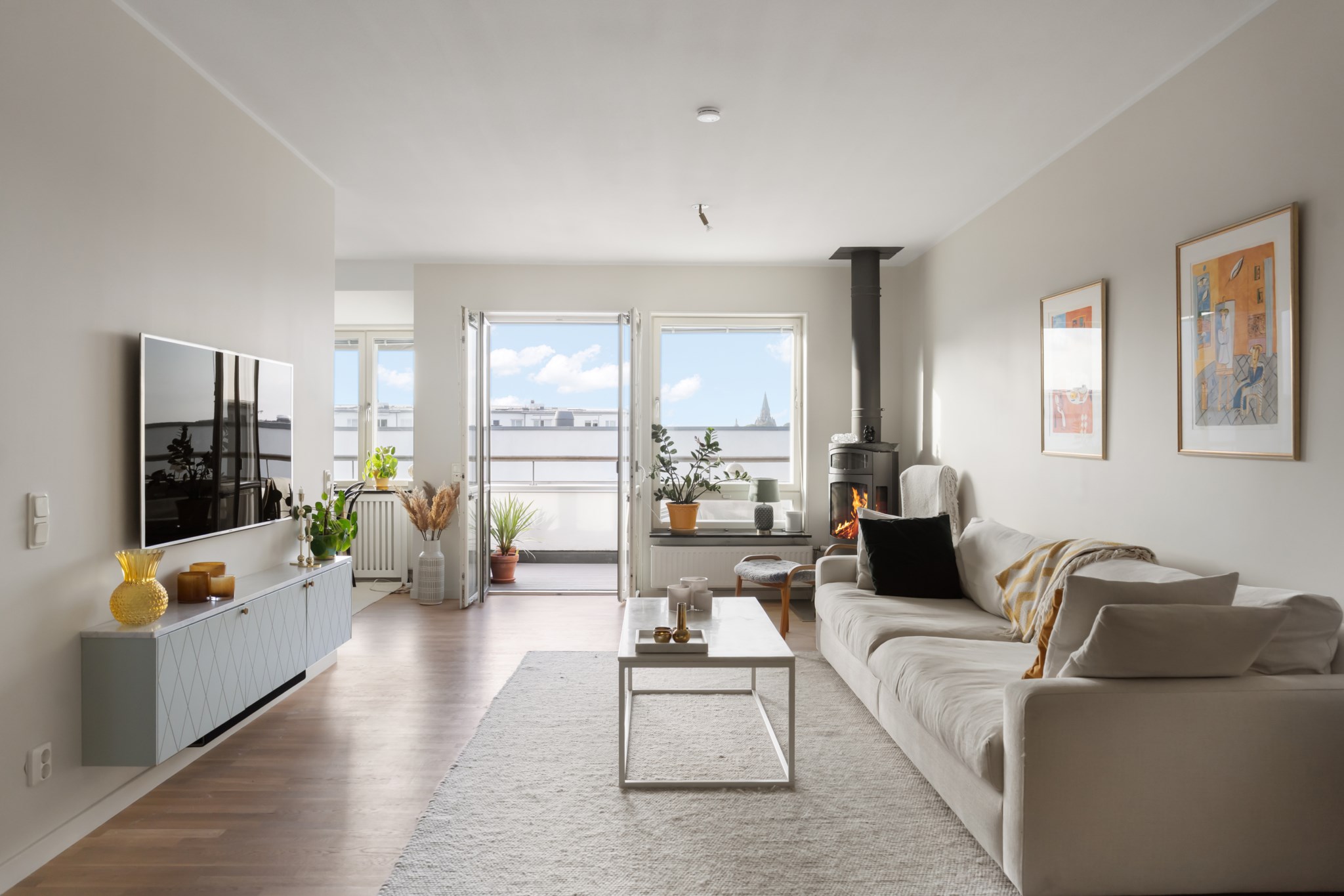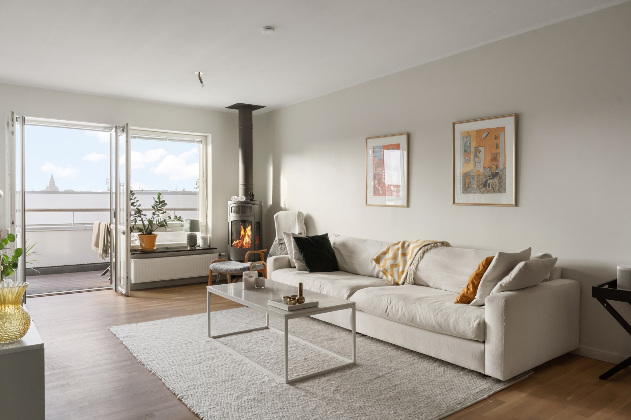 Rymligt och socialt vardagsrum precis lagom avskilt från köket. Härligt ljusinsläpp från stort fönsterparti och helglasade pardörrar mot terrassen. Lättmöblerat med plats för soffgrupp, TV och övrigt möblemang. I hörnet finns en eldstad som värmer upp och tillför mysfaktor under kyligare delen av året. Läget högst upp i huset ger en härlig himmelskontakt och fin utsikt över Sofia Kyrkas torn.