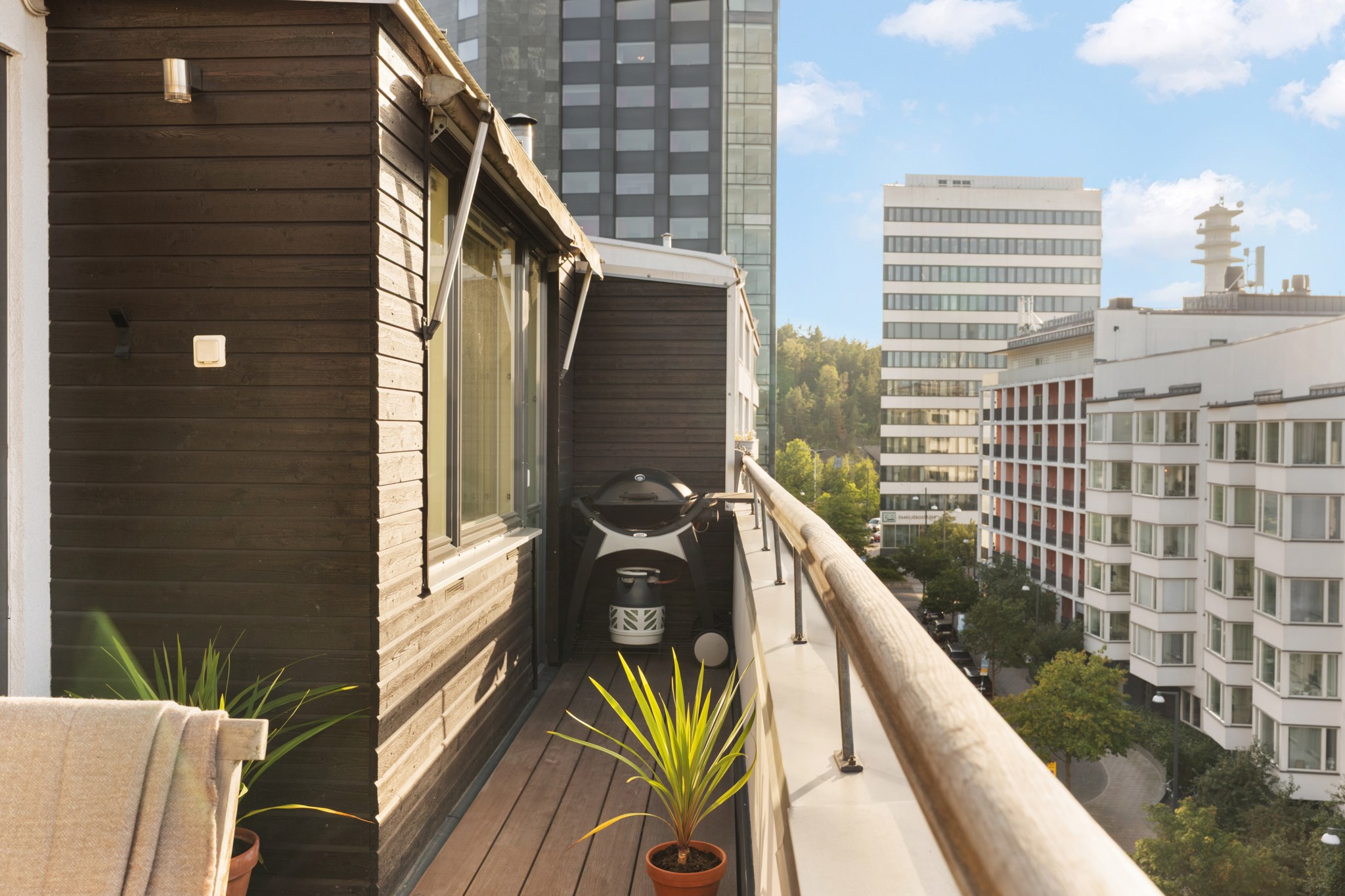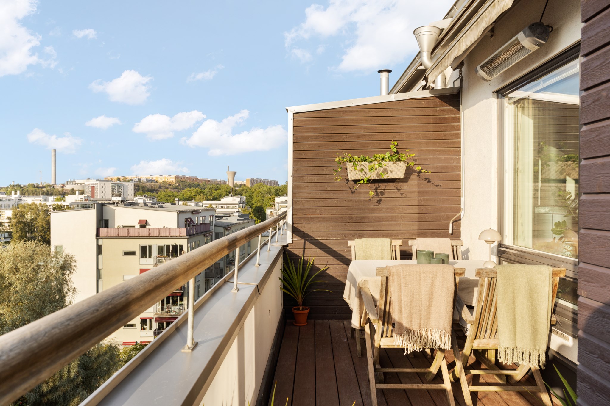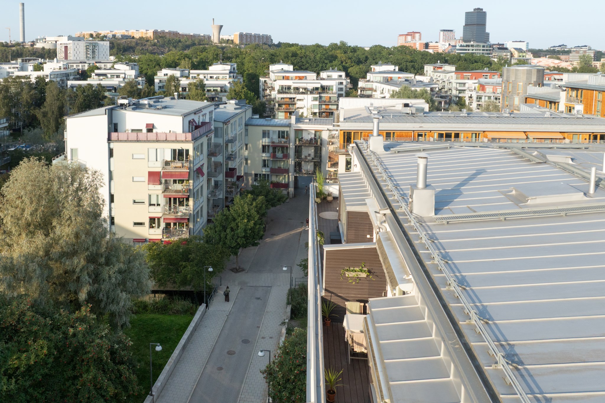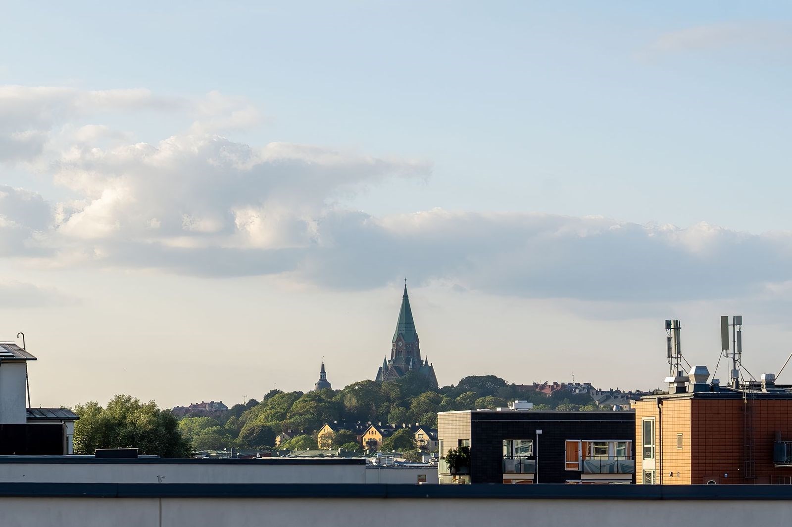 Terrassen ligger i västerläge med härlig eftermiddags- och kvällssol. Det höga läget ger en fin vy över Sofia Kyrka, Fåfängan, takåsar och Sjöstadsparterren. Här ryms både utemöbler, grill och gröna växter.