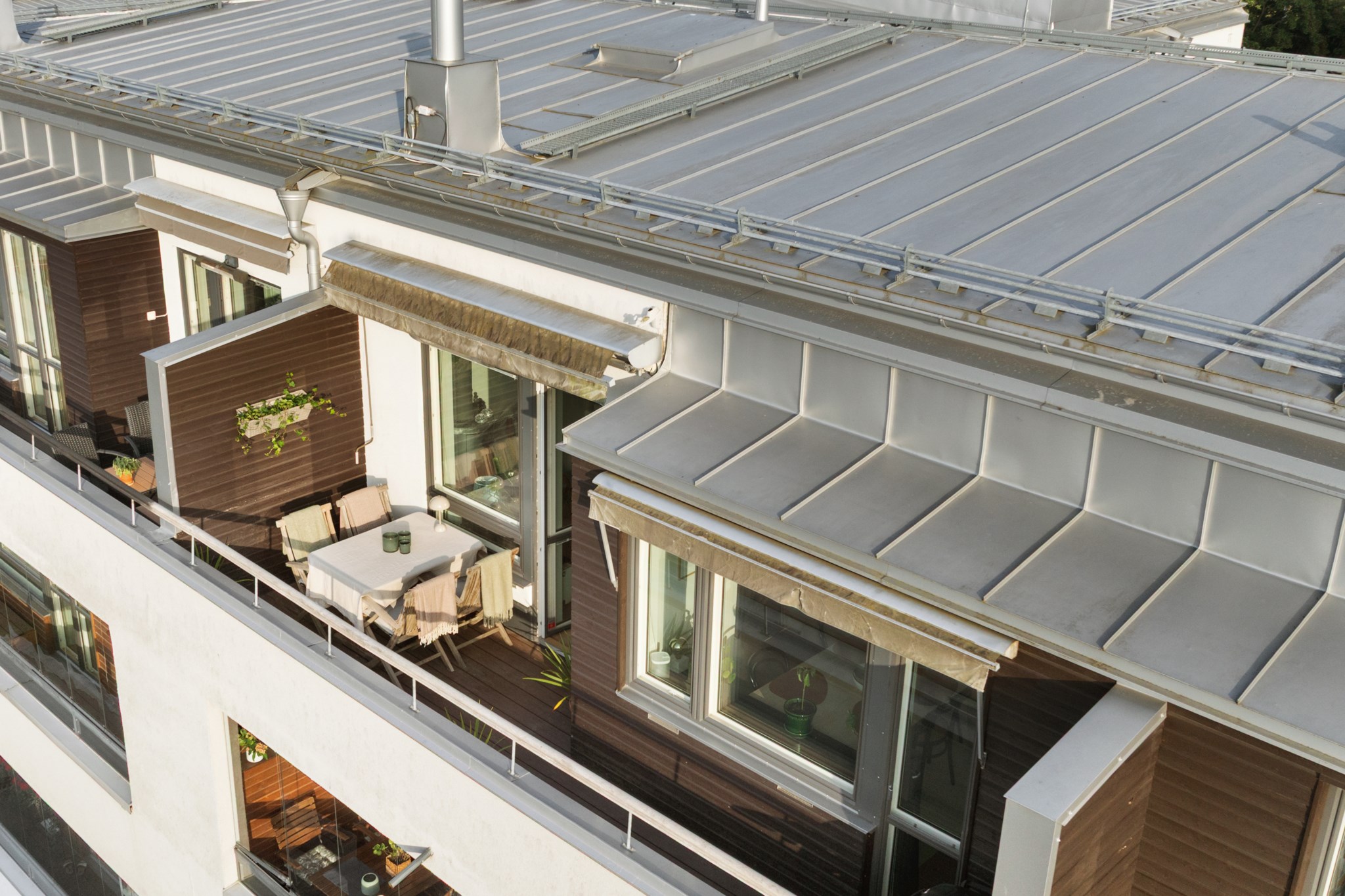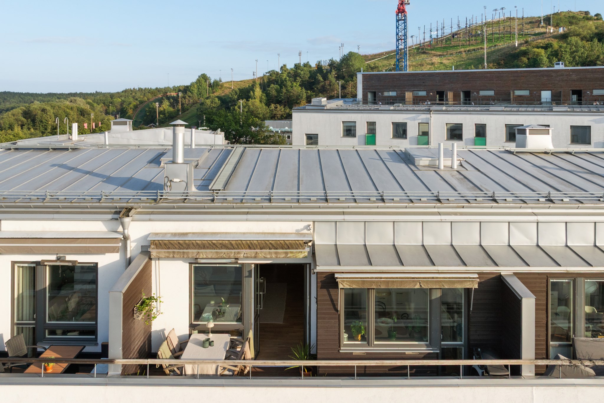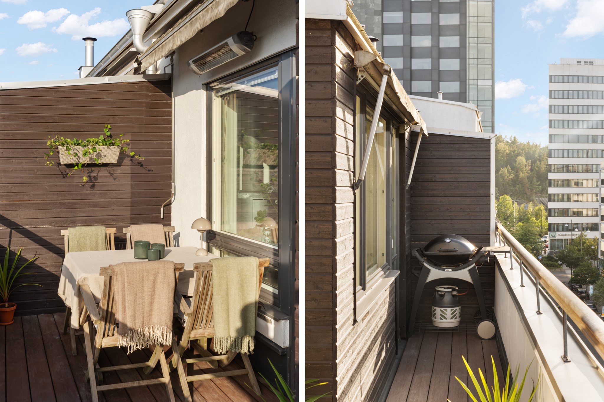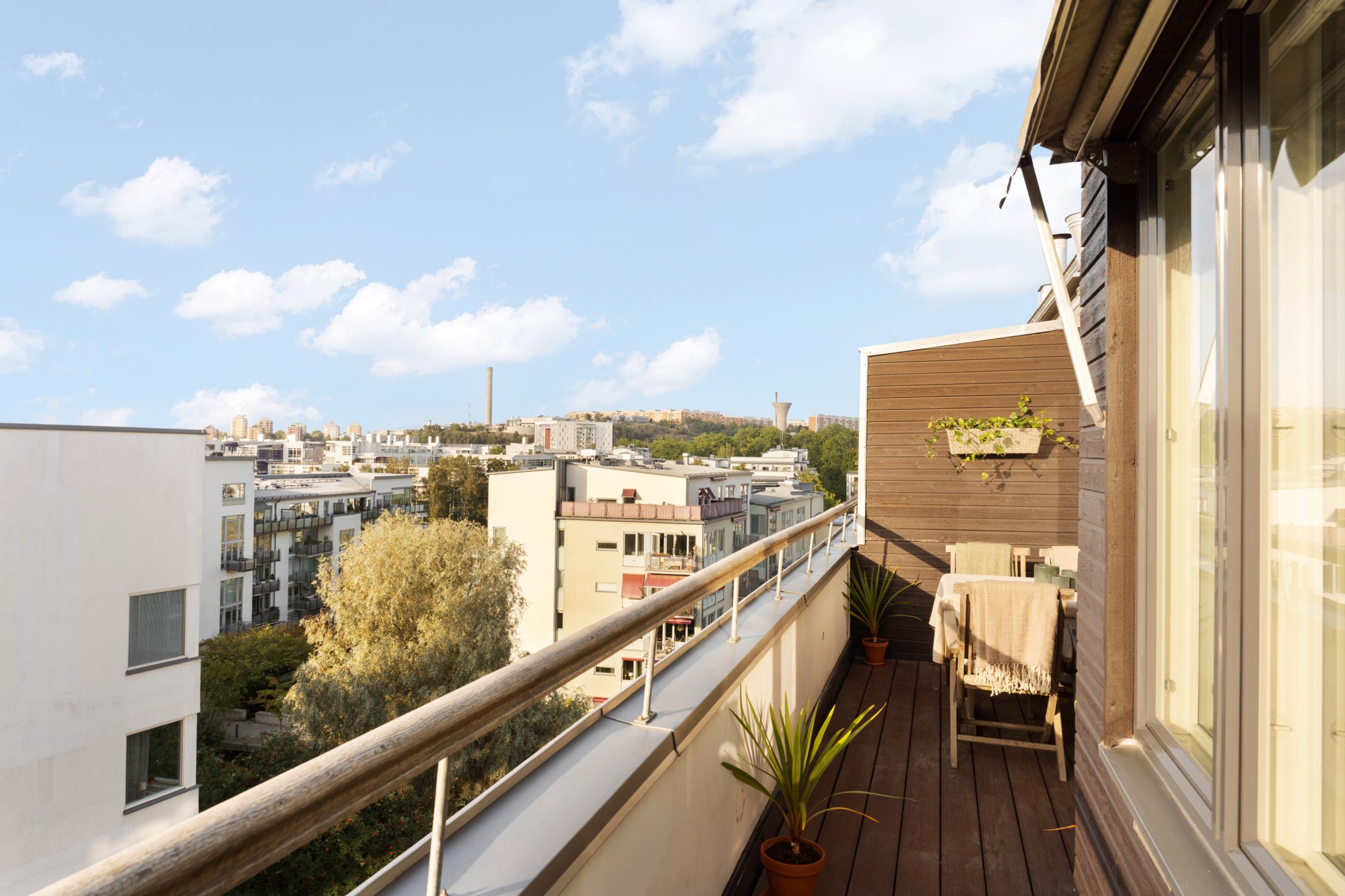 Terrassen ligger i västerläge med härlig eftermiddags- och kvällssol. Det höga läget ger en fin vy över Sofia Kyrka, Fåfängan, takåsar och Sjöstadsparterren. Här ryms både utemöbler, grill och gröna växter.