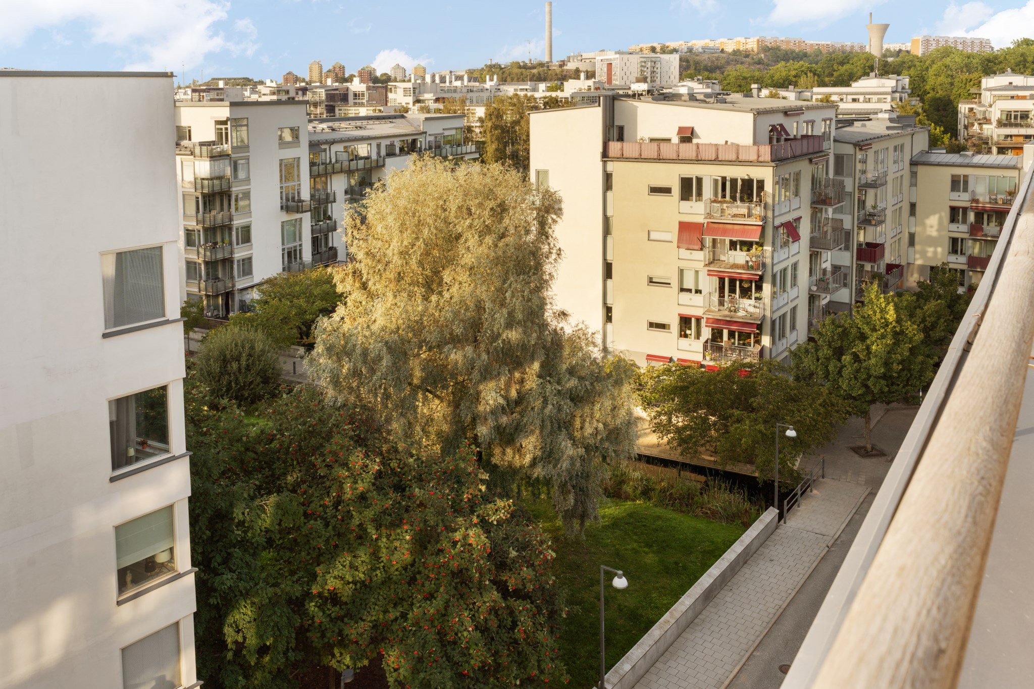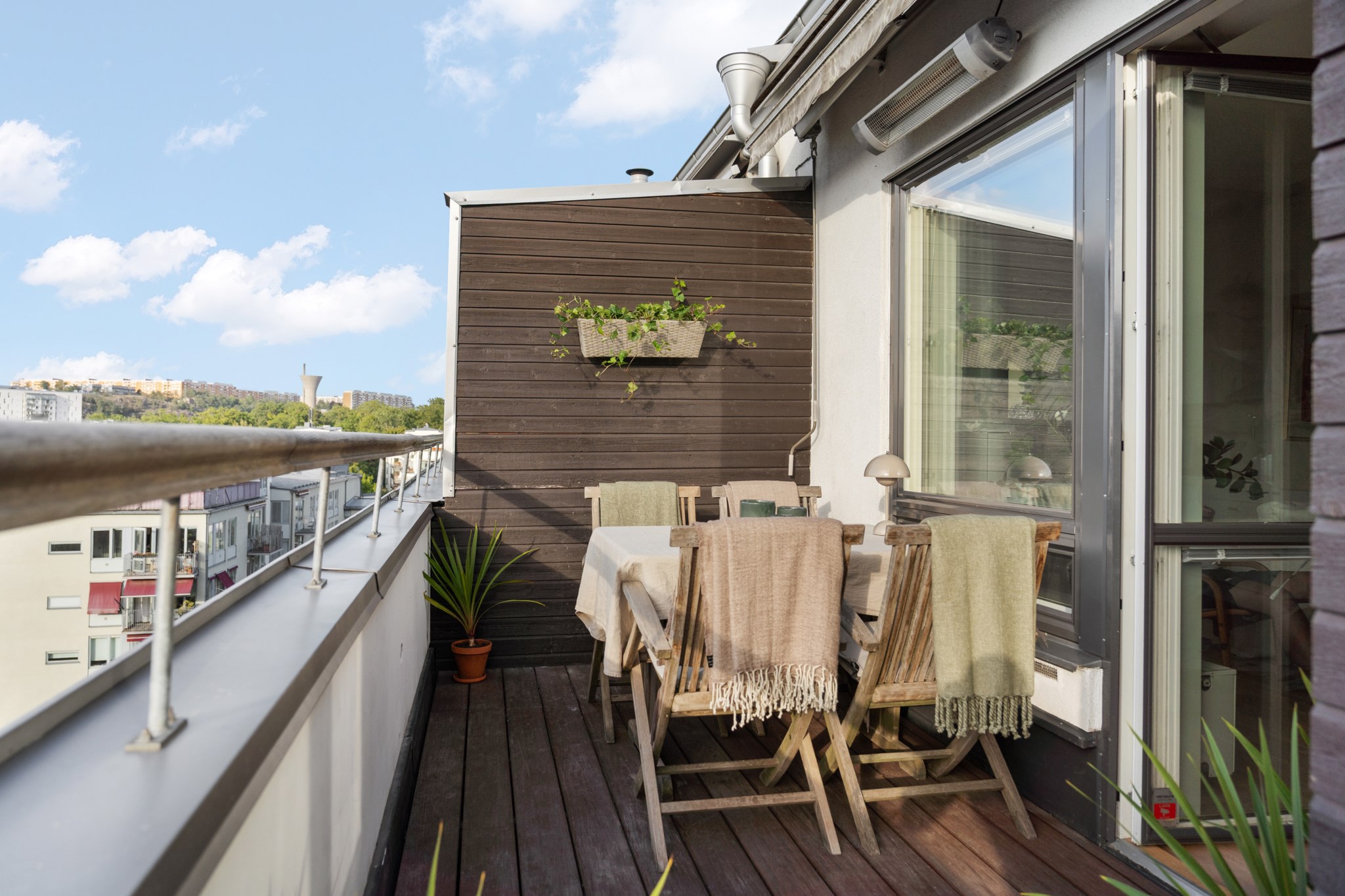 Välkommen till denna välplanerade och funktionella 4:a med både terrass och balkong högst upp i huset. Med terrass i västerläge och balkong i sydostläge kan man koppla av i solen under större delen av dagen. Här har man dessutom en vidsträckt utsikt över bl.a. Fåfängan, toppen av Gröna Lund, Hammarbybacken, Sjöstadsparterren samt tornet av Sofia kyrka på Södermalm. Bostaden har ett trevligt samspel mellan ute- och innemiljö med utgång till terrass eller balkong från samtliga rum. Den genomgående planlösningen samt generösa fönsterpartier bidrar till ett härligt ljusinsläpp i bostaden. Planlösning med rymliga sociala ytor, tre ordentliga sovrum och smarta förvaringslösningar. Eldstad i vardagsrummet förser bostaden med extra mysfaktor. Rymligt familjebadrum samt extra gäst-wc underlättar familjebestyren. Det vackra parkettgolvet i ek är ljust och nyligen slipat.